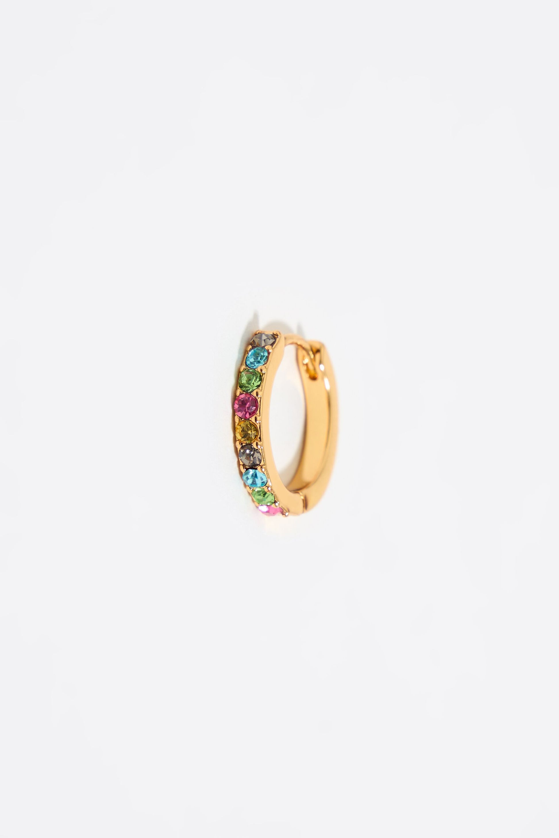 Golden metal earrings with multicolored crystals. Model with hook clasp. Customized with engraved logo.