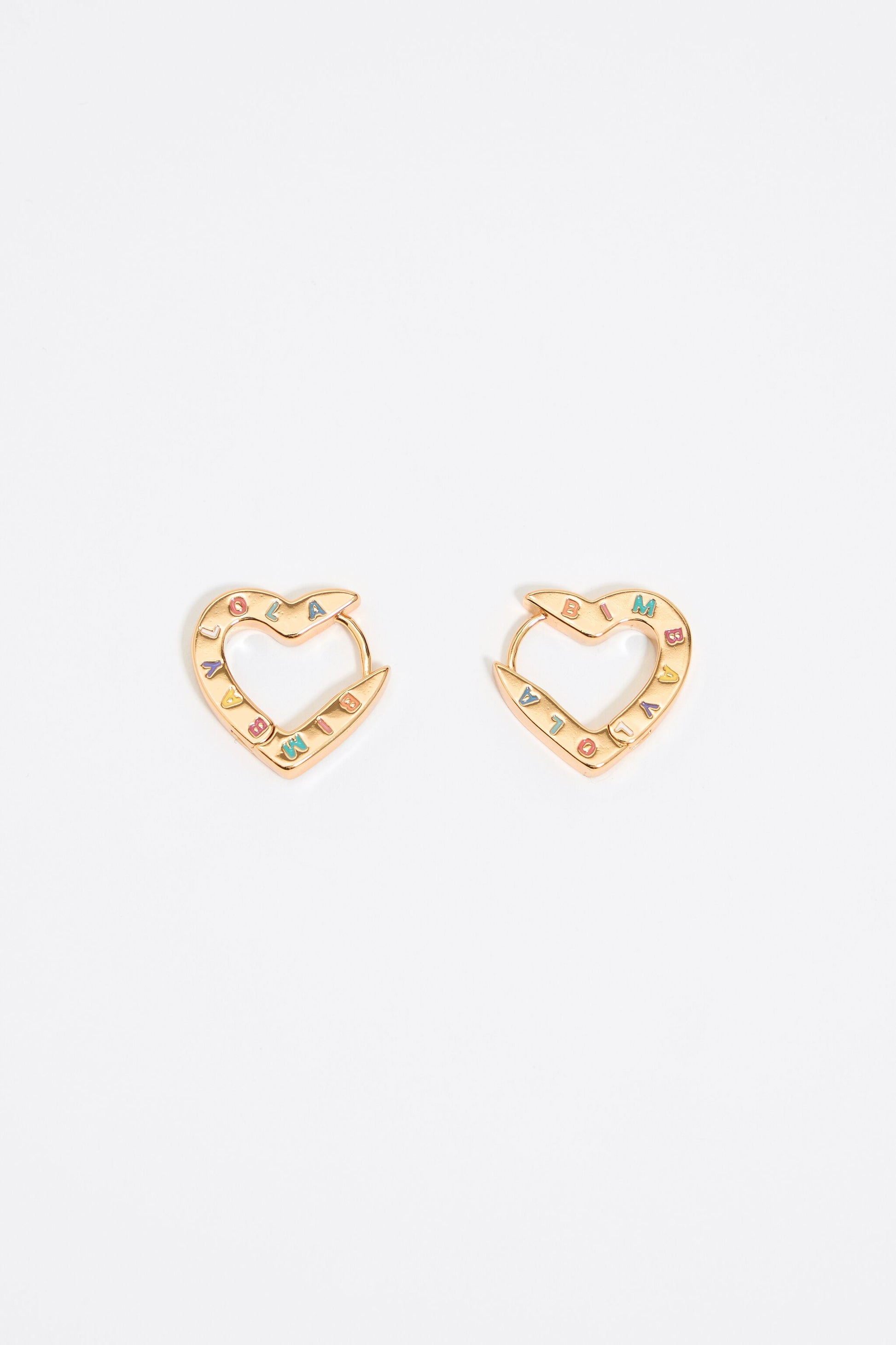 Gold tone metal hoop earrings with multicolor logo and heart. Model customized with engraved logo.