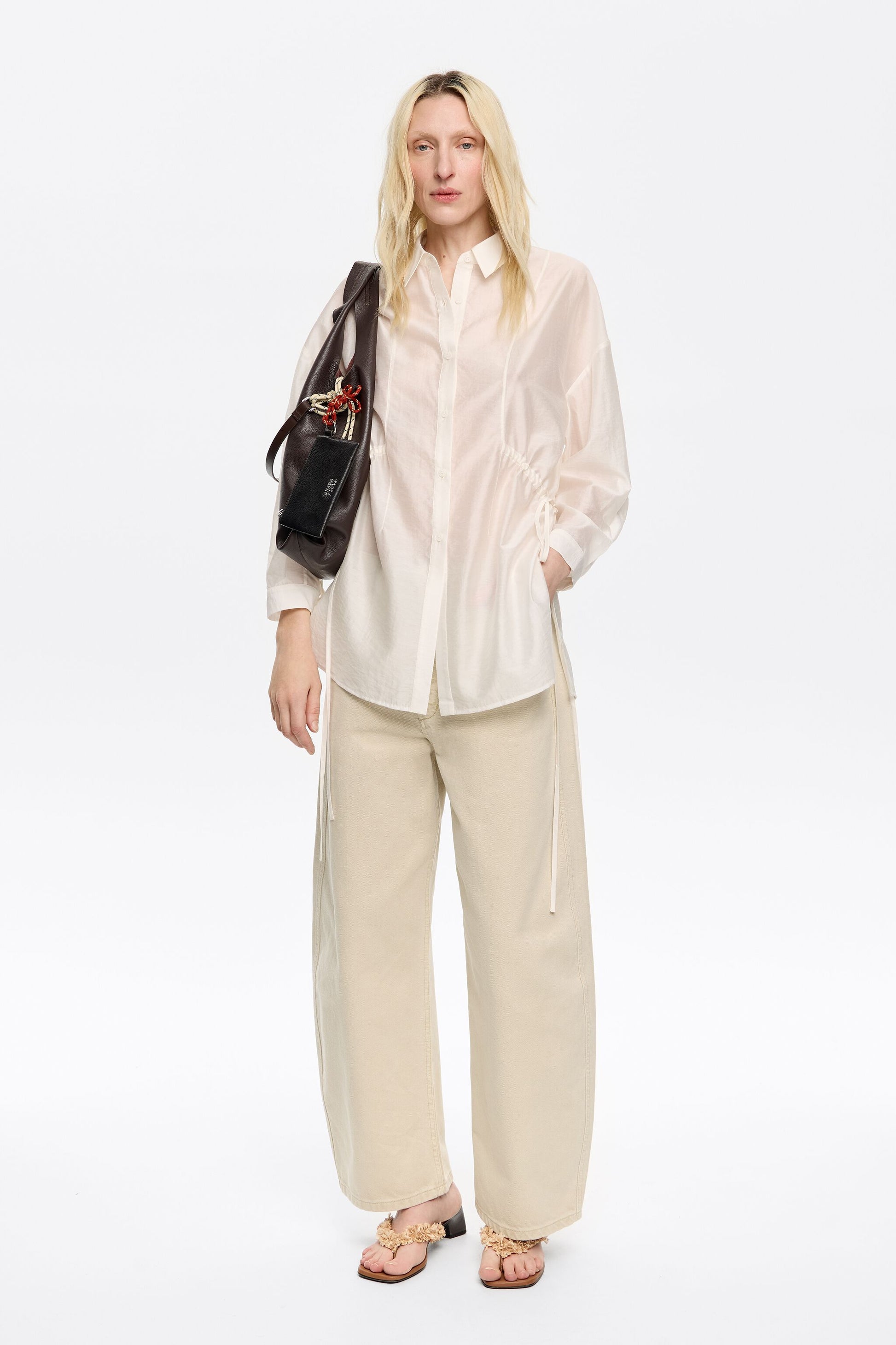 Shirt in ivory. With fitted waist, shirt collar, long sleeve with buttoned cuff and button-up front. Casing with adjustable fabric straps.