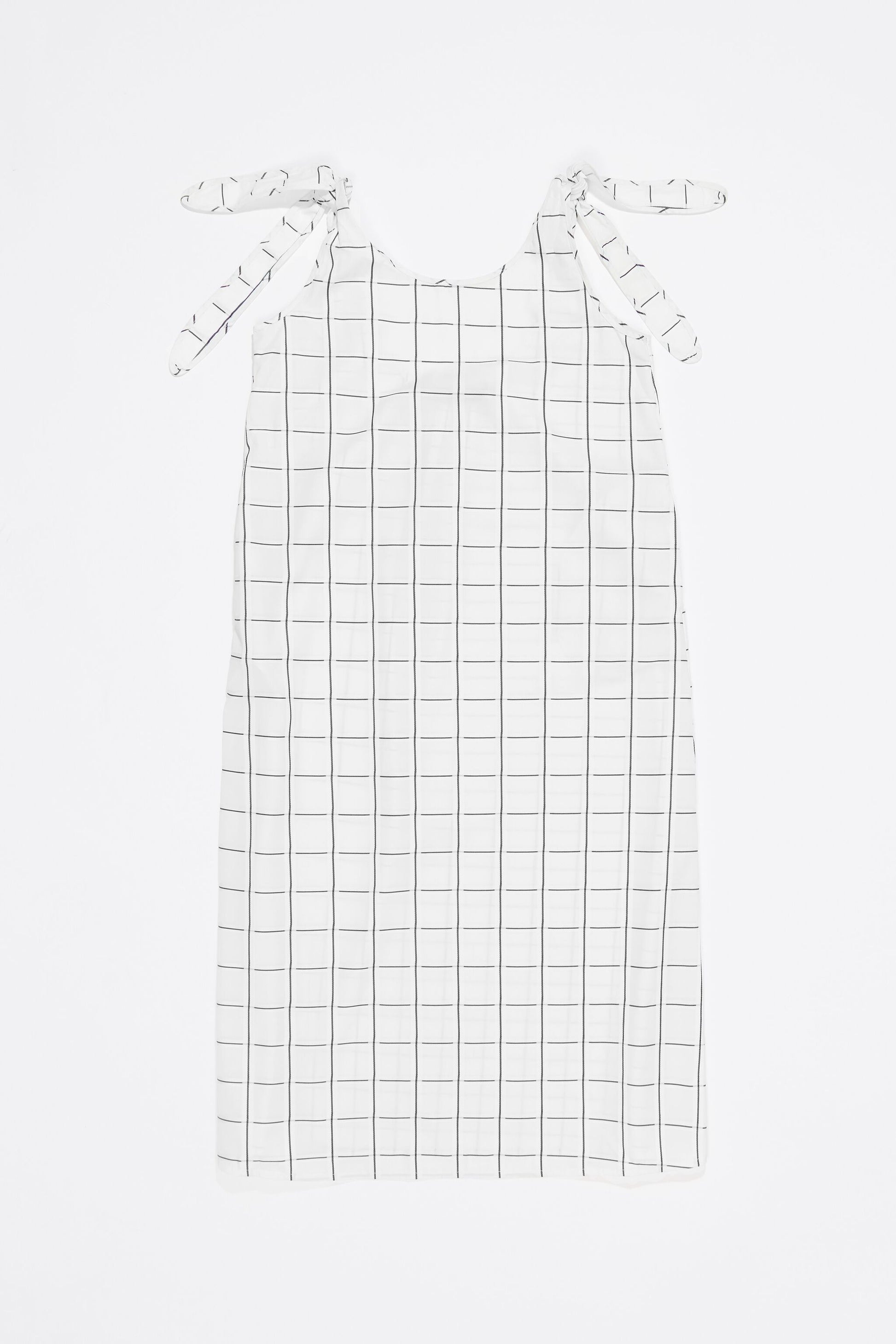 Checked print dress in ivory. A-line cut with scoop neckline, scoop back and tie straps.