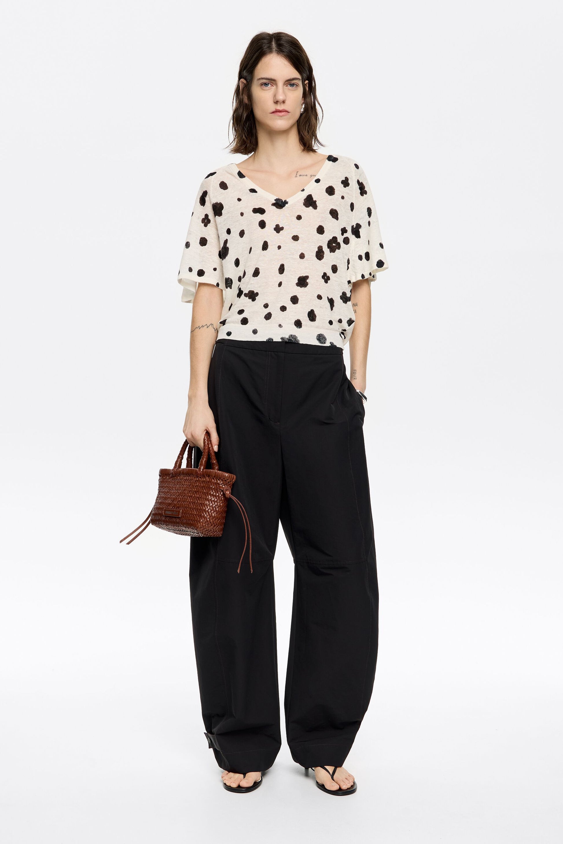 Linen sweater in ivory with Graindots print. With fitted waist, V-neck and short batwing sleeve.