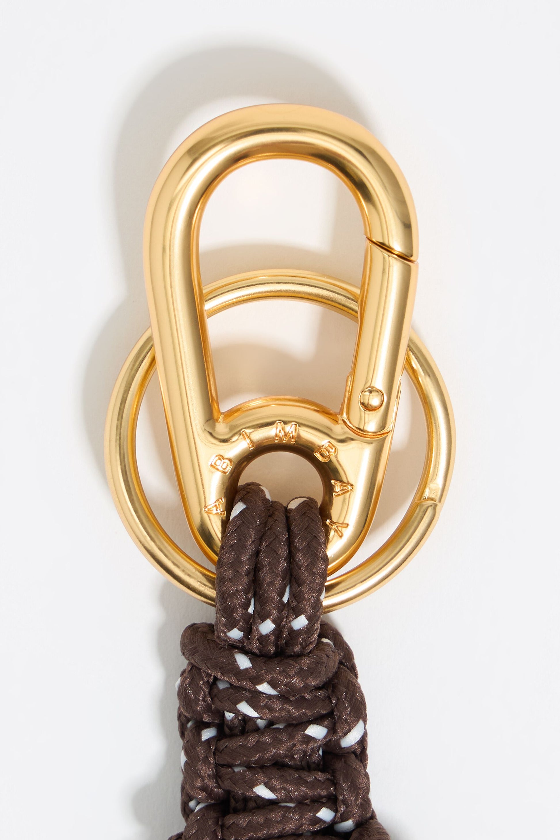 Gold tone metal key ring with heart in an ivory color and ropes in green. Model customized with engraved logo.
