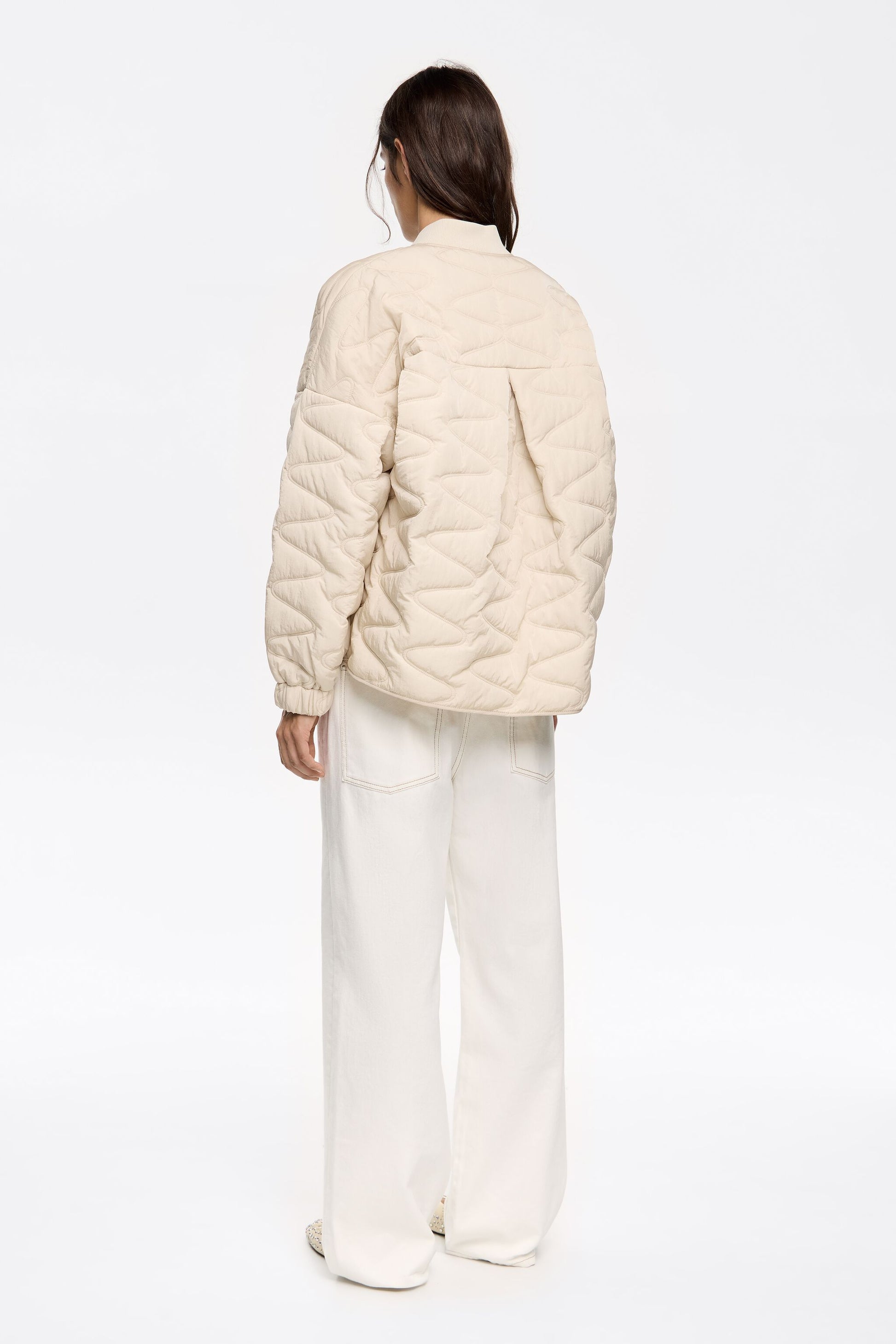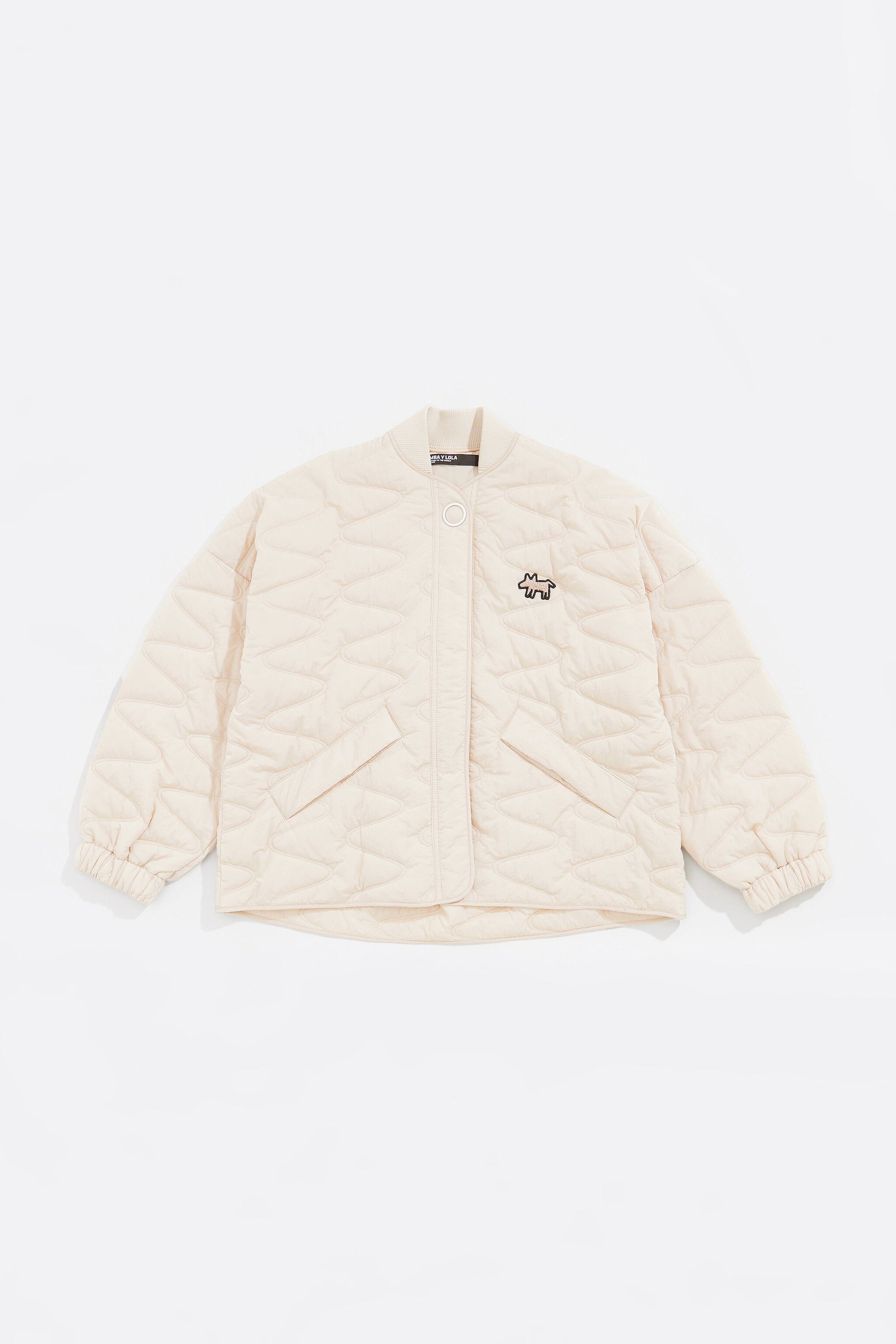 Short technical fabric jacket in ivory. A-line, high neck in knit, long sleeves with gathered cuffs and snap button-up front. Welt pockets and customized exterior patch. This model contains 37% Recycled polyamide + 90% Recycled polyester filling.