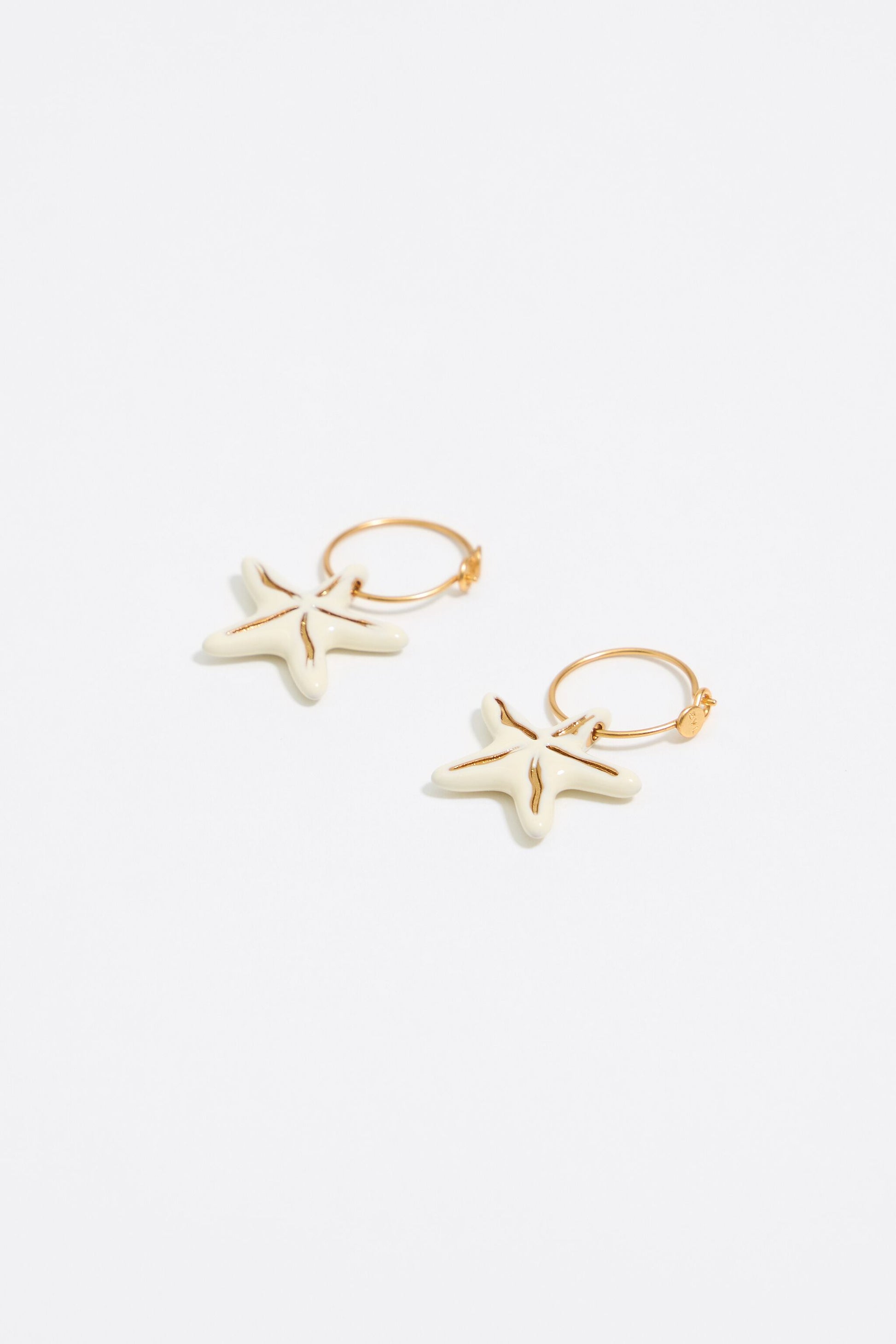 Gold-tone metal hoop earrings with stars in an ivory color. Model customized with engraved logo.