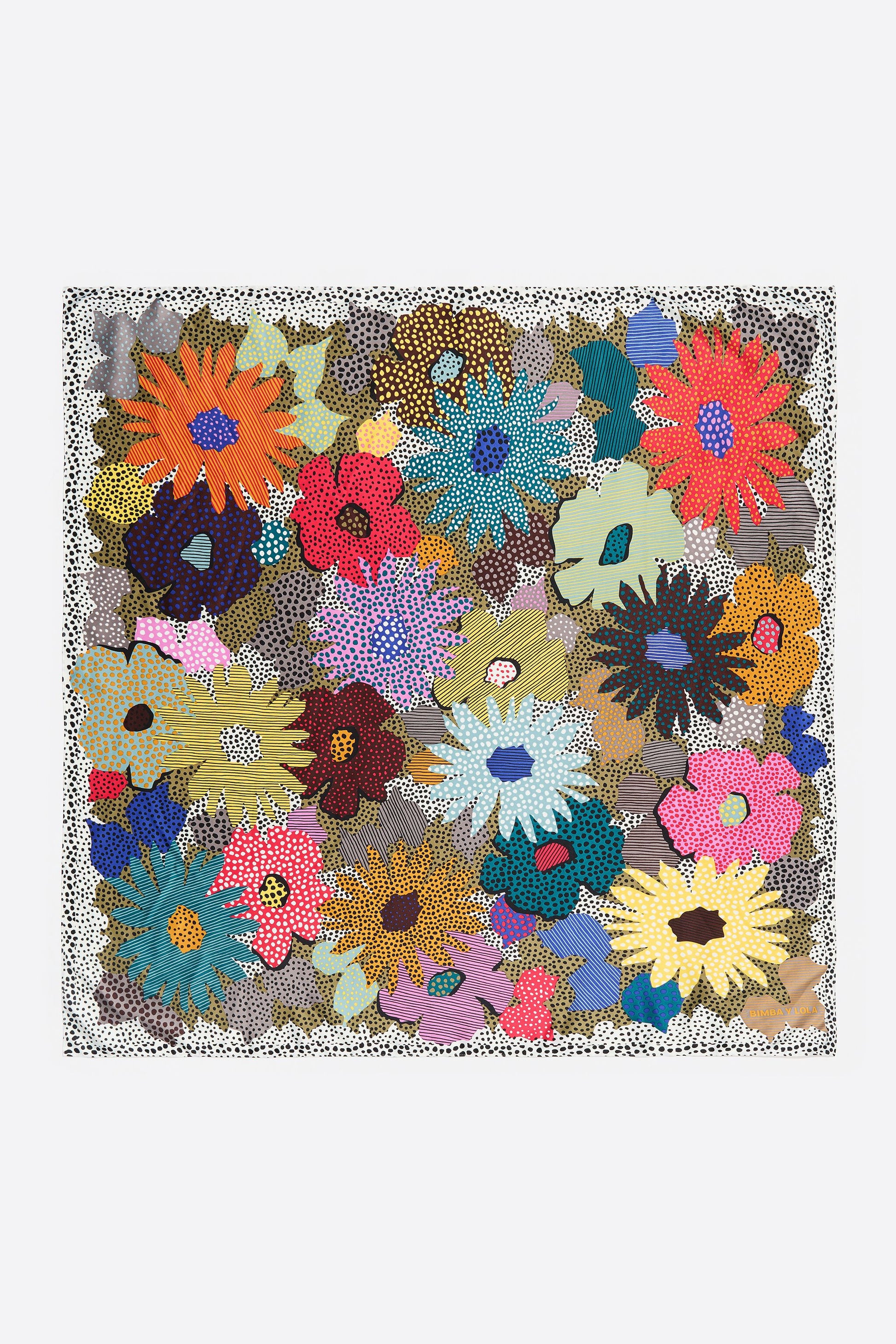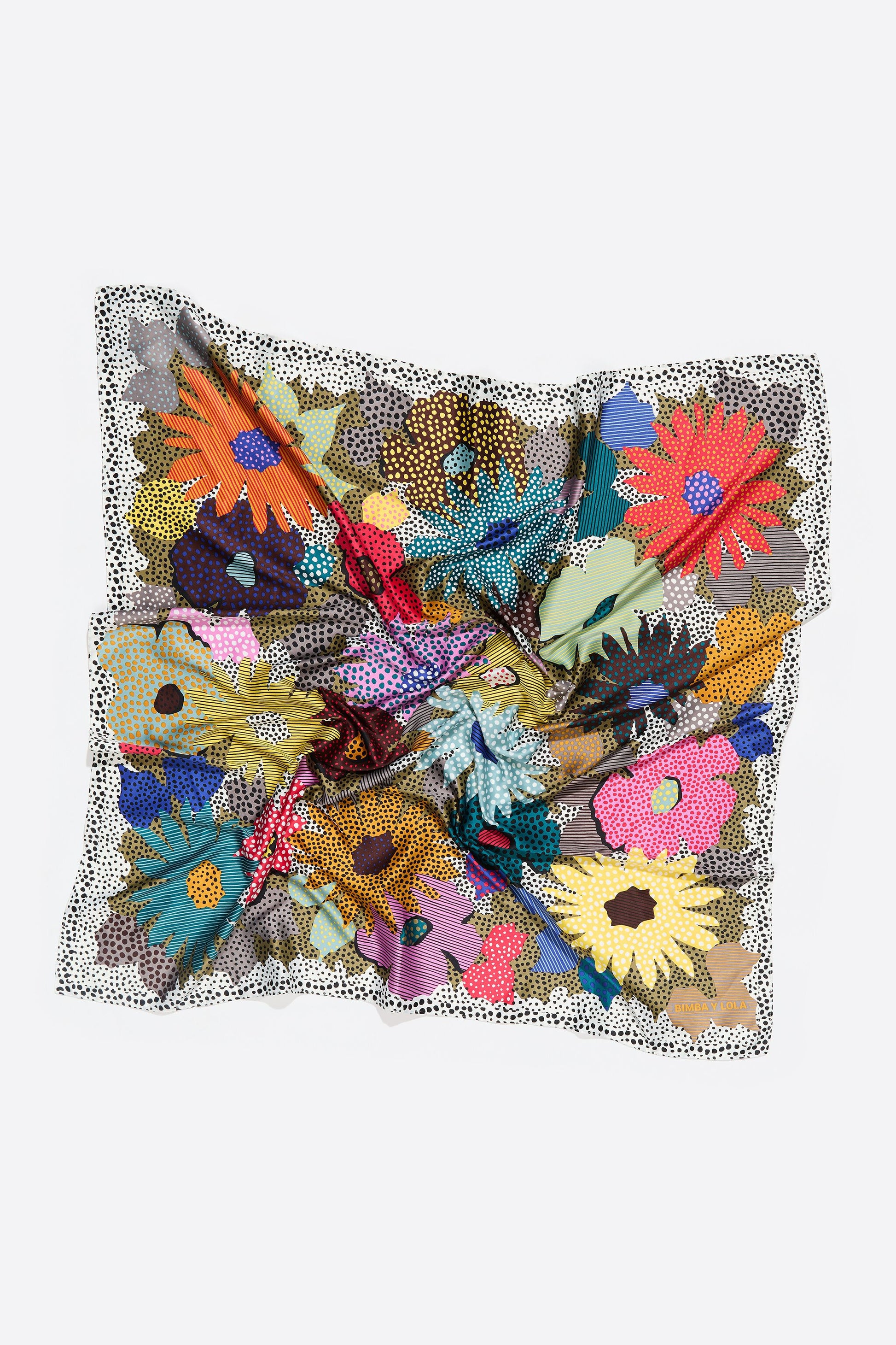 Scarf with flowers, dots and striped prints on a khaki background. 100% Recycled polyester.