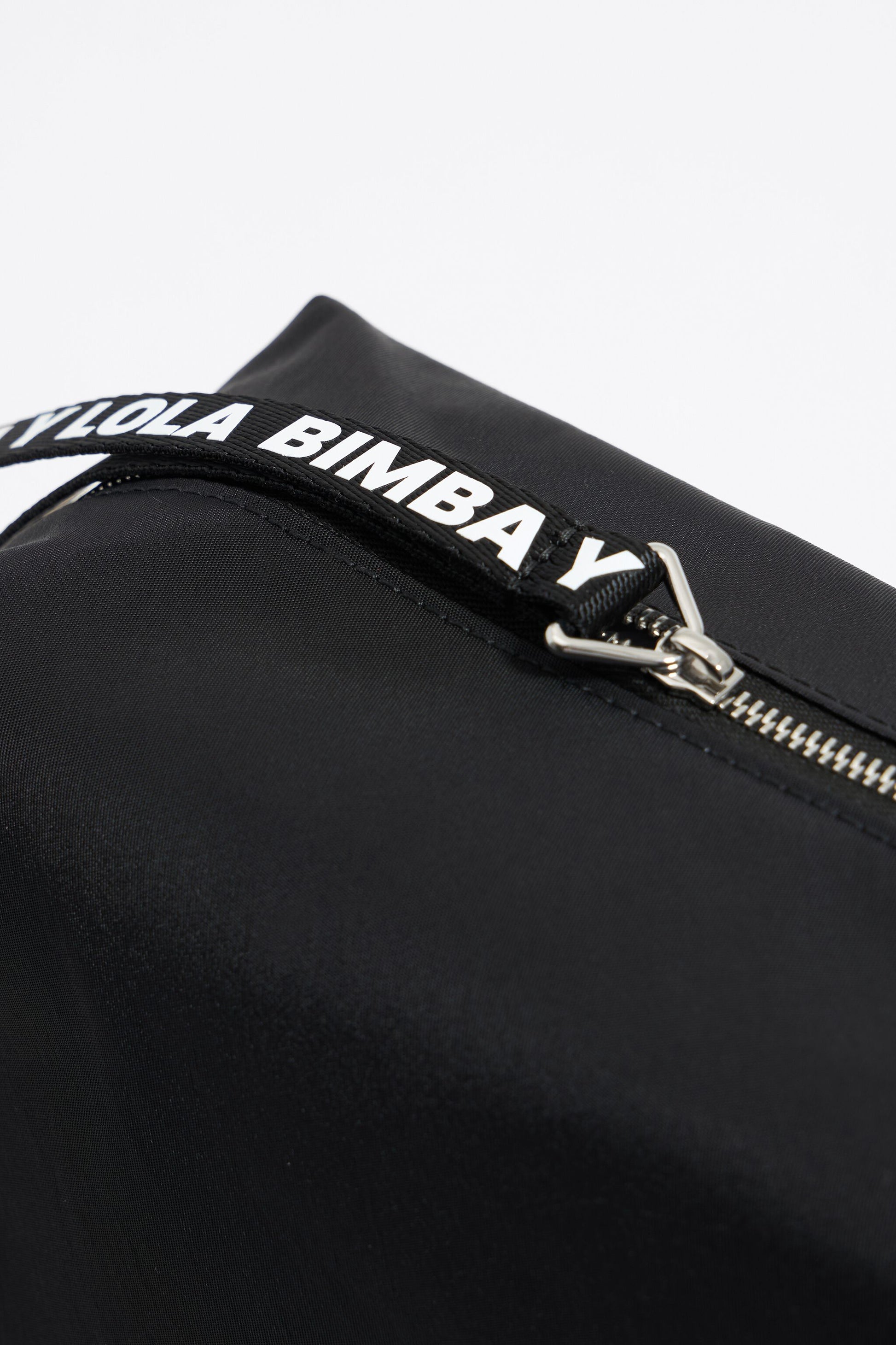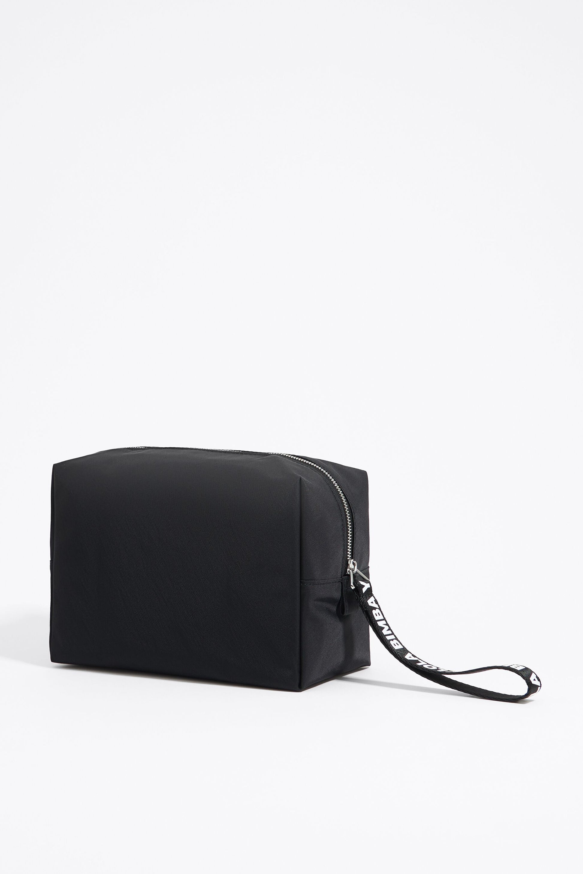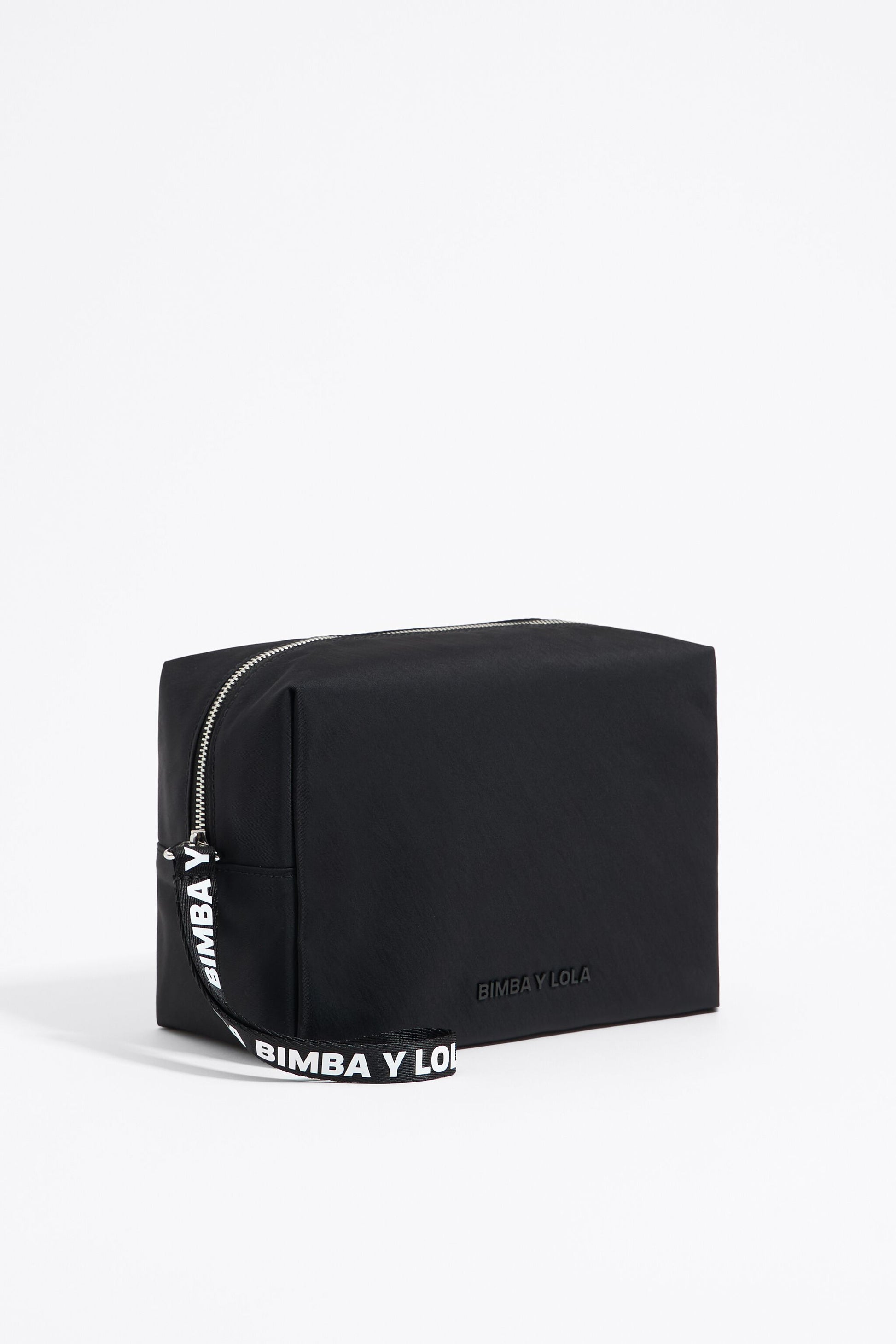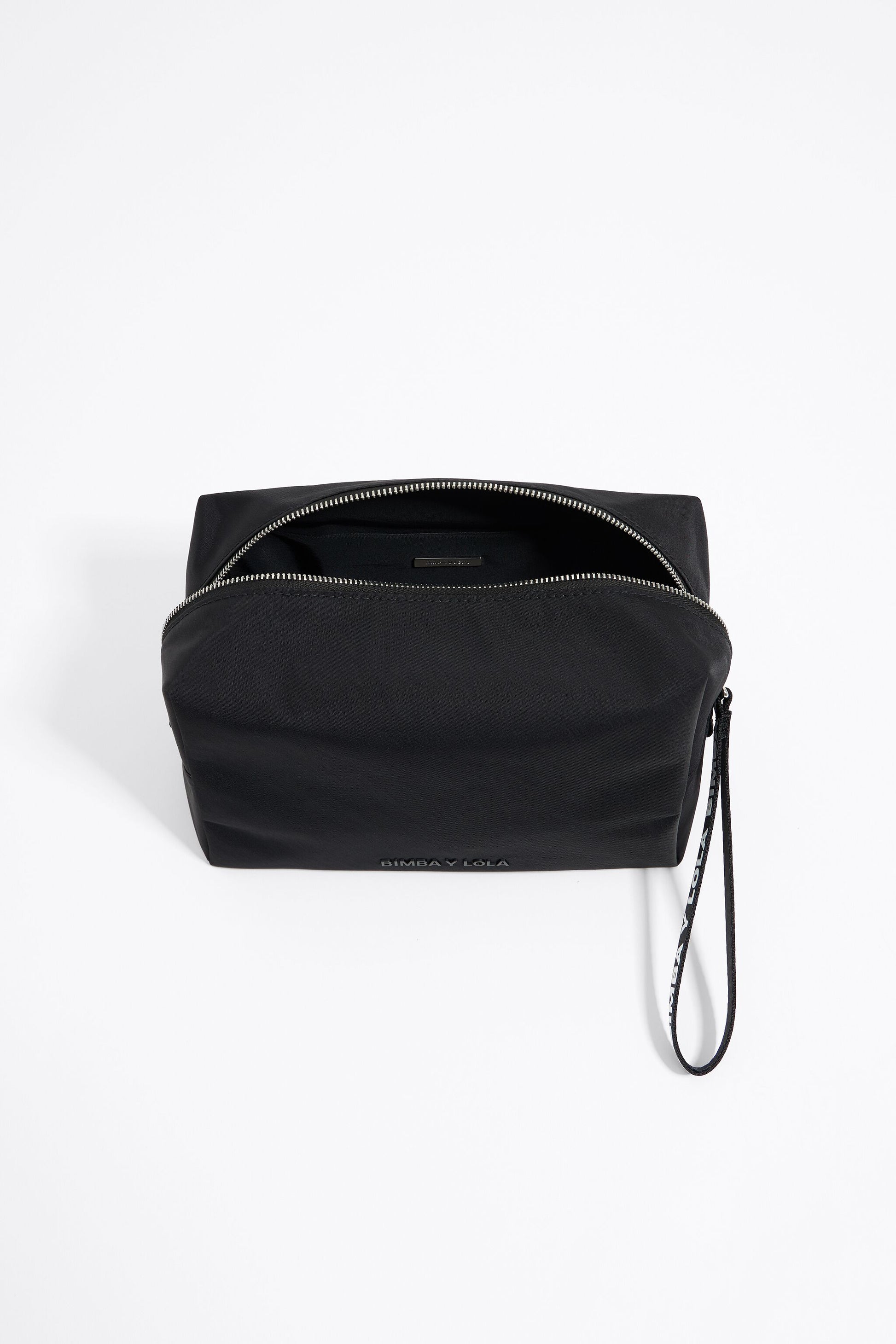 Nylon make-up case in black. Large model with zip fastener, logo fabric strap and interior pocket. Exterior customized with metallic logo.