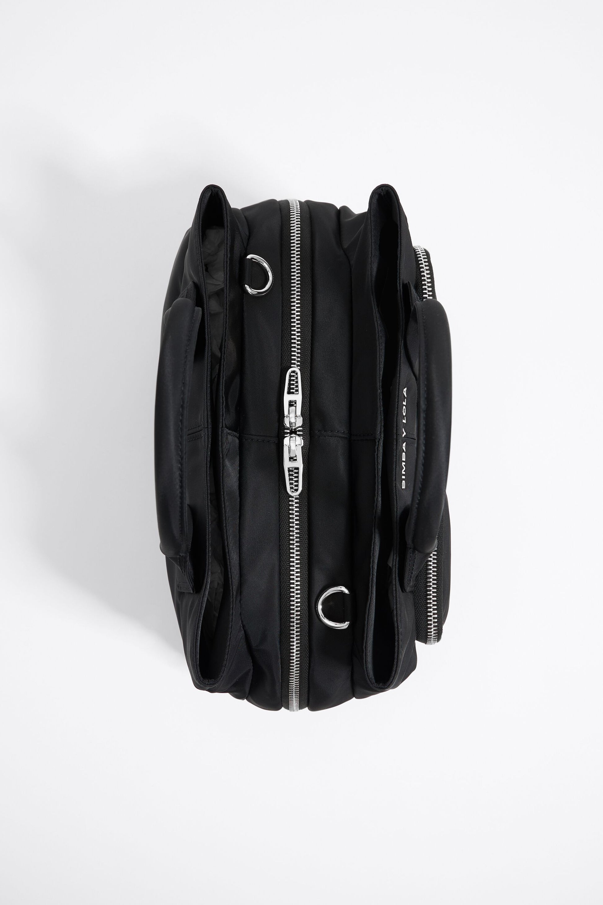 Washed nylon Pocket handbag in black. Large model with magnetic and zip fasteners, handle and logo fabric strap, interior pocket and leather pieces. Exterior customized with metallic logo.