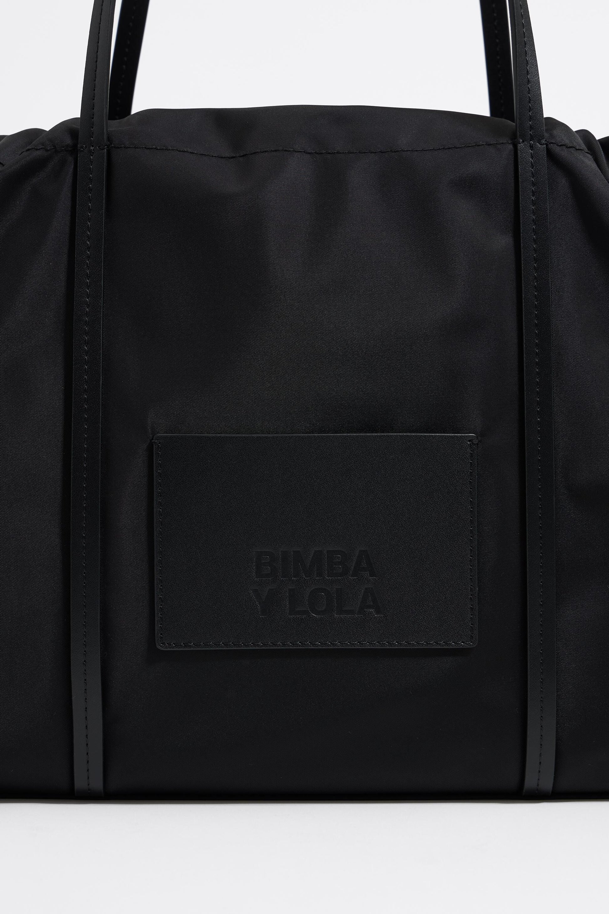 Nylon shopper bag in black. Large model, adjustable laces, leather strap and zip, leather handles, and interior pocket. Exterior customized with engraved leather logo.