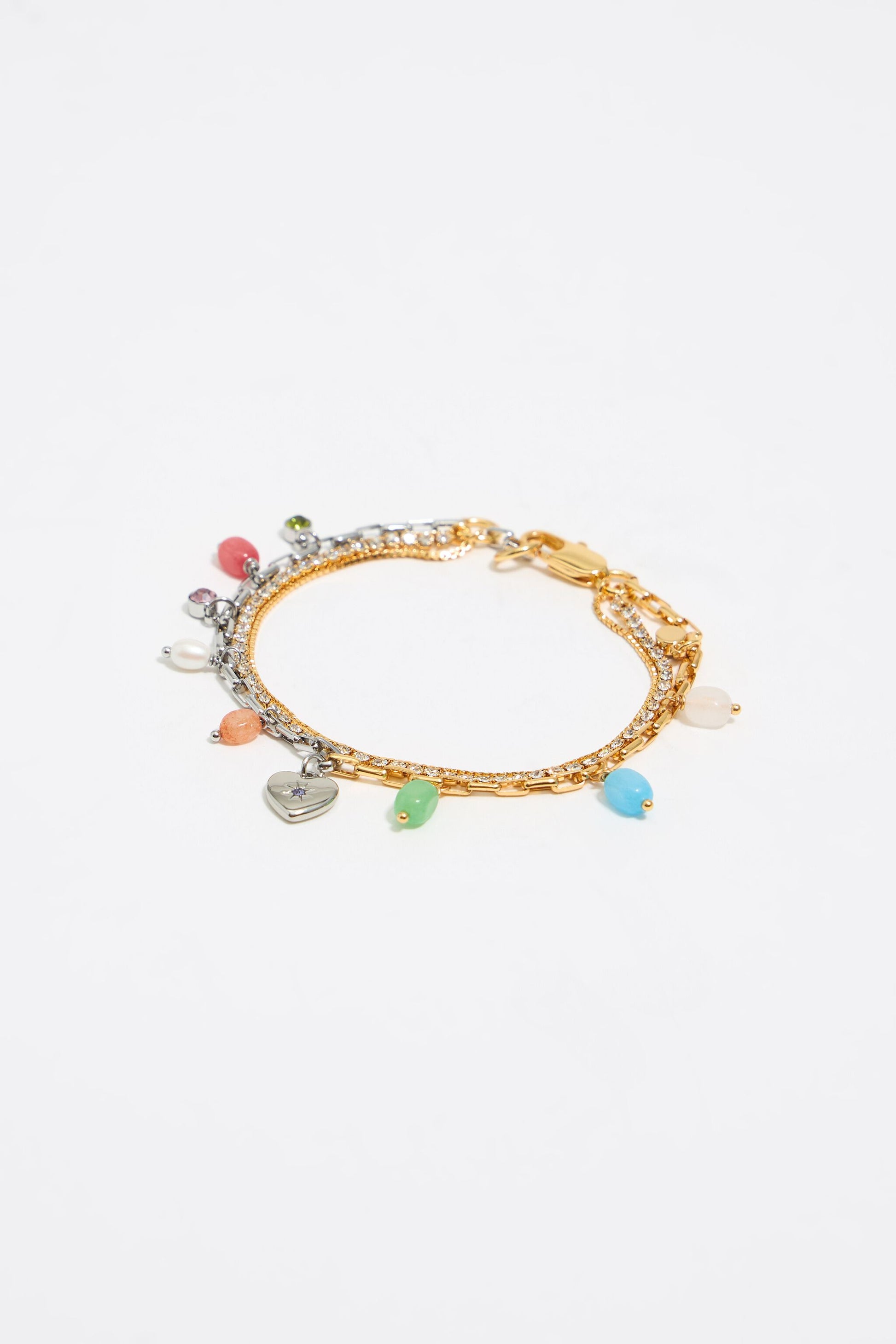 Layered chain bracelet with crystals and pearls. Model customized with engraved logo.