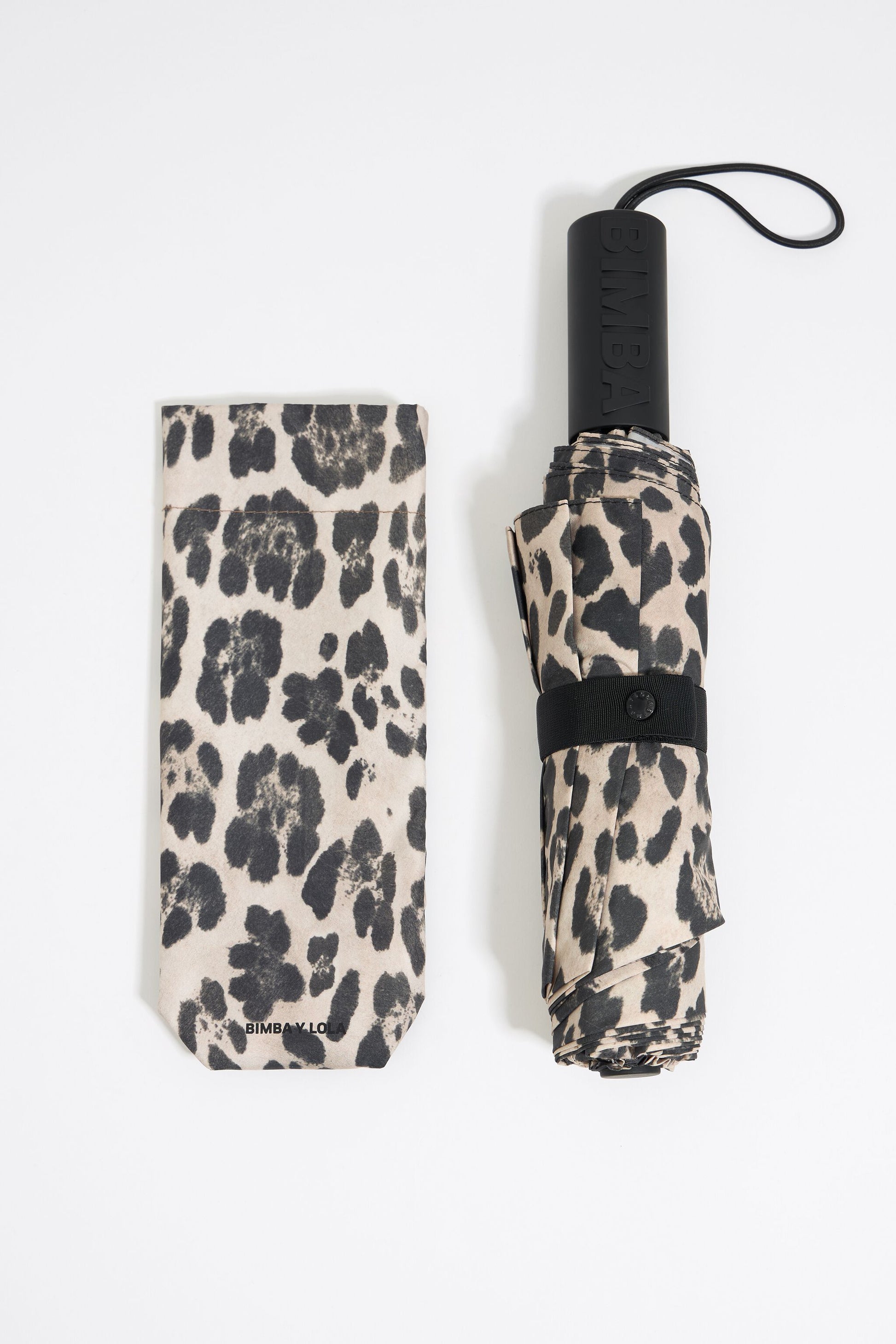 Technical fabric folding umbrella with Leopard print. Model with rubber-effect handle and printed logo.
