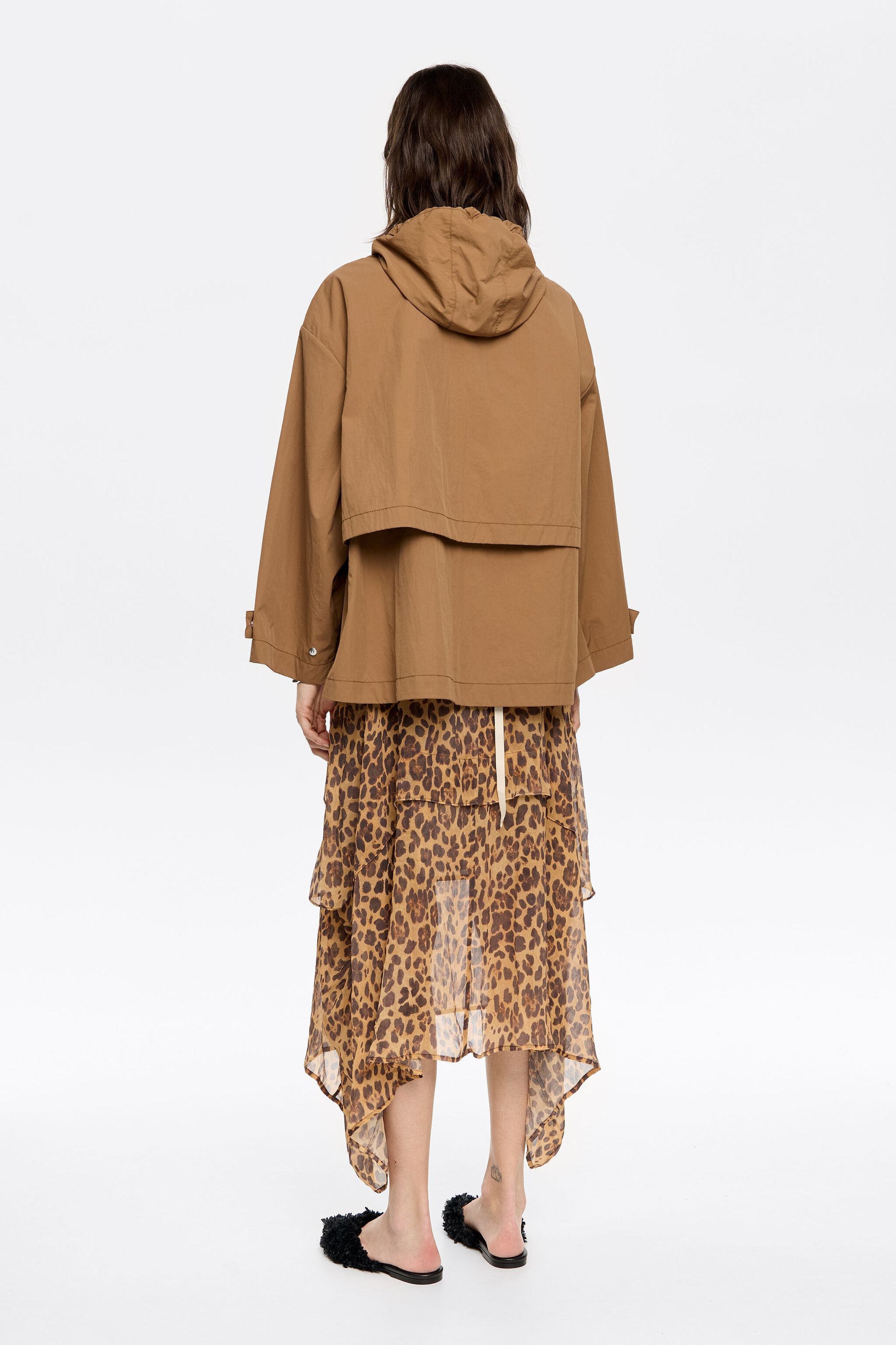 Short technical fabric trench in light brown. A-line, high neck with drawstring hood with stoppers, long sleeve and tab cuff with press-stud. Front nylon zip fastener and exterior customized with logo print.