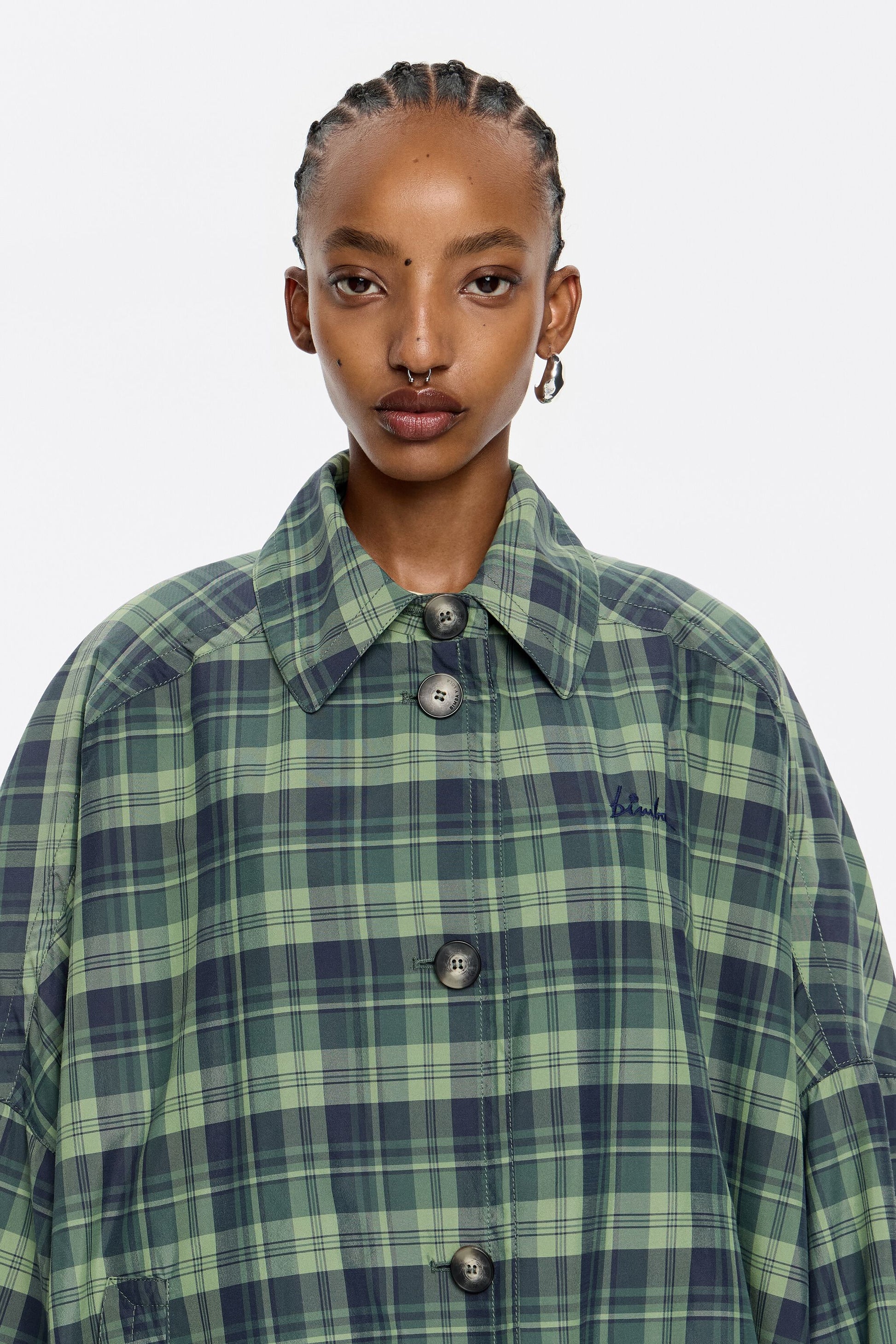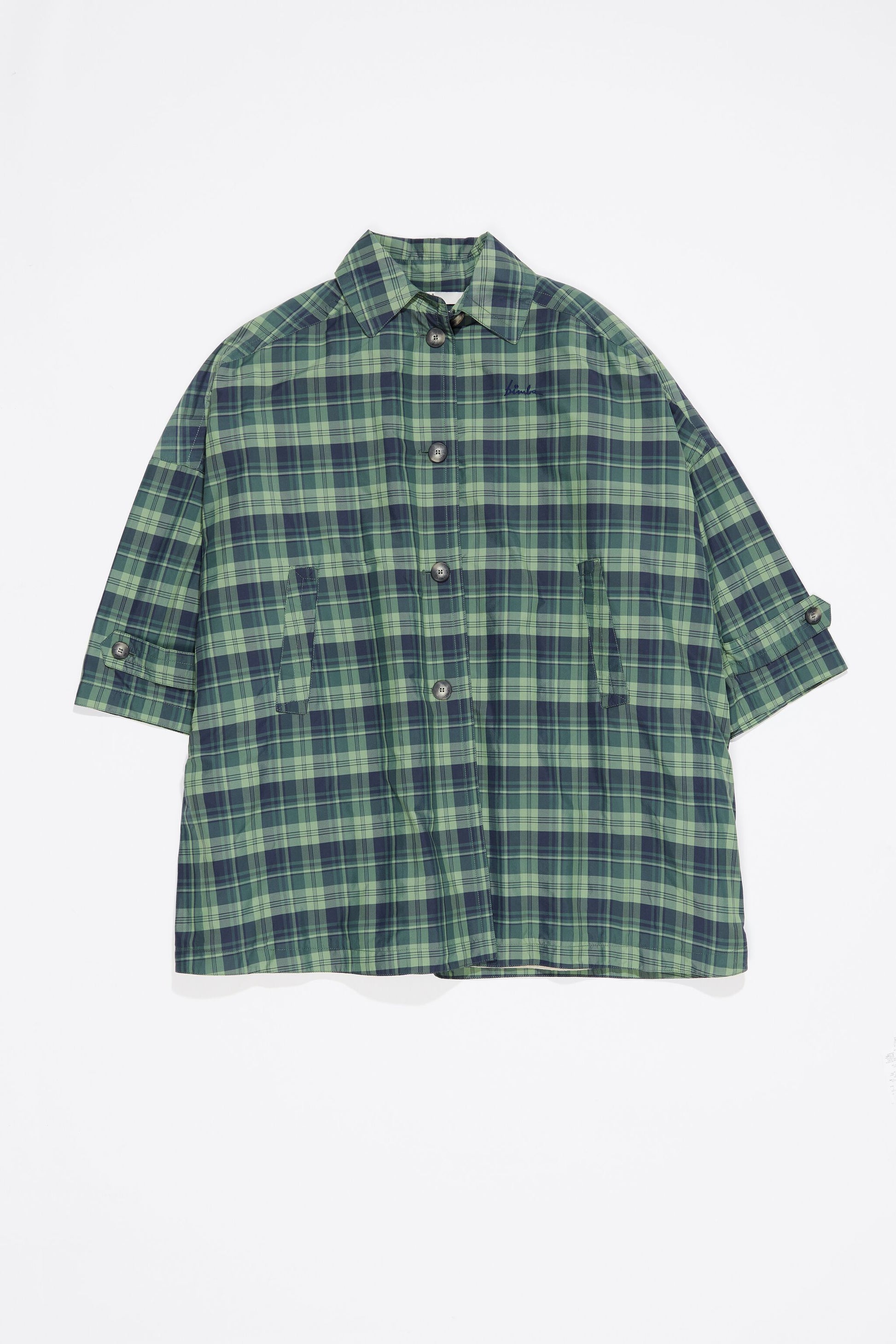 Checked midi trench in light green. Oversize cut, shirt collar, long straight and wide sleeve, and button-up front. Detachable interior padded vest, side slits and exterior customized with embroidered logo. This model contains 90% recycled polyester filling.