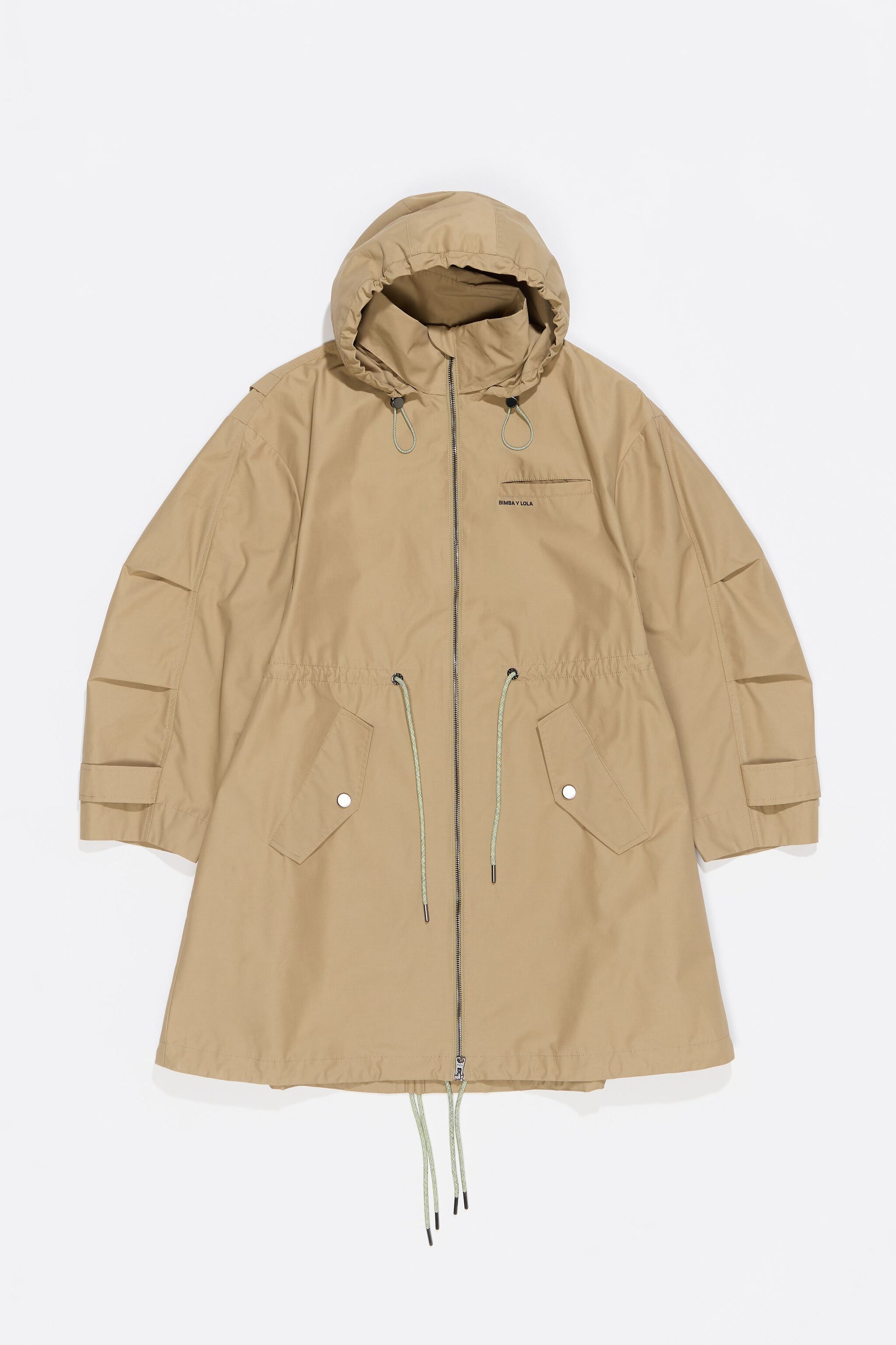 Technical cotton trench in light khaki. A-line, high neck with adjustable hood, long subtly flared sleeve with darts at the elbow, and front metal zip fastener. Exterior customized with logo print and adjustable drawstring waist. This model contains 25% recycled polyamide.