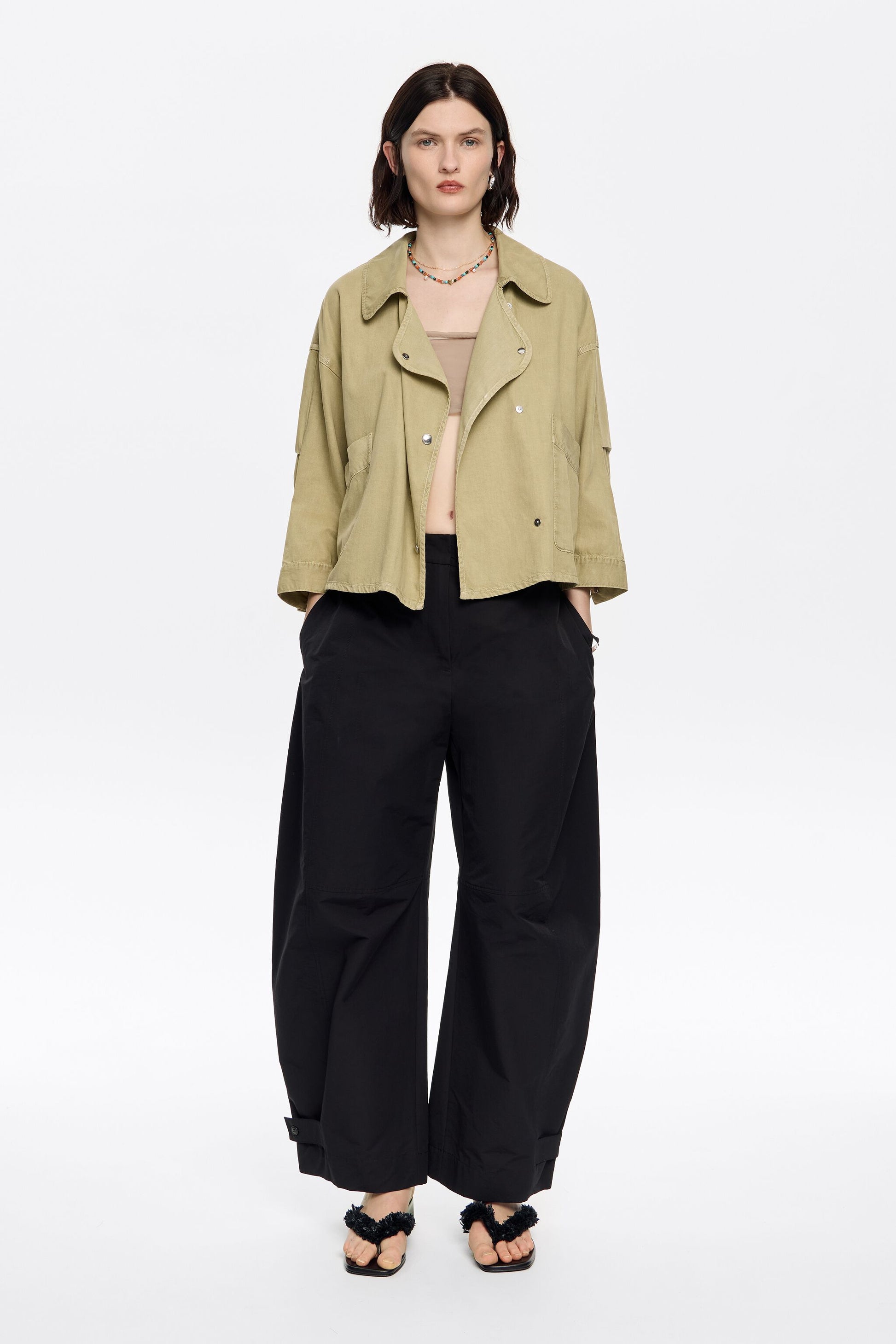 Short double-breasted jacket in light khaki. Fluid cut with shirt collar, long straight sleeve with button and button-up front with press-studs. Slant patch pockets.