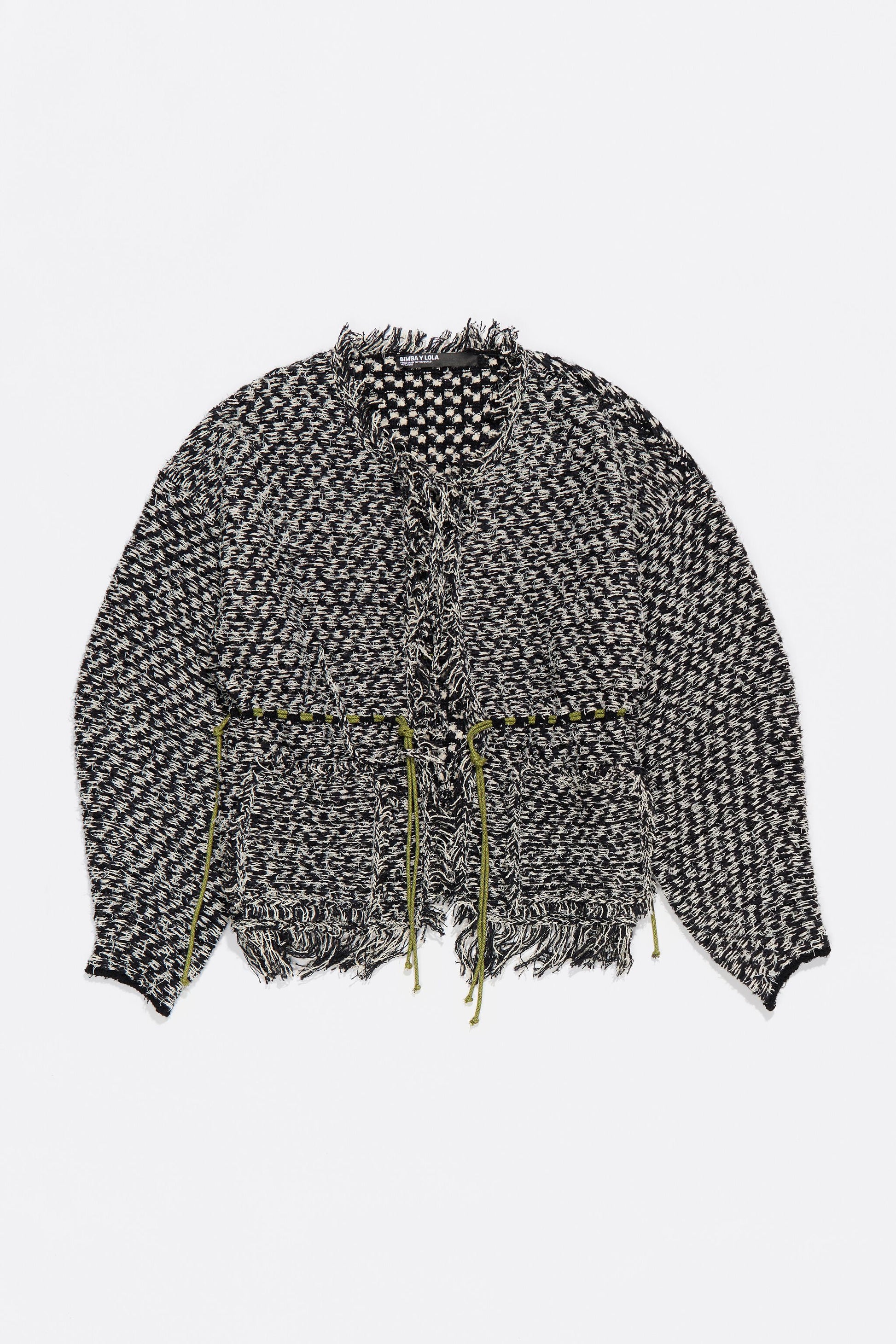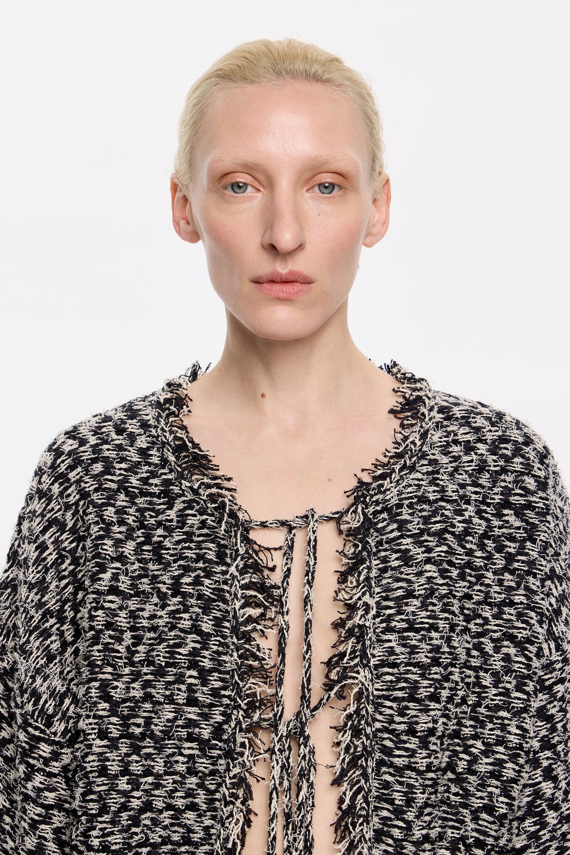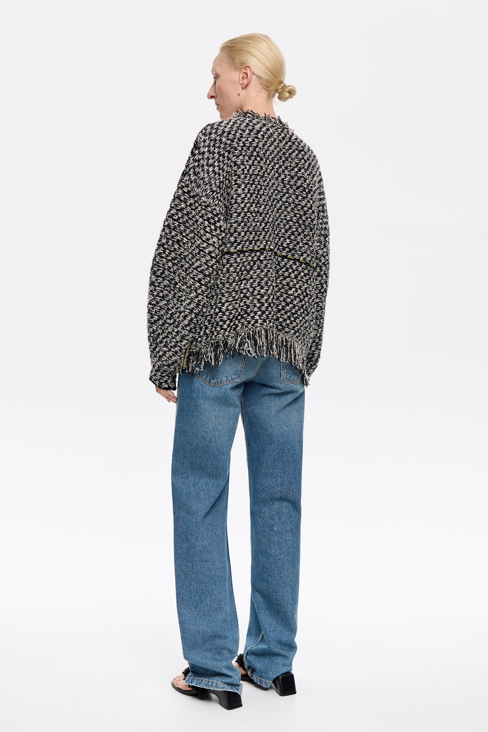Long cotton cardigan in black. Straight cut with V-neck, long straight sleeve, and frayed finish at the pockets and neckline.