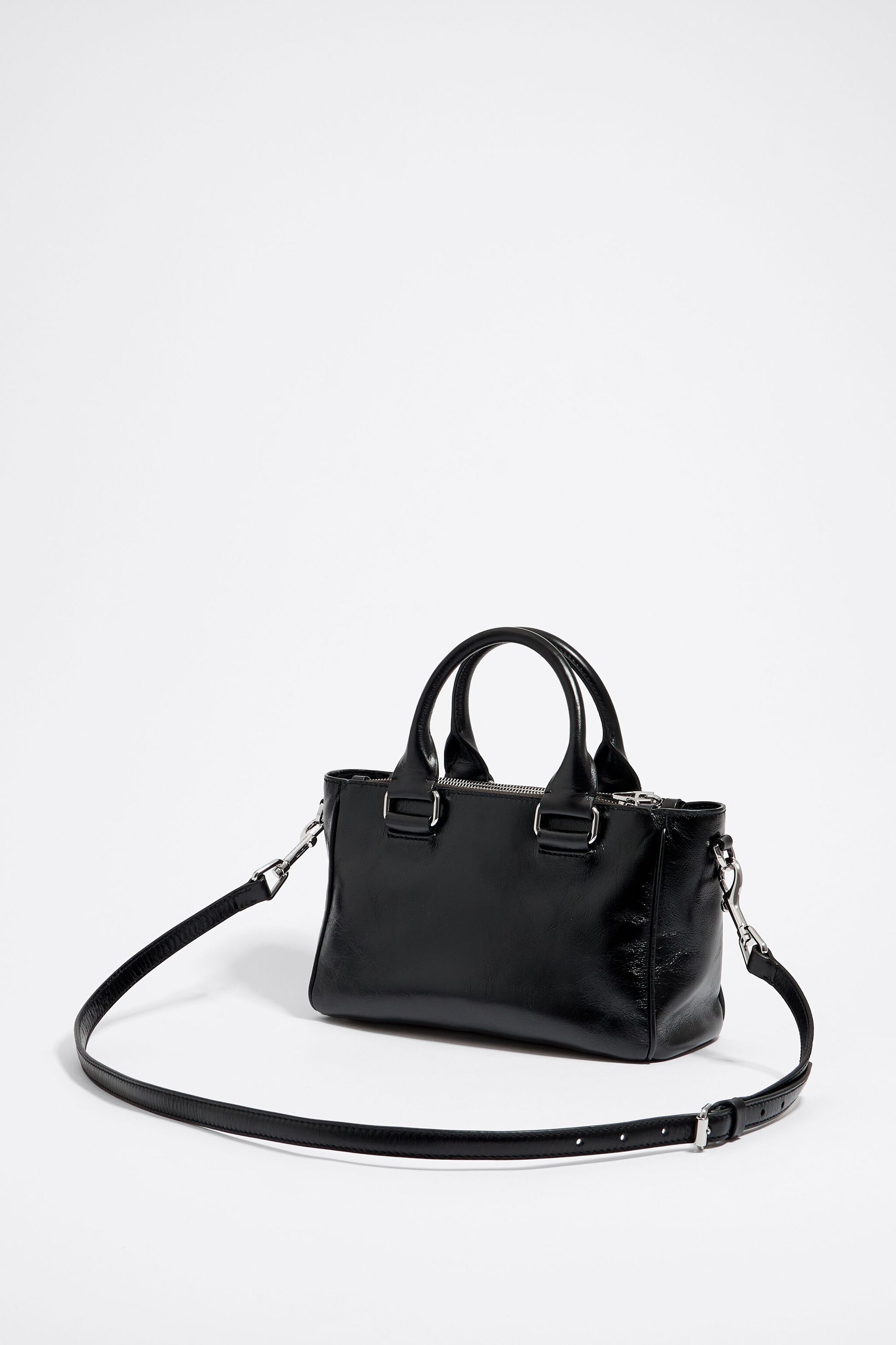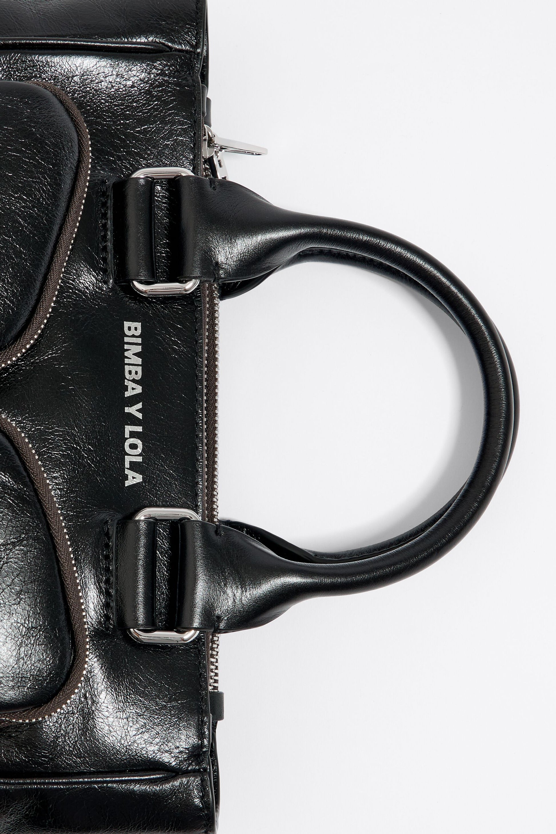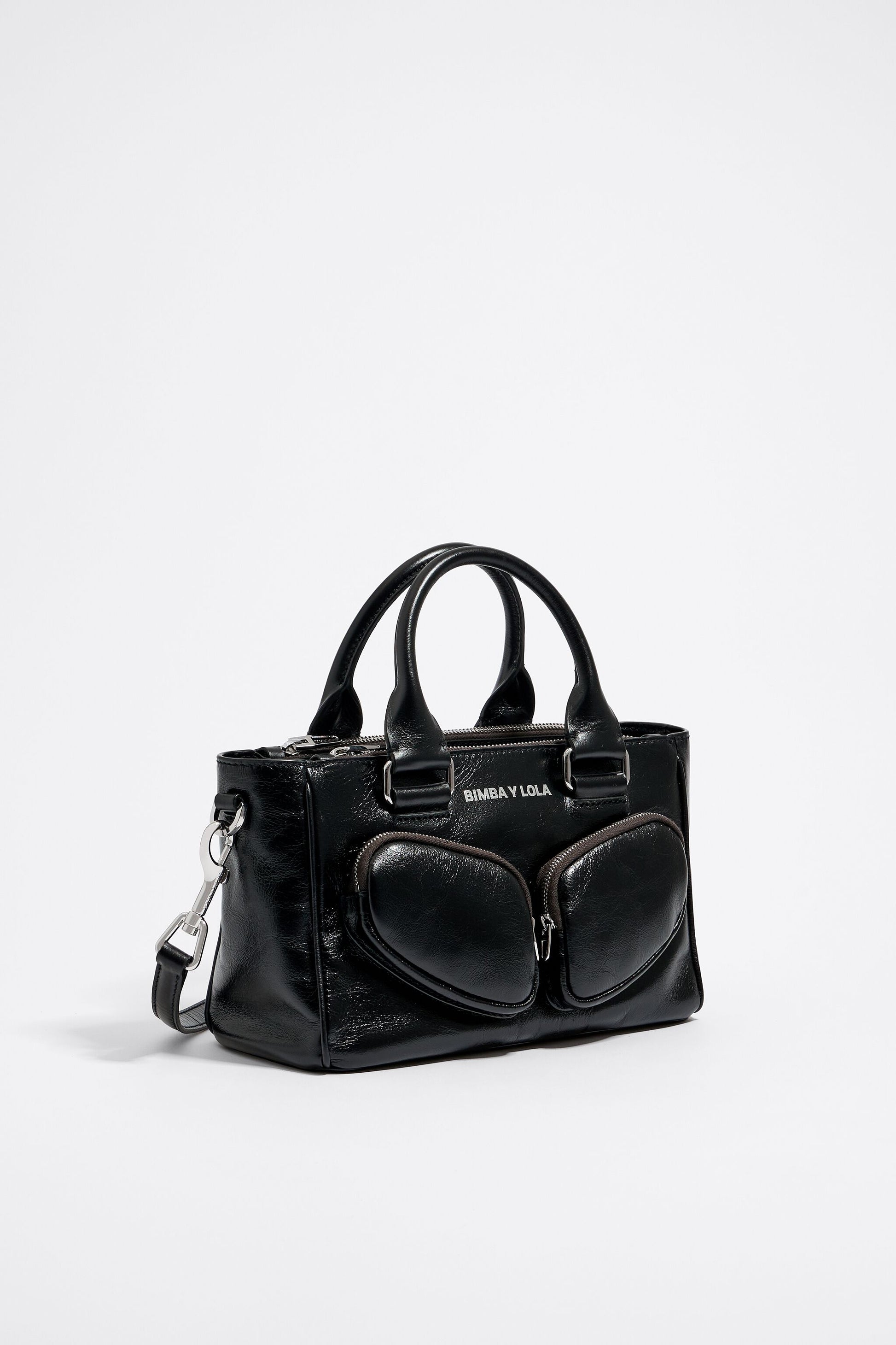 Black smooth leather Pocket tote bag. Medium-size model with two compartments with zip fasteners, magnetic fastener, two handles, and leather crossbody strap. Interior customized with a leather label. Exterior customized with logo print. 60% Recycled fibers.