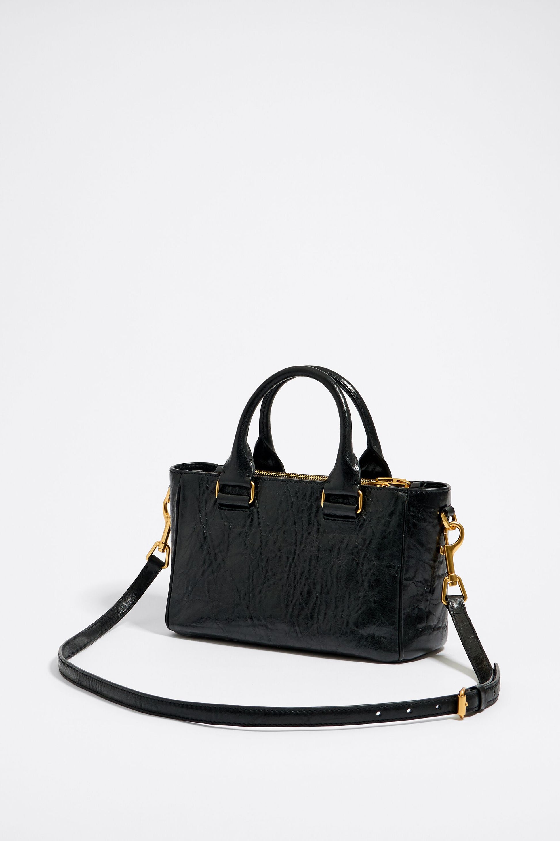 Tumbled leather Pocket tote bag in black. Medium-size model with two compartments with zip fasteners, magnetic fastener, two handles, and leather crossbody strap. Interior customized with a leather label. Exterior customized with logo print.