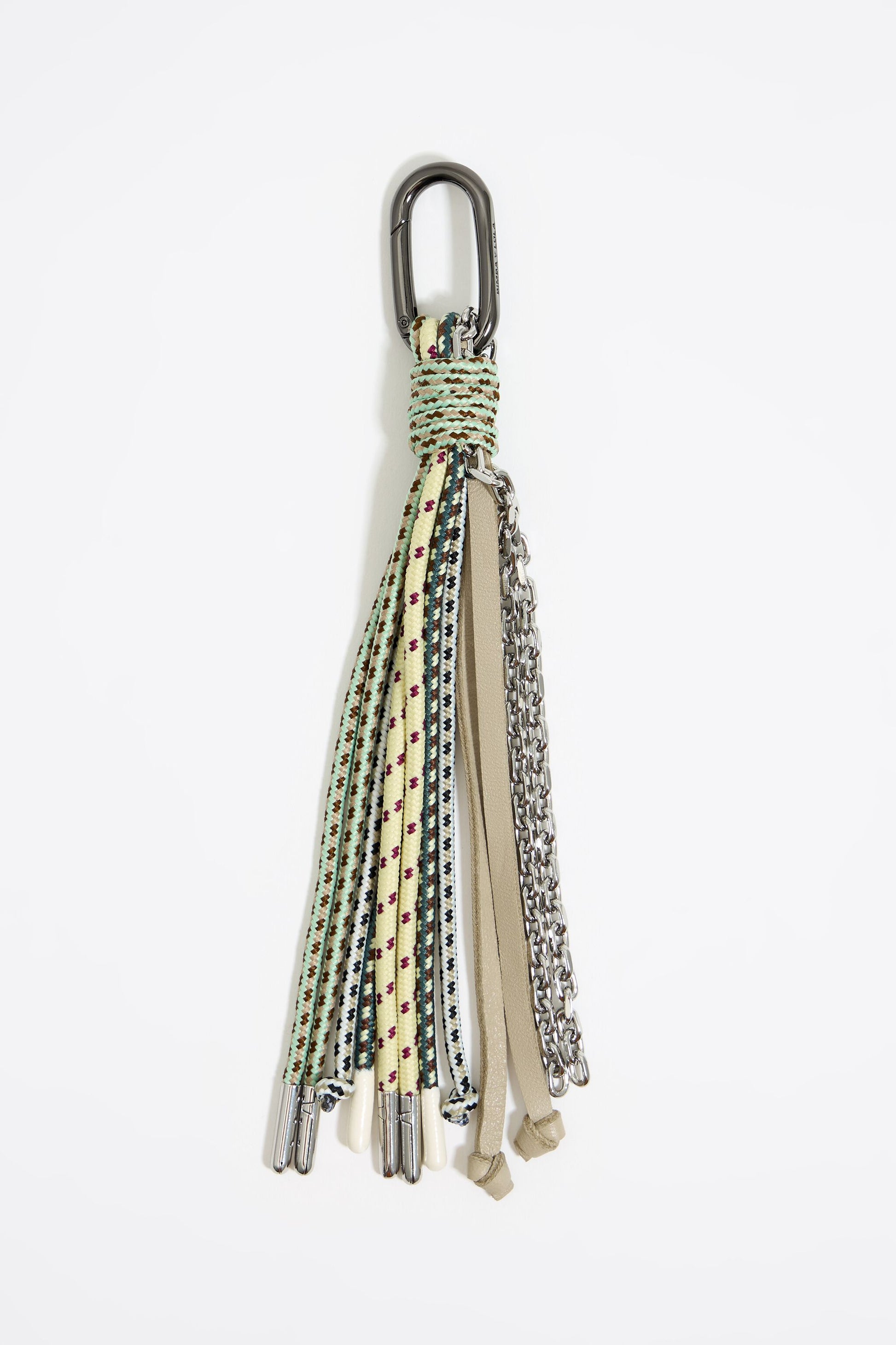 Black leather trapezium bag. Medium model with zip fastener, long leather strap, and interior pocket. Exterior customized with metallic logo and decorative charm with multicolor rope.