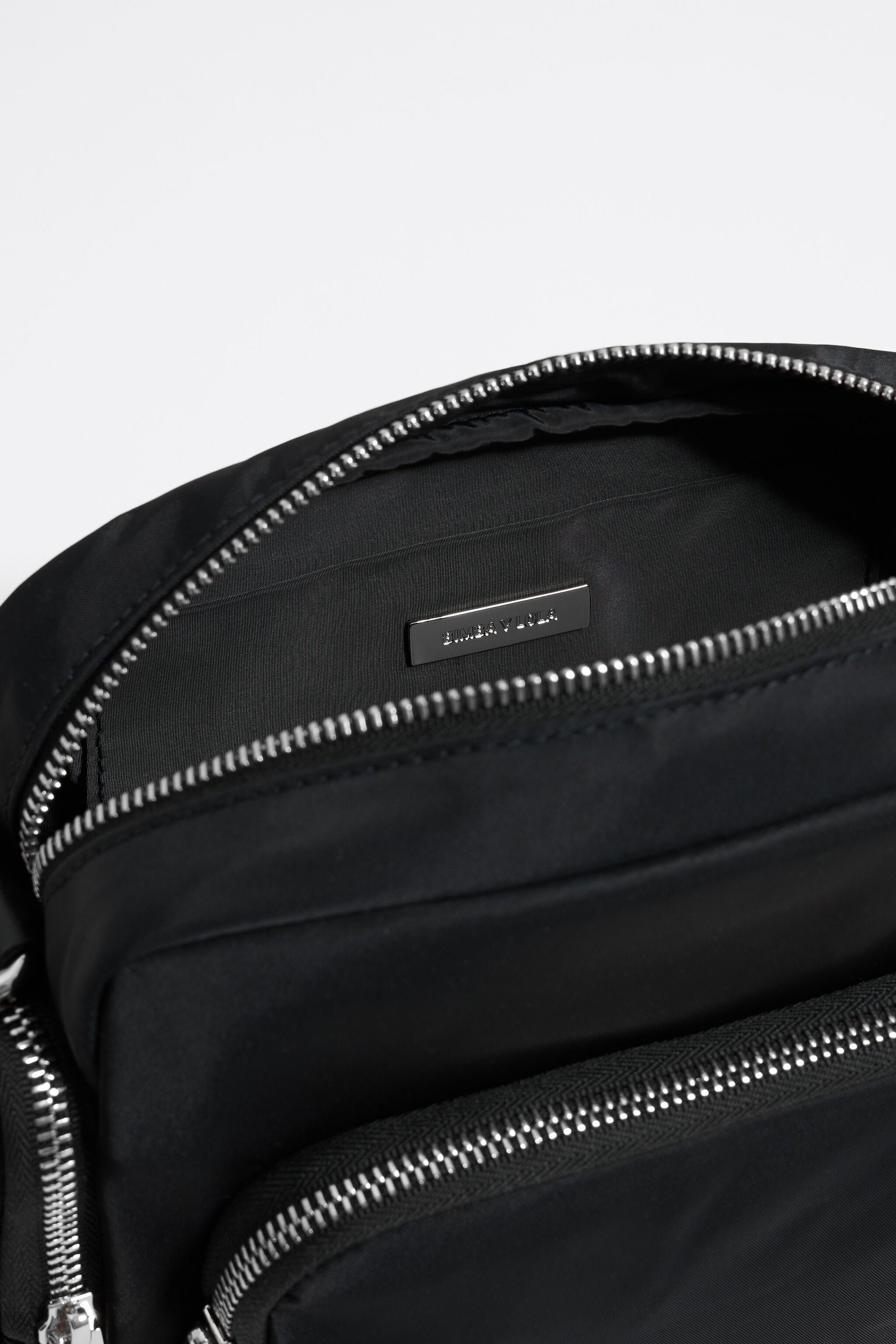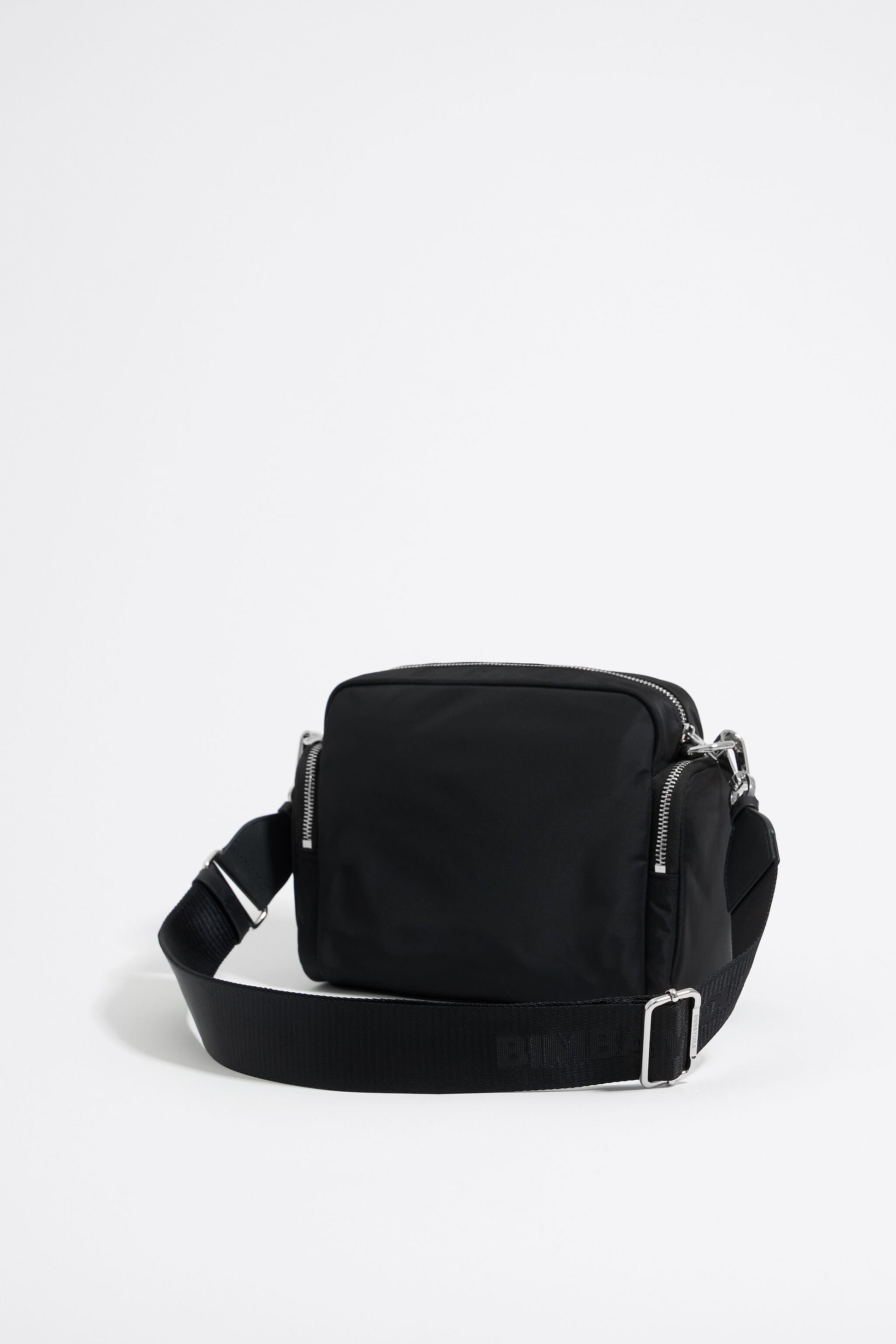 Nylon multi-pocket crossbody bag in black. Medium model with zip fastener, logo fabric strap, interior pocket and leather pieces. Exterior customized with metallic logo.