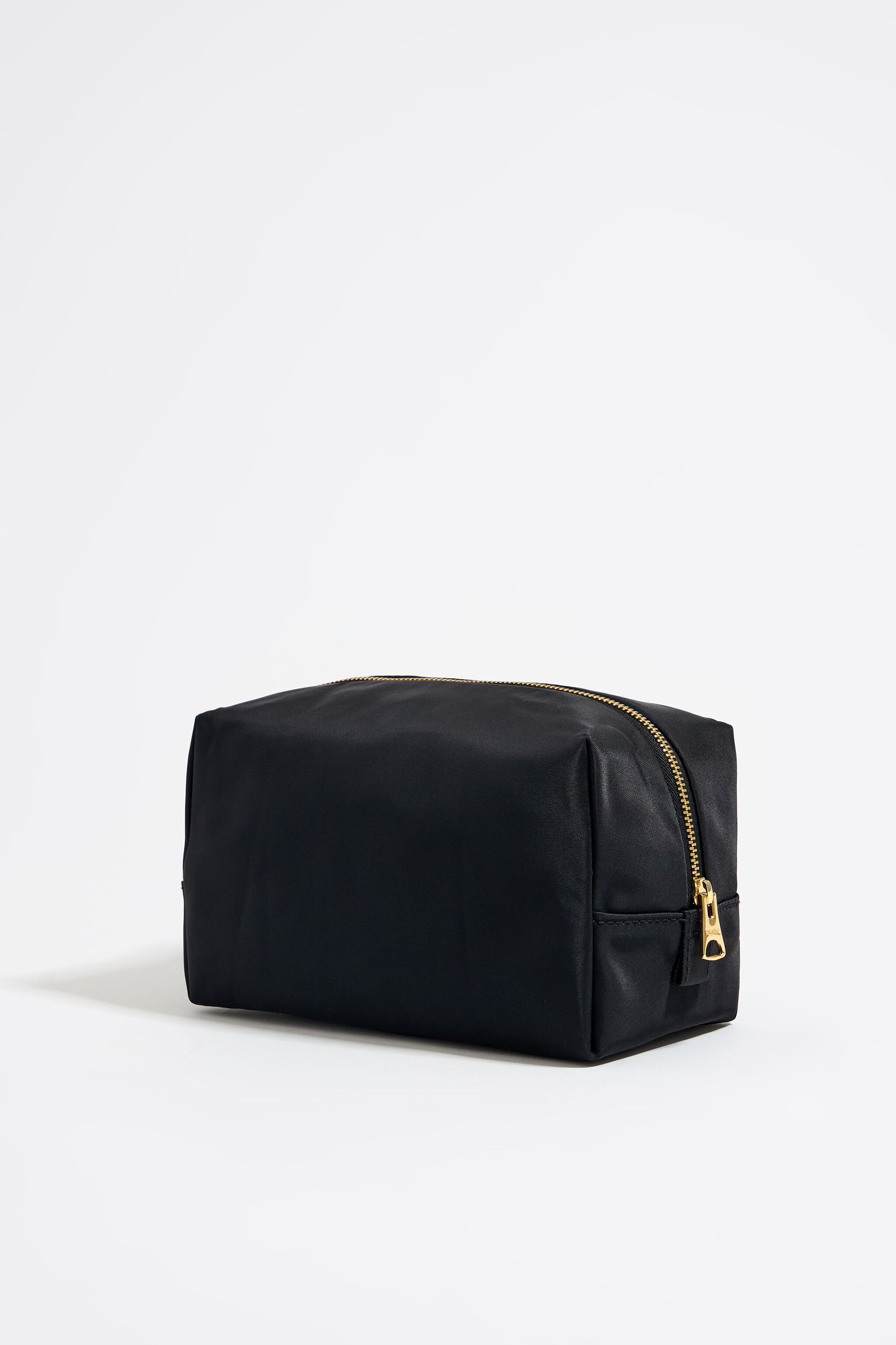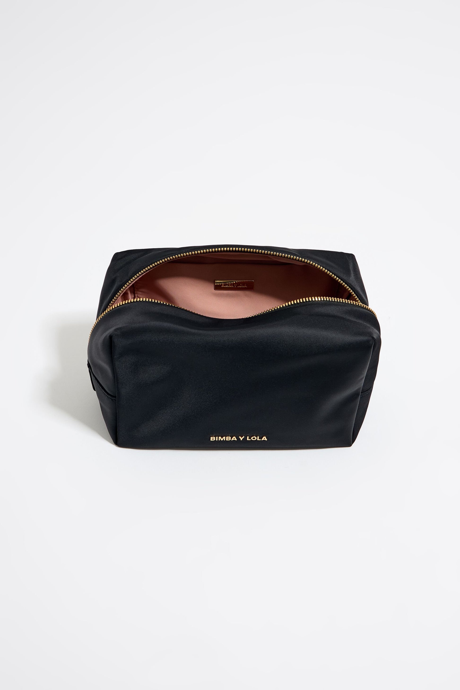 Nylon make-up case in black. Medium-size model with zip fastener and interior pocket. Exterior customized with metallic logo.