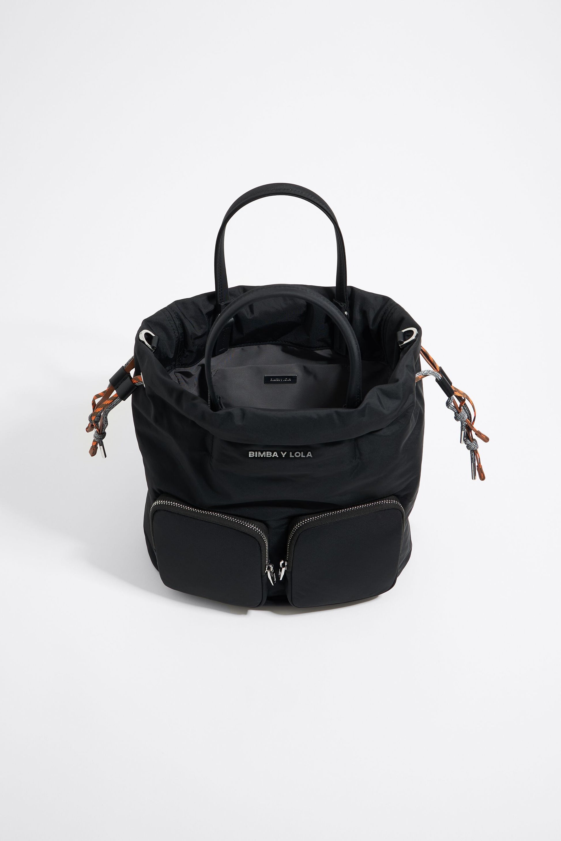 Nylon multi-pocket crossbody bag in black. Medium model with adjustable drawstring fastener and leather strap, handles, fabric strap, interior pocket and leather detailing at the strap. Exterior customized with metallic logo.