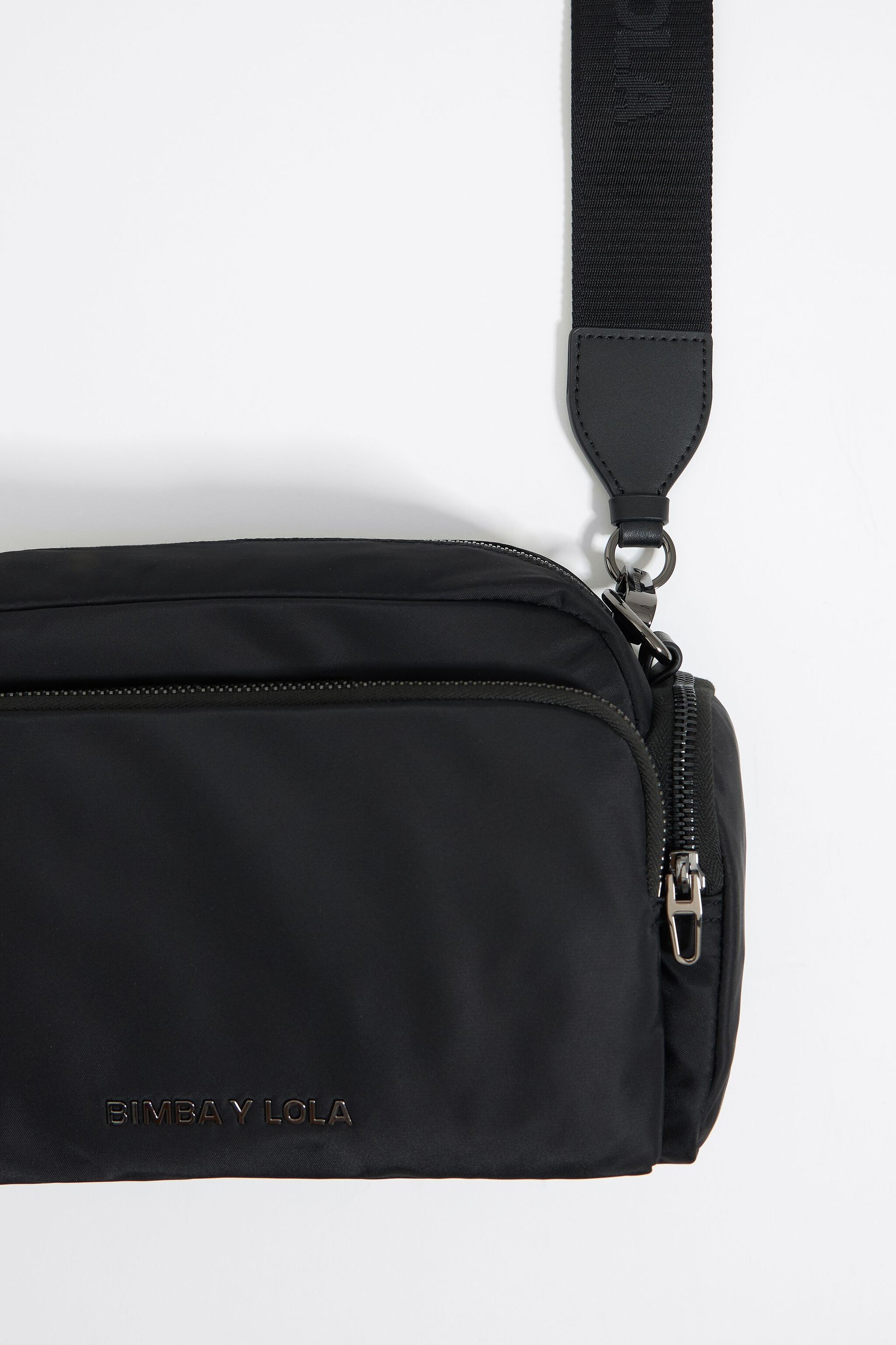 Nylon Pocket crossbody bag in black. Medium model, zip fastener, long logo fabric strap, interior pocket and leather pieces. Exterior customized with metallic logo.