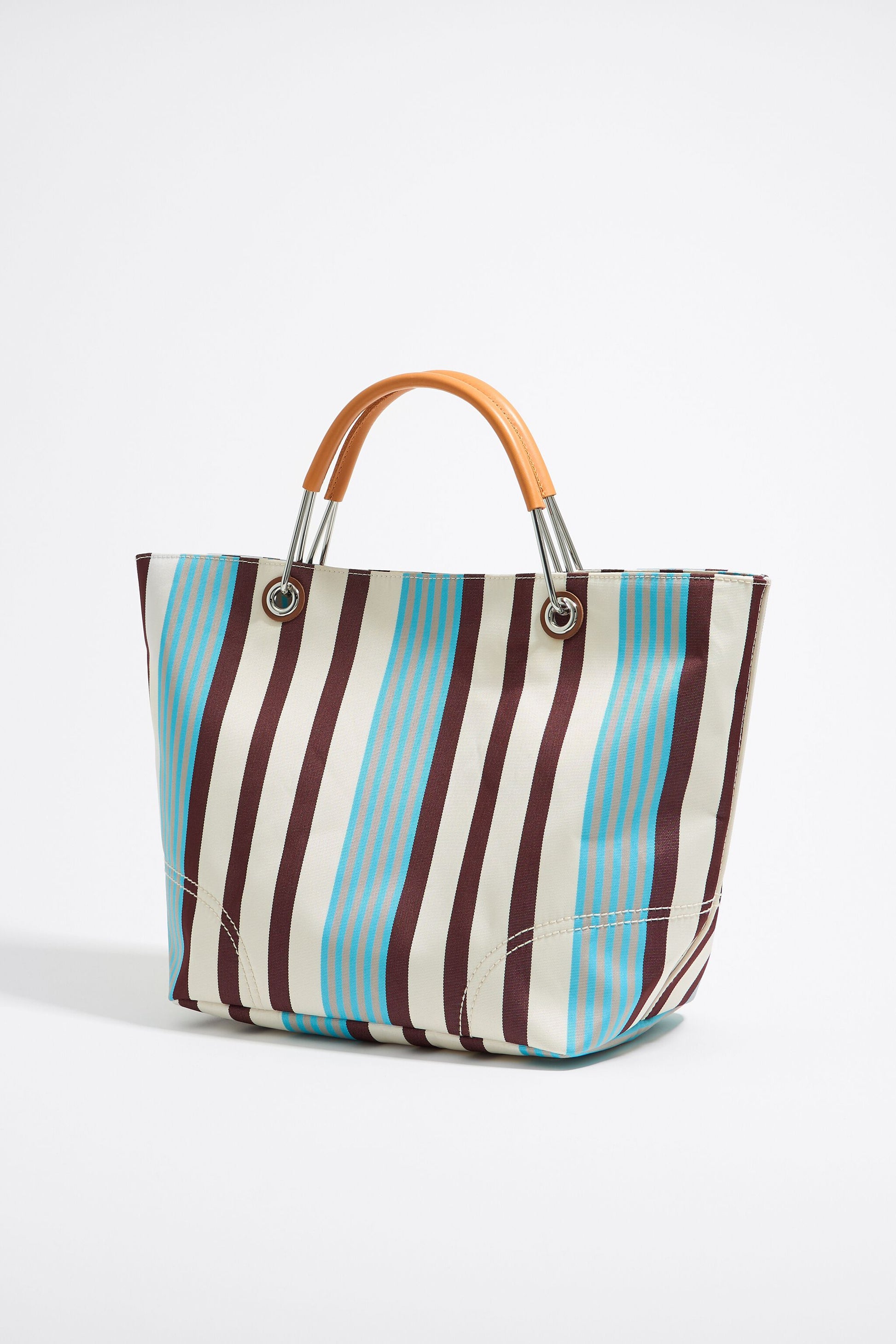 Woven fabric Canopy handbag in blue. Medium model with magnetic fastener, leather-covered metal handle and stitched edges. Exterior customized with engraved leather label.