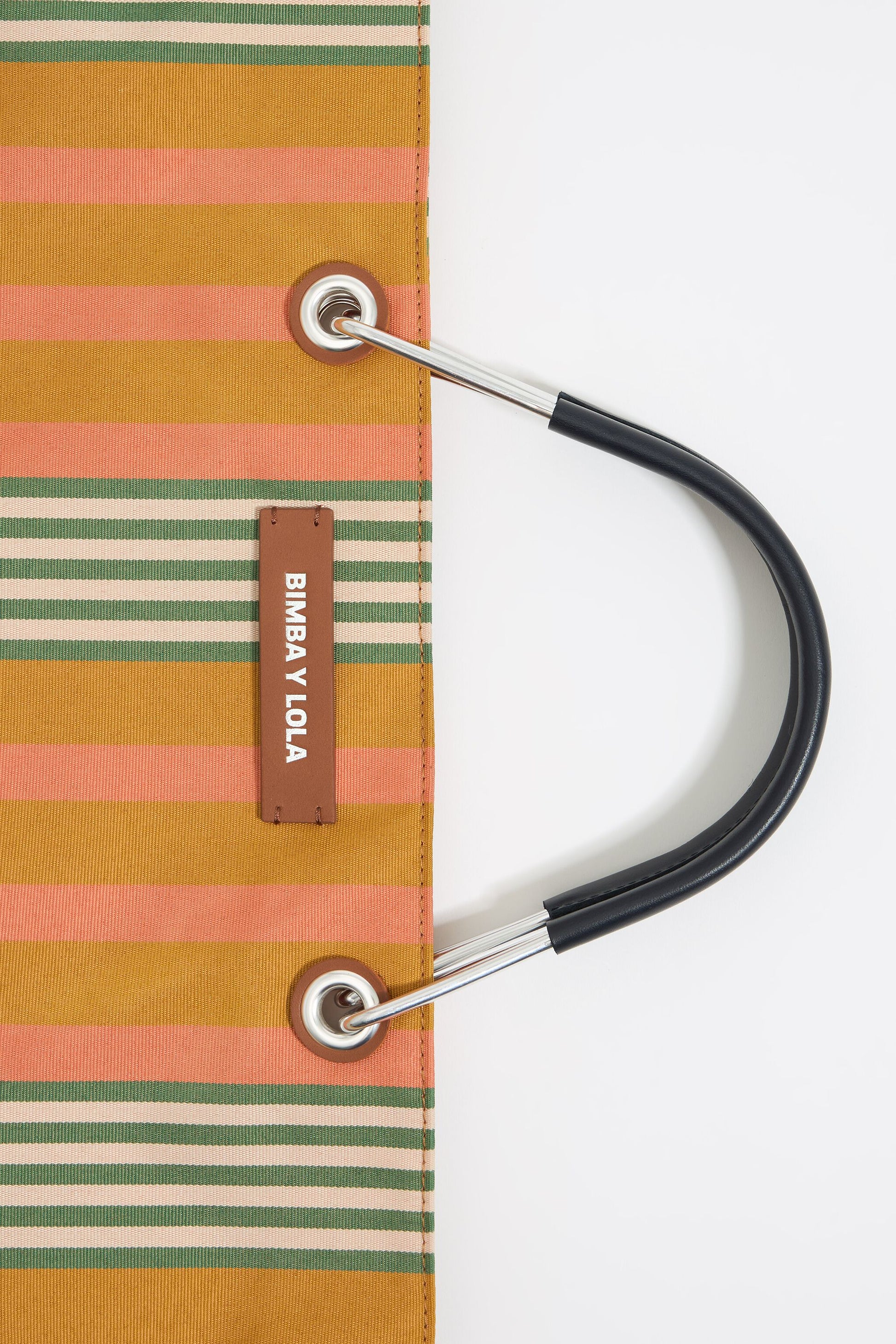 Woven fabric Canopy shopper bag in ocher. Medium model with magnetic fastener, leather-covered metal handle and stitched edges. Exterior customized with engraved leather label.