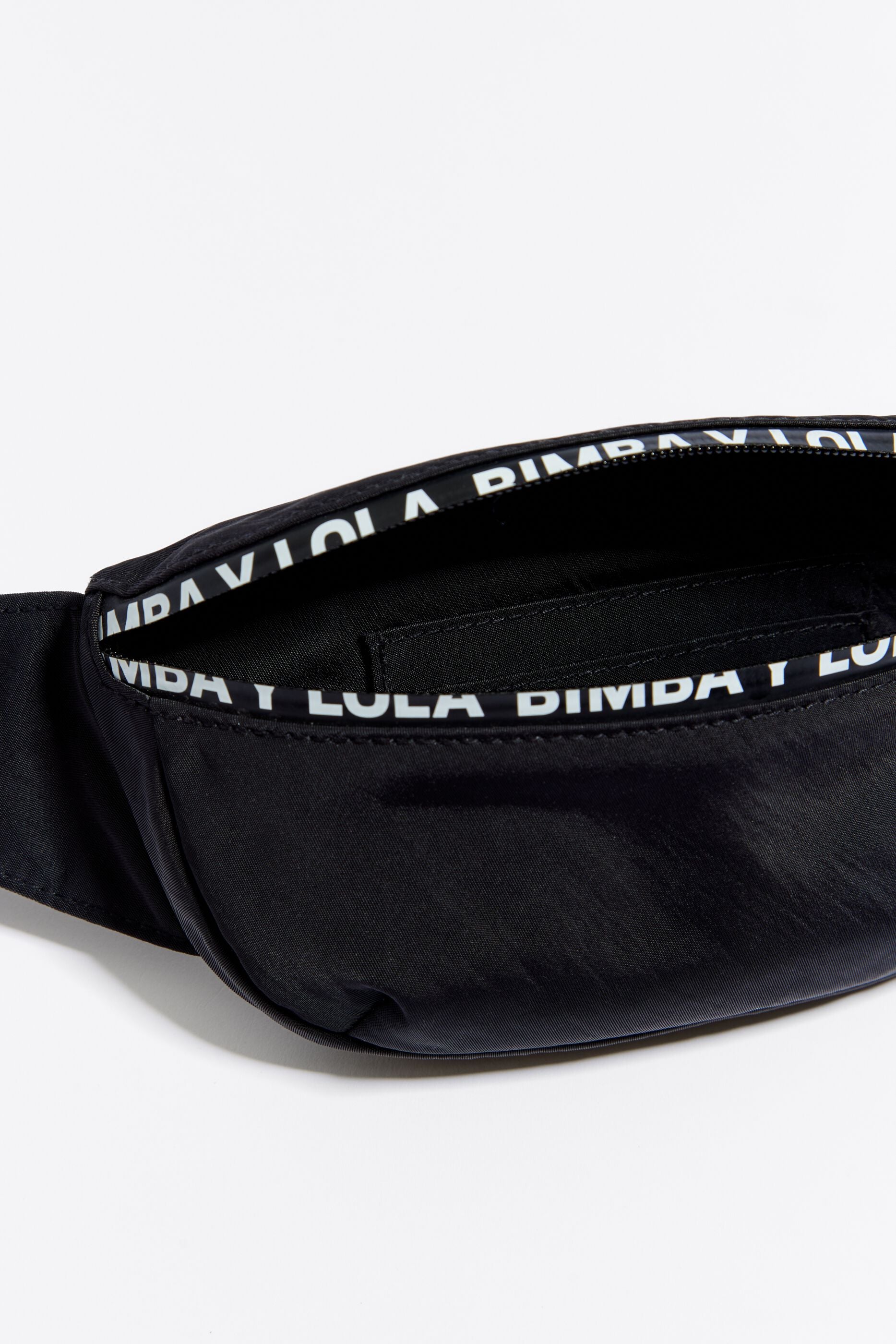 Nylon bumbag in black. Mini model with logo zip fastener, exterior back pocket, and adjustable fabric strap.