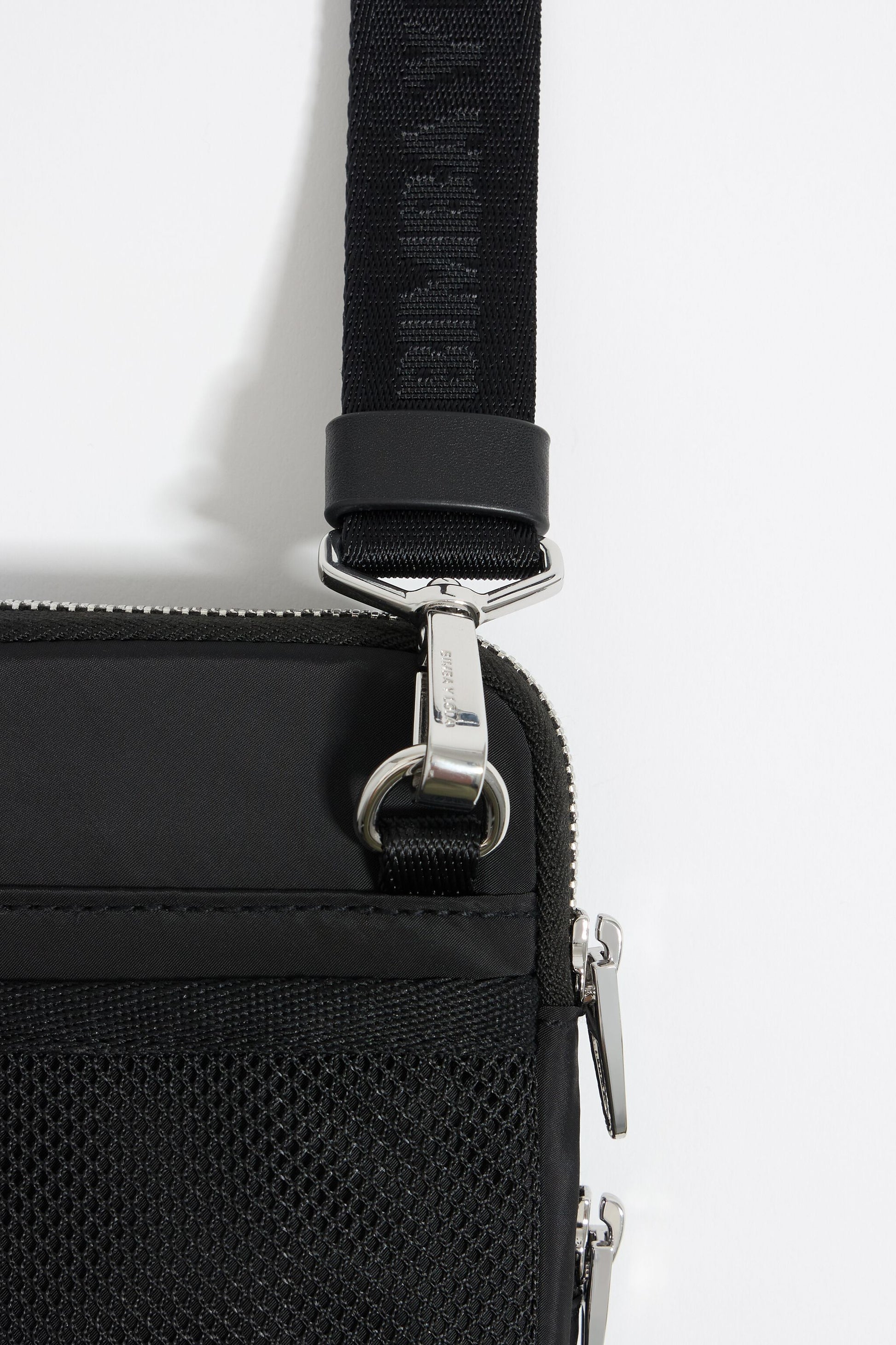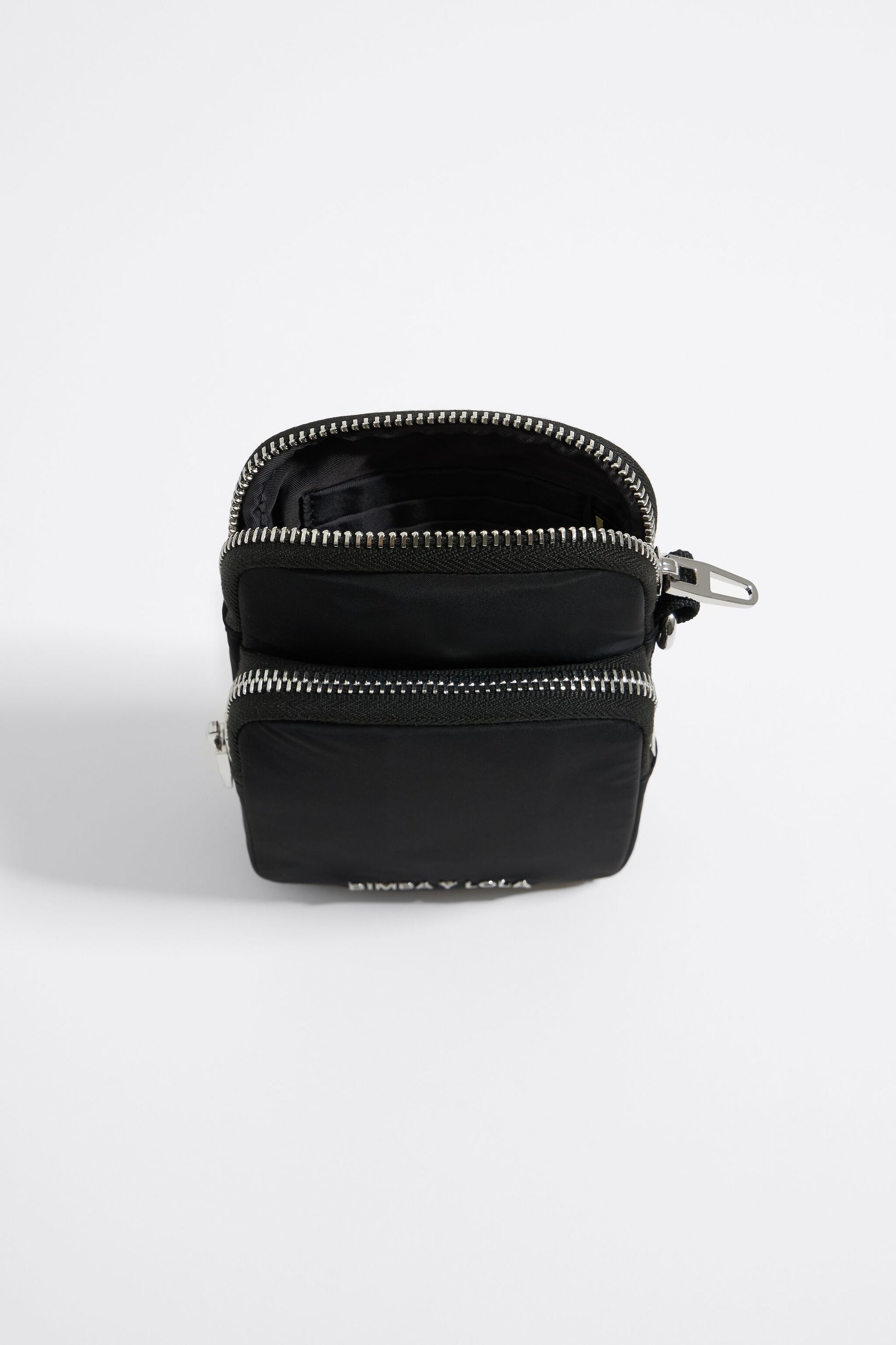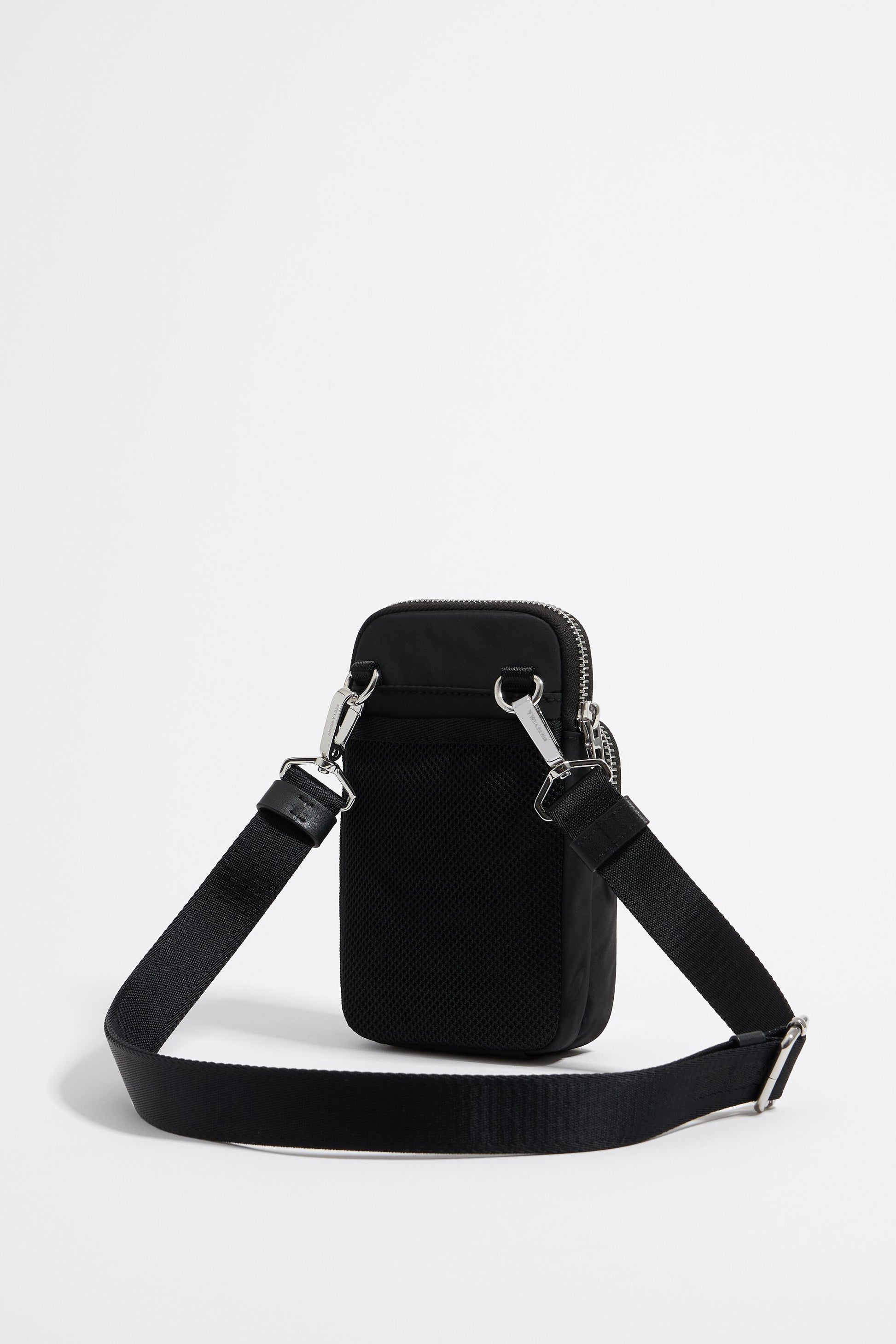 Nylon crossbody bag in black. Mini model with zip fastener, adjustable logo fabric strap, leather details and interior card holder. Exterior customized with metallic logo. This model contains 100% recycled polyester.