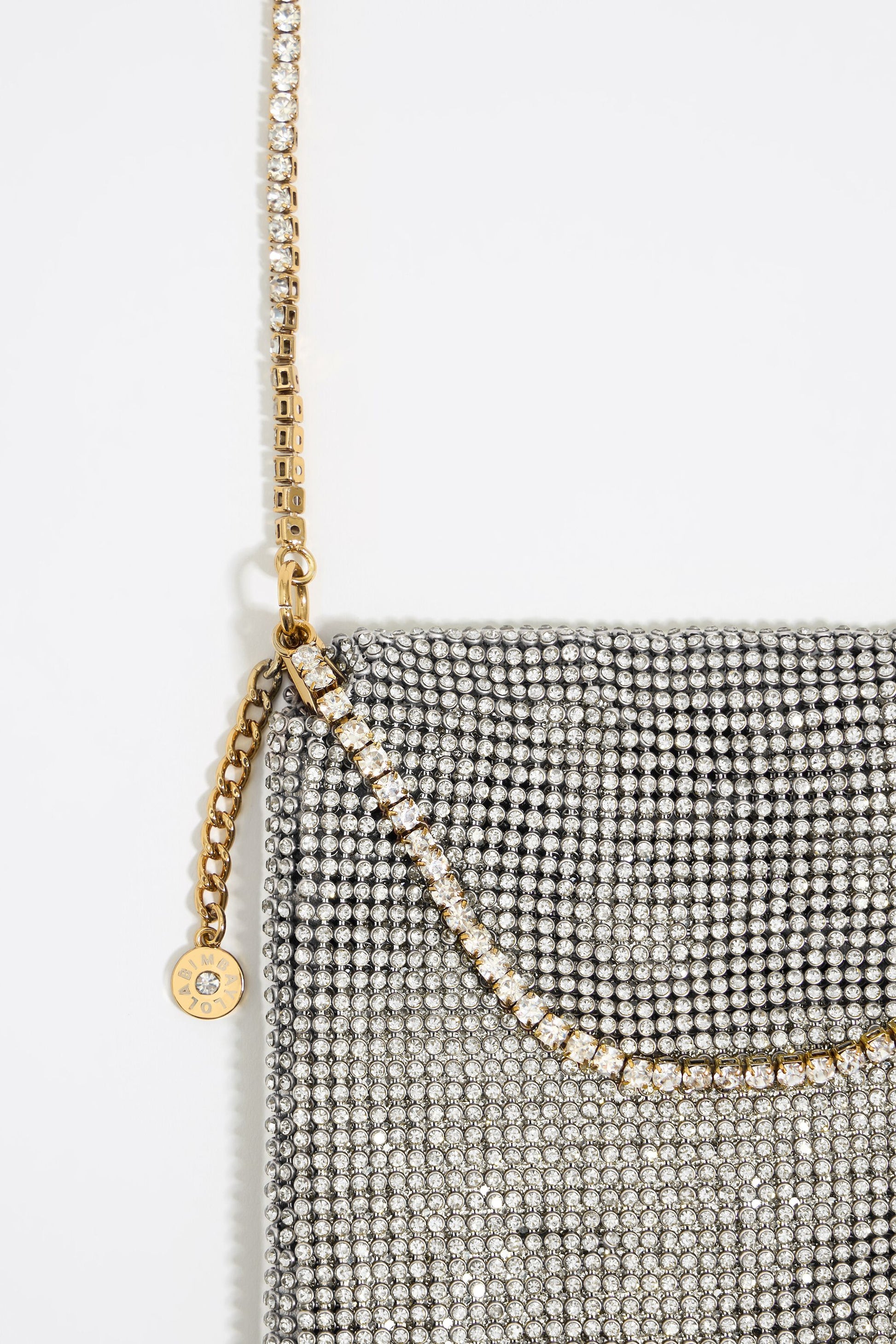 Metallic mesh bag in silver with crystals. Mini model with magnetic fastener, chain strap and interior pocket. Exterior customized with metallic logo.