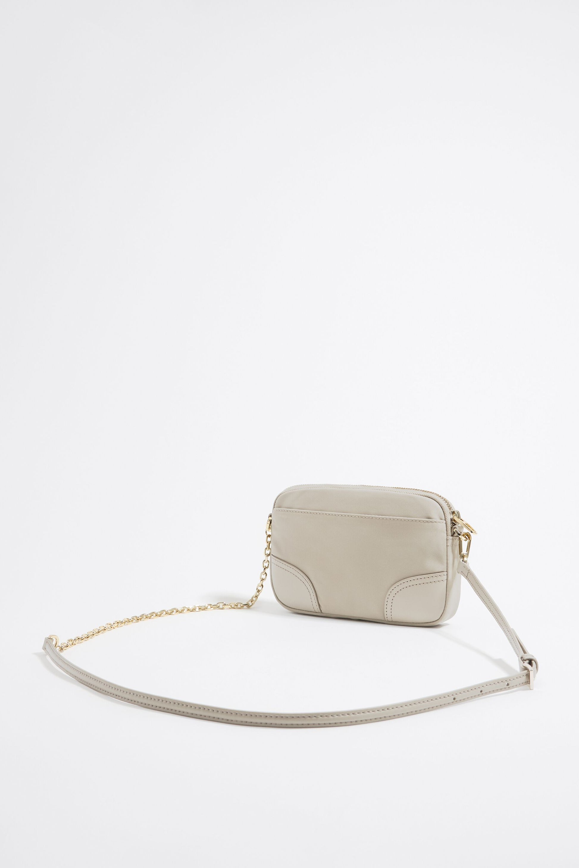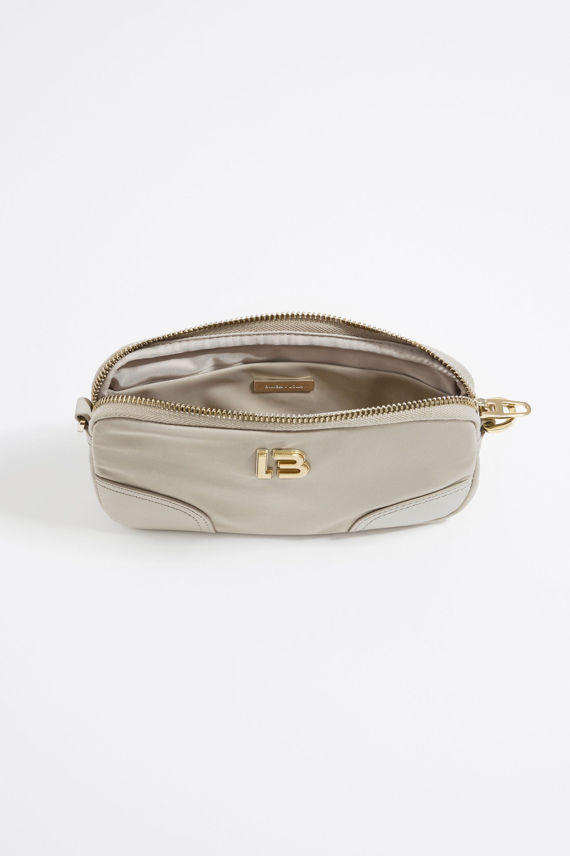 Nylon crossbody bag in stone. Mini model with zip fastener, long chain and leather strap, and interior pocket. Exterior customized with LB logo. This model contains 100% Recycled polyamide + 100% Recycled polyester.