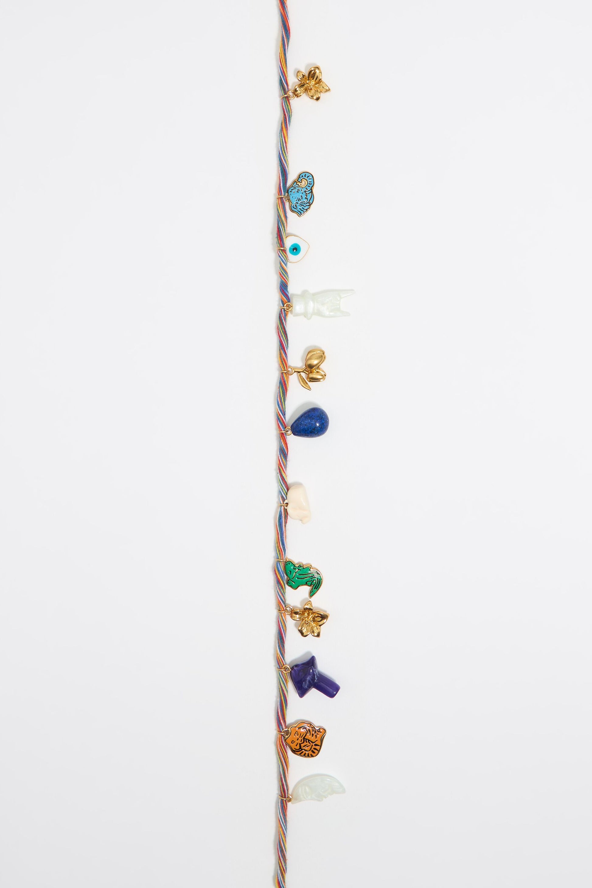 Multicolor cord necklace with jungle charms. Model customized with engraved logo.