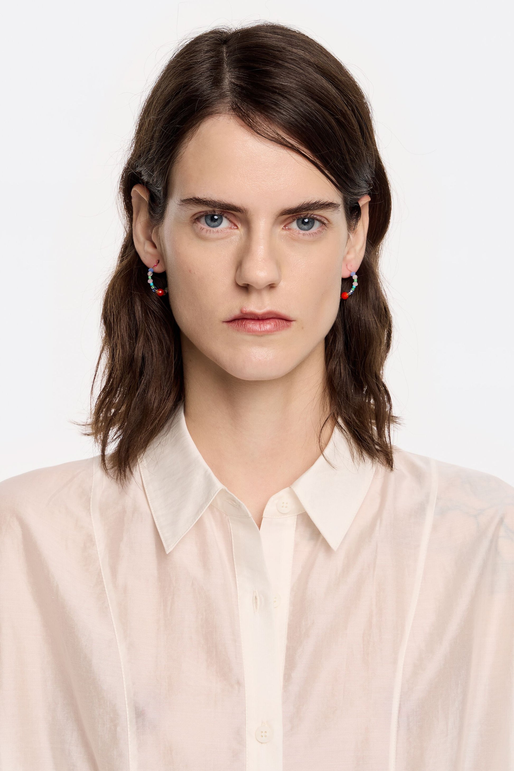 Medium hoop earrings with multicolor crystals. Model customized with engraved logo.