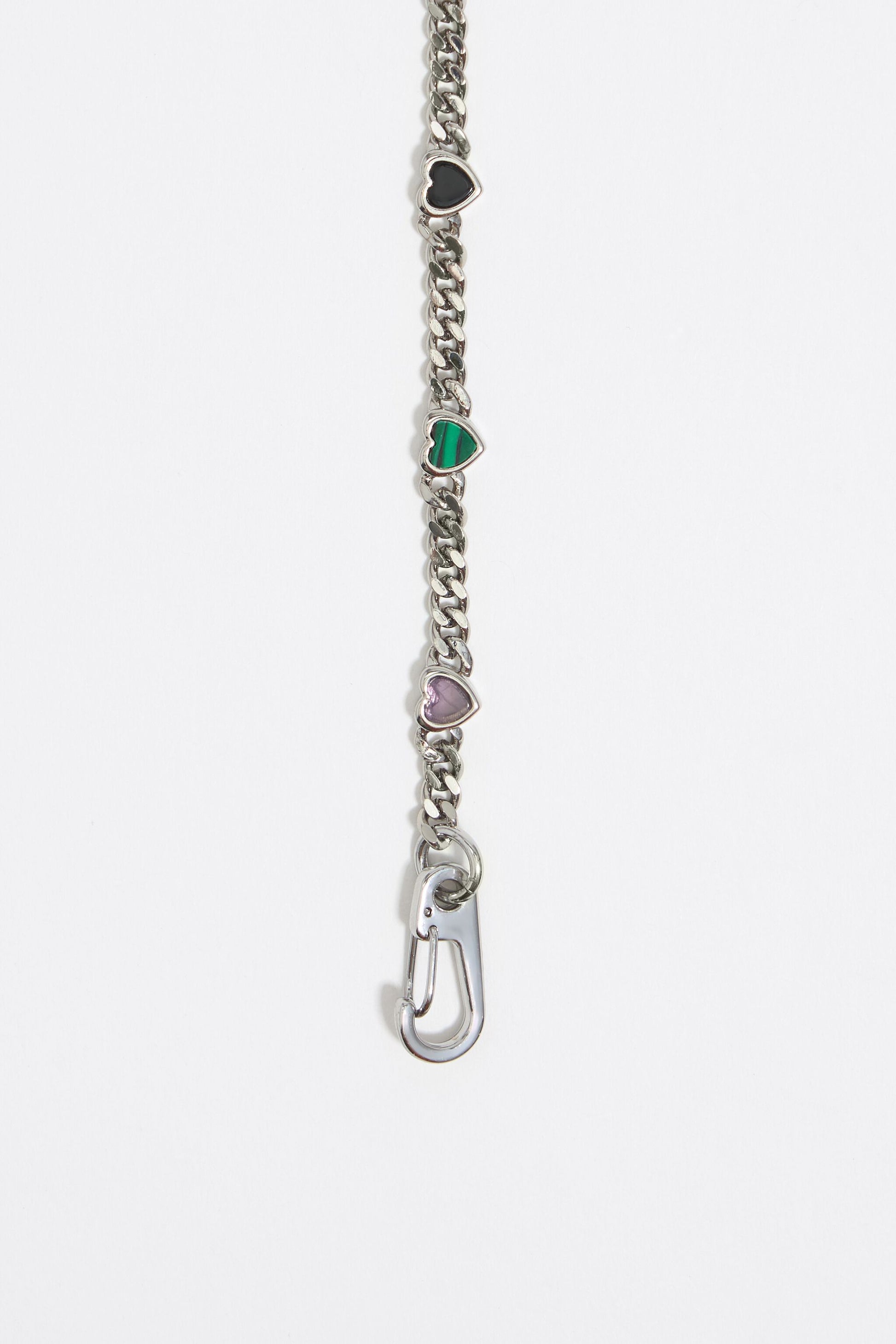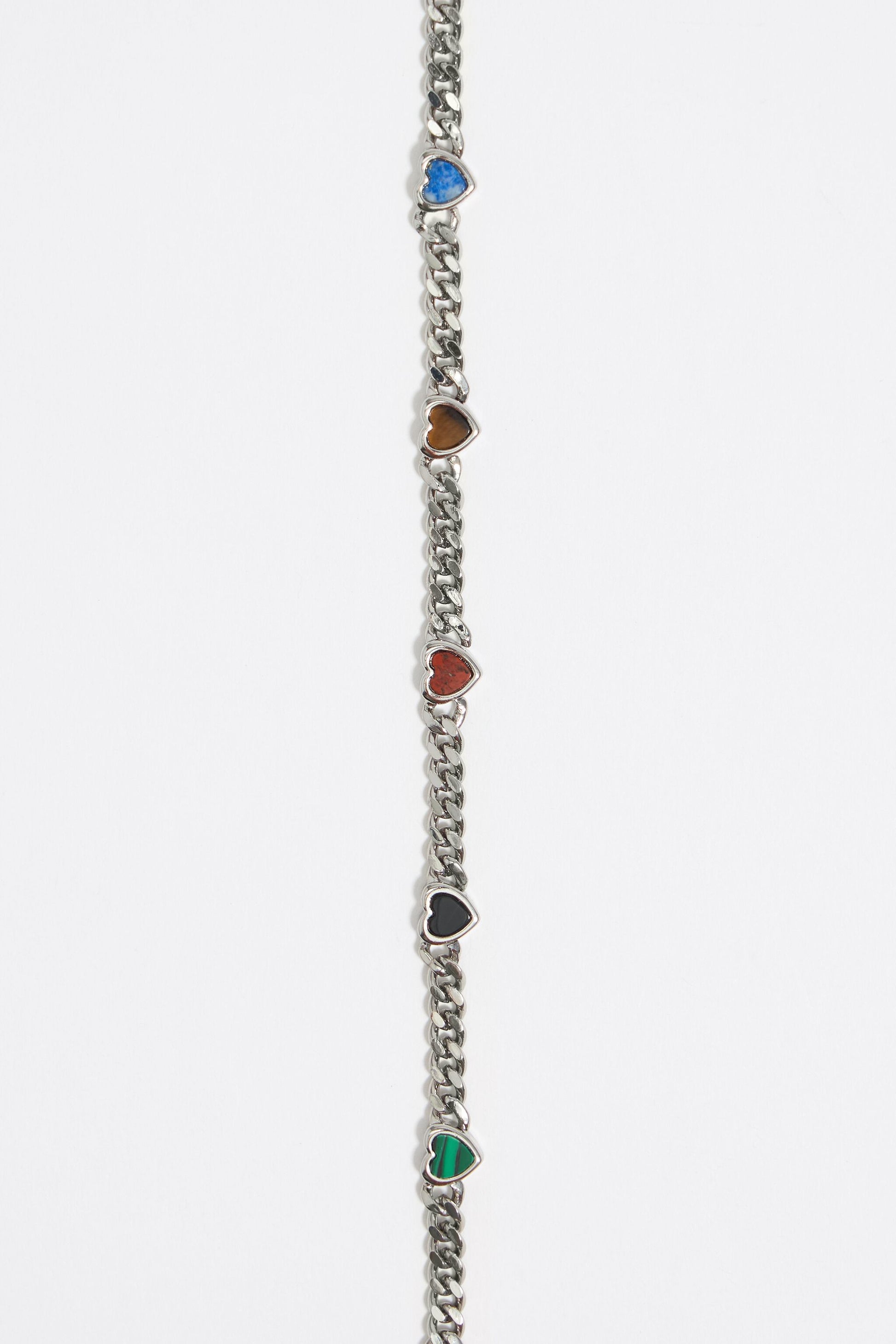 Silver tone metal chain bracelet with black heart-shaped stones. Model customized with engraved logo.