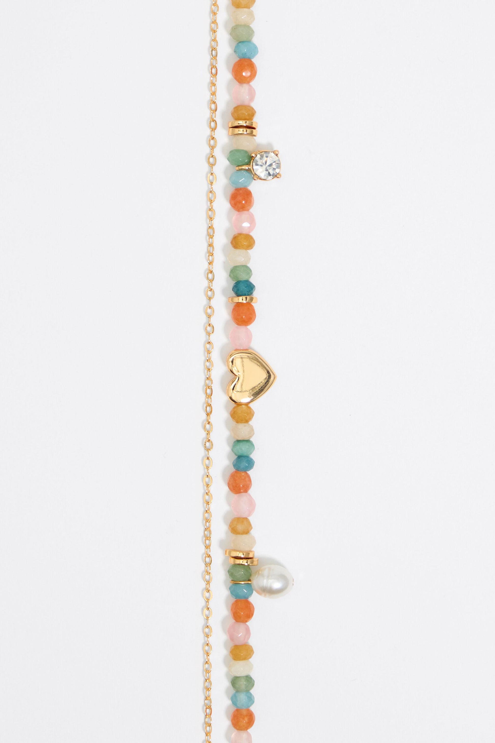 Double-layer necklace with gold chain and multicolor stones with gold heart. Model customized with engraved logo.