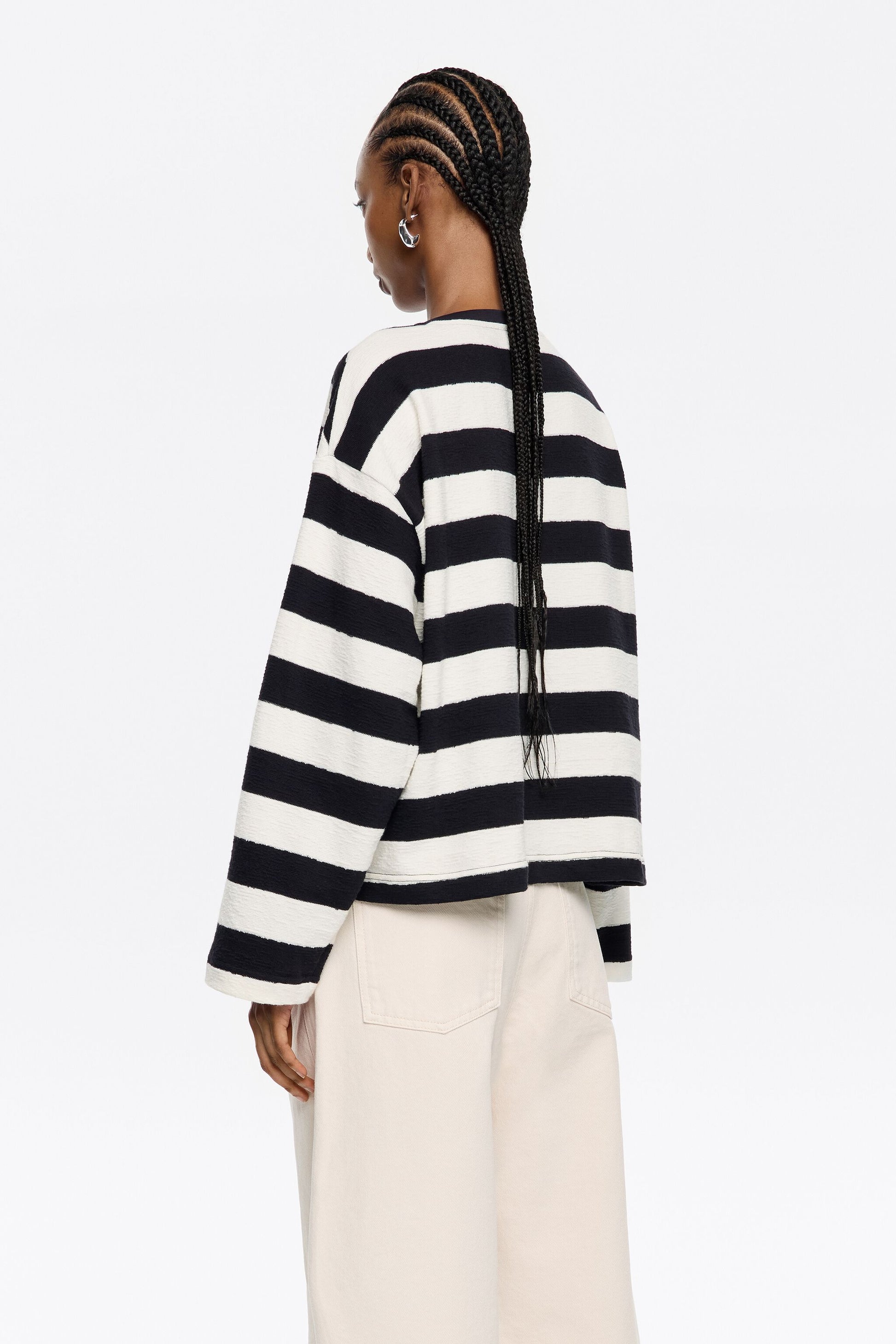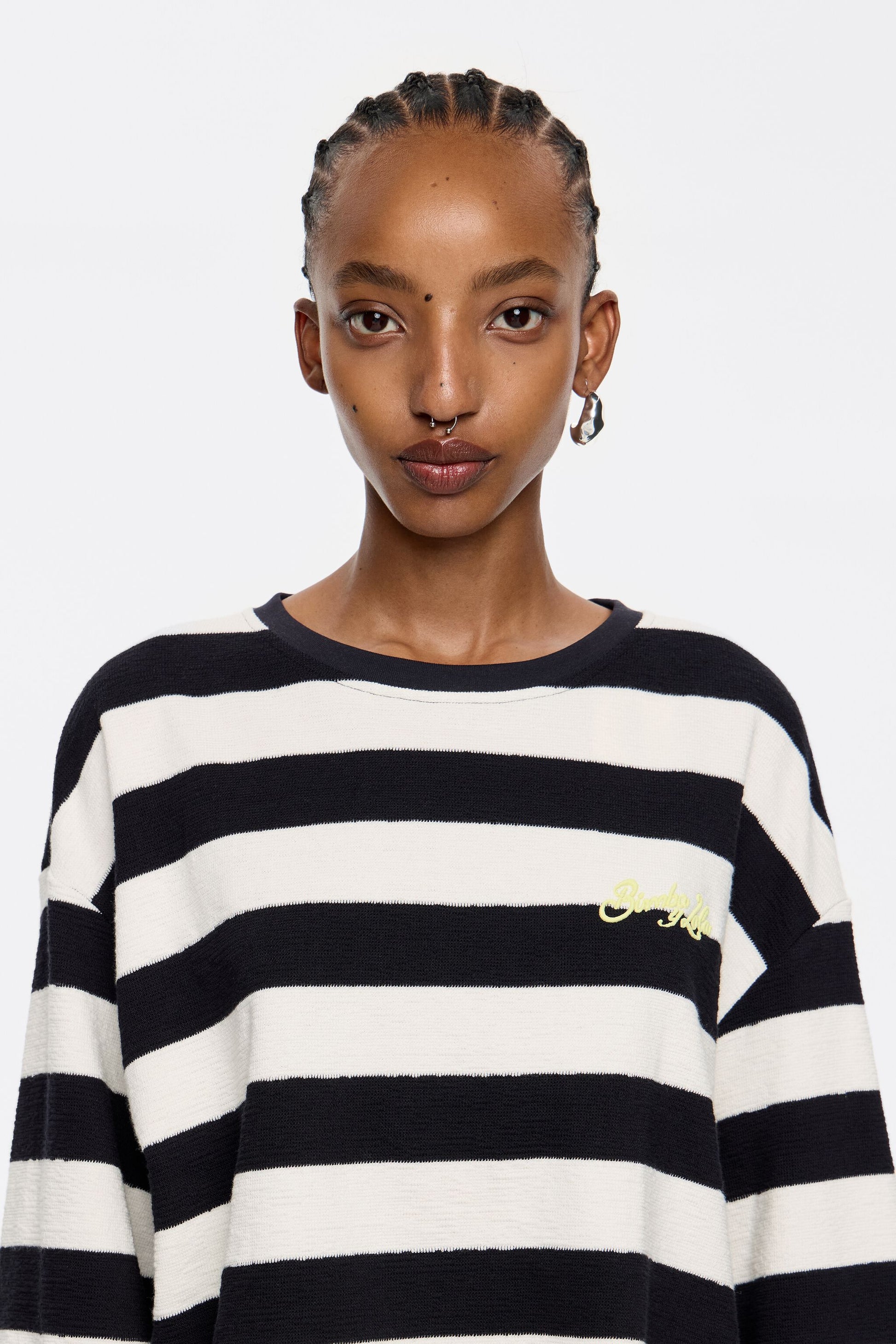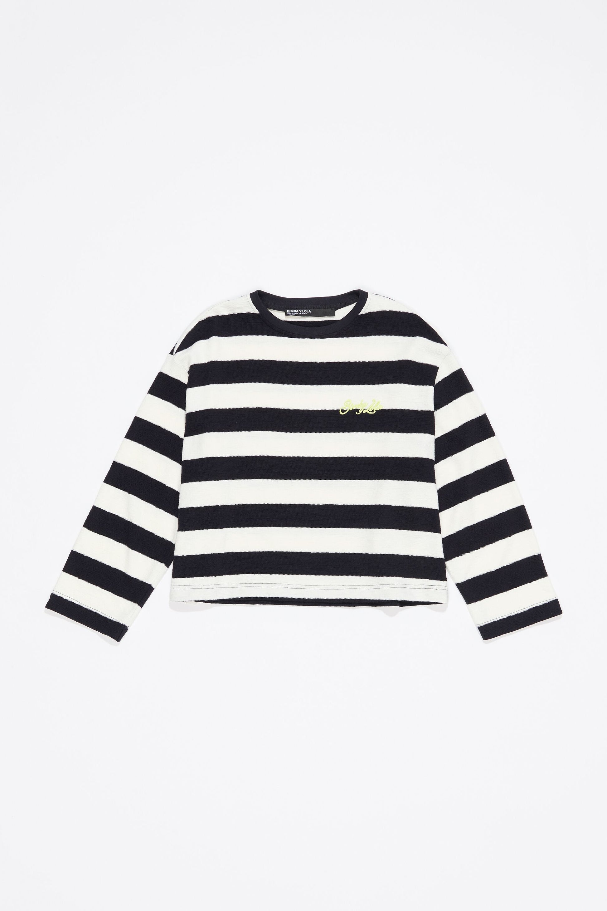 Cotton T-shirt in navy blue with striped print. Straight cut, crew neck with contrast piping, long straight sleeve and exterior customized with embroidered logo.