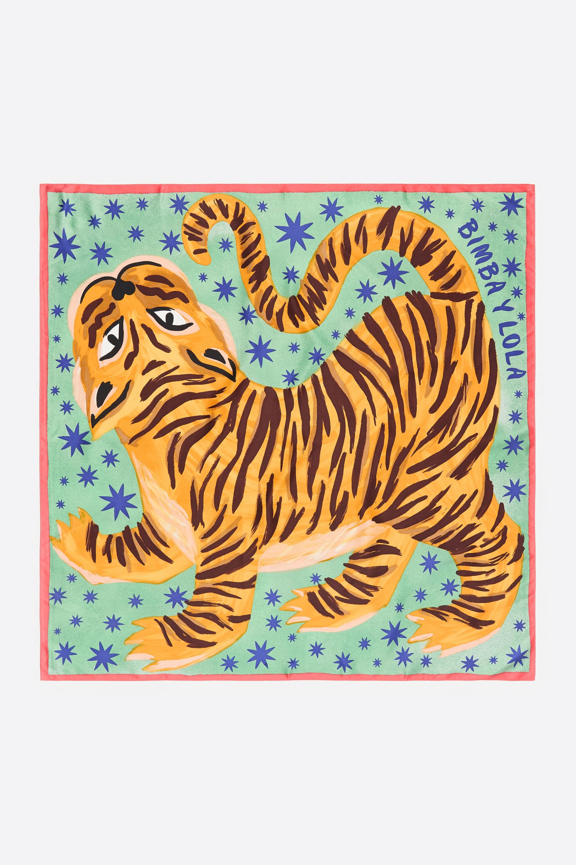 Scarf with tiger sketch print on an ocher background. 100% Recycled polyester.