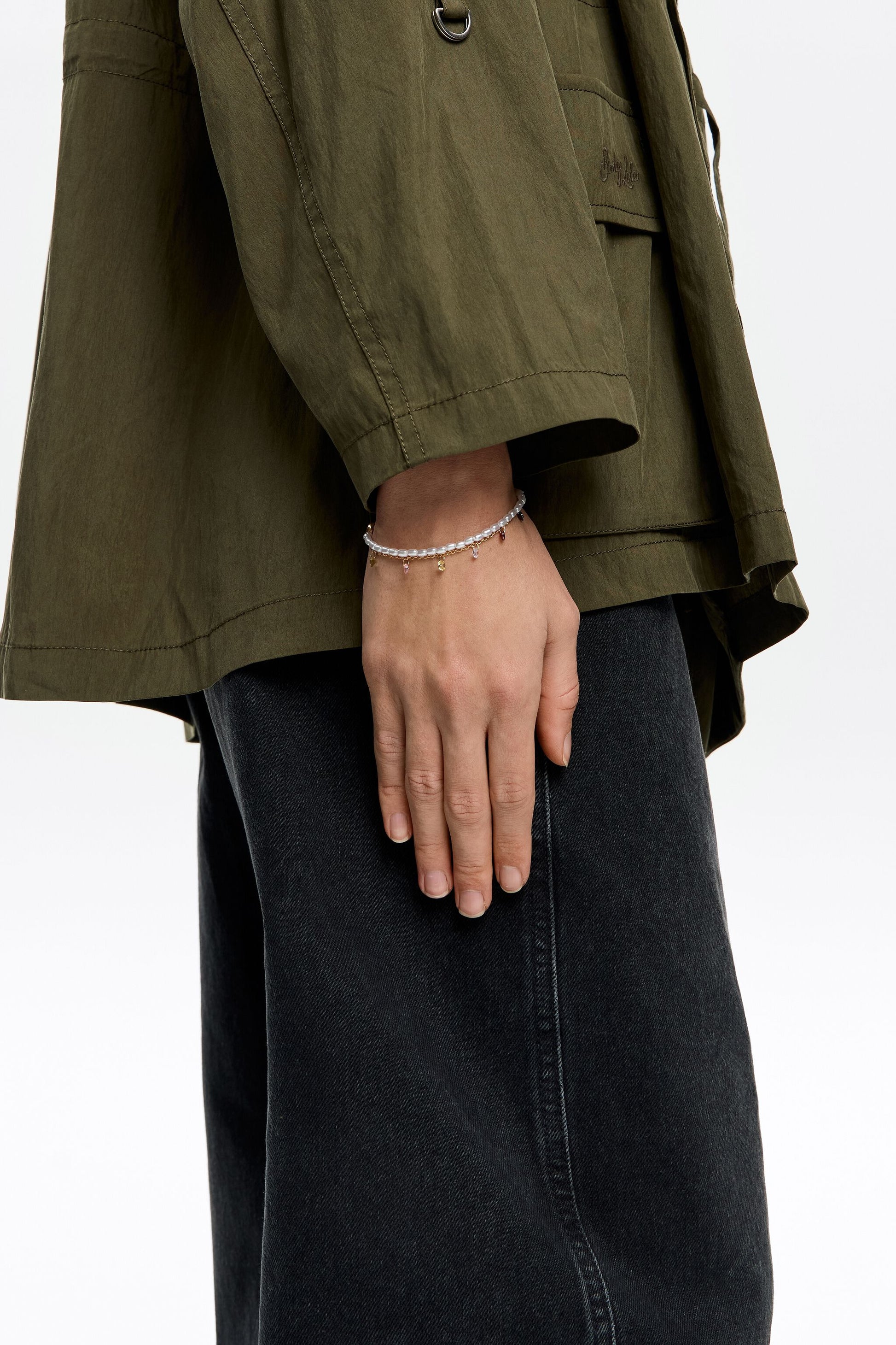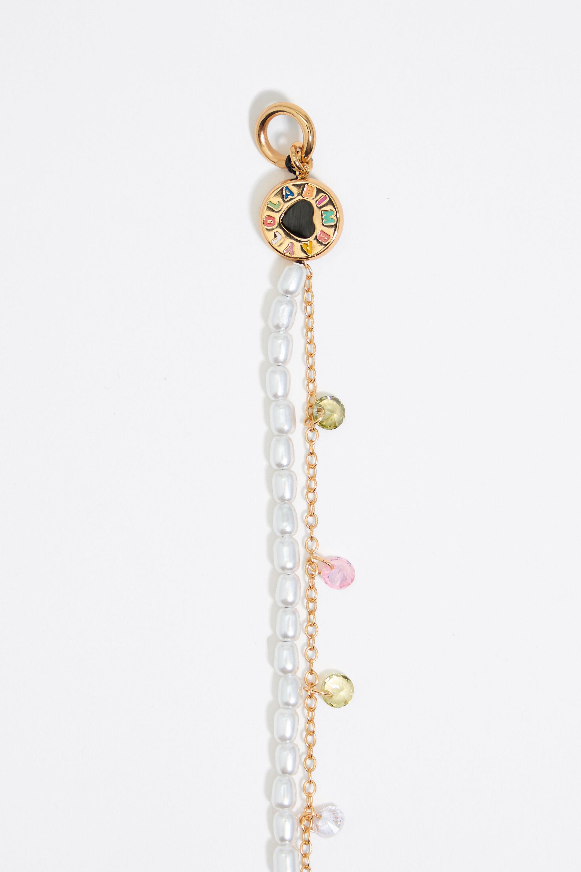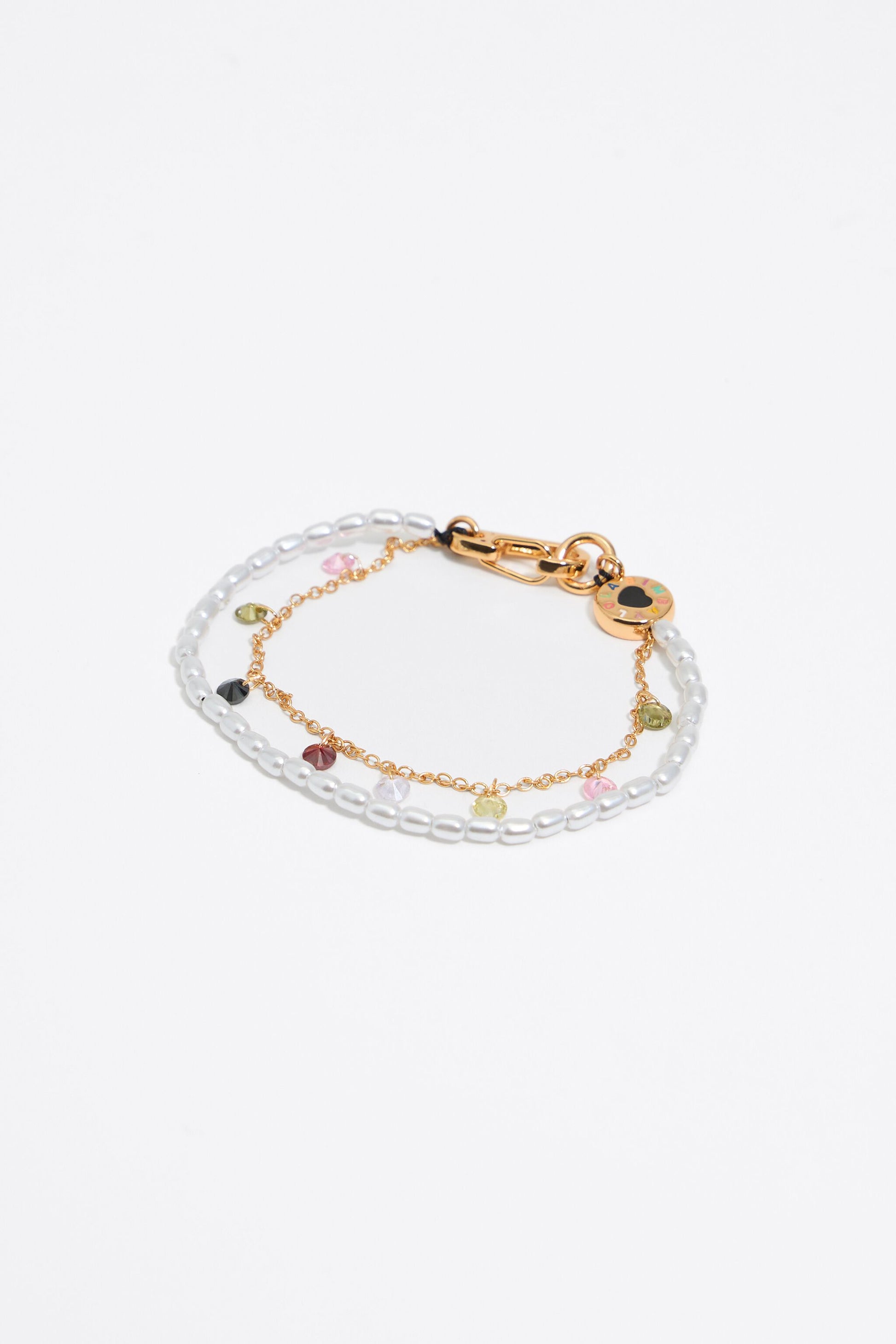 Double-layer bracelet with pearls and gold chain with crystals. Model customized with engraved logo.
