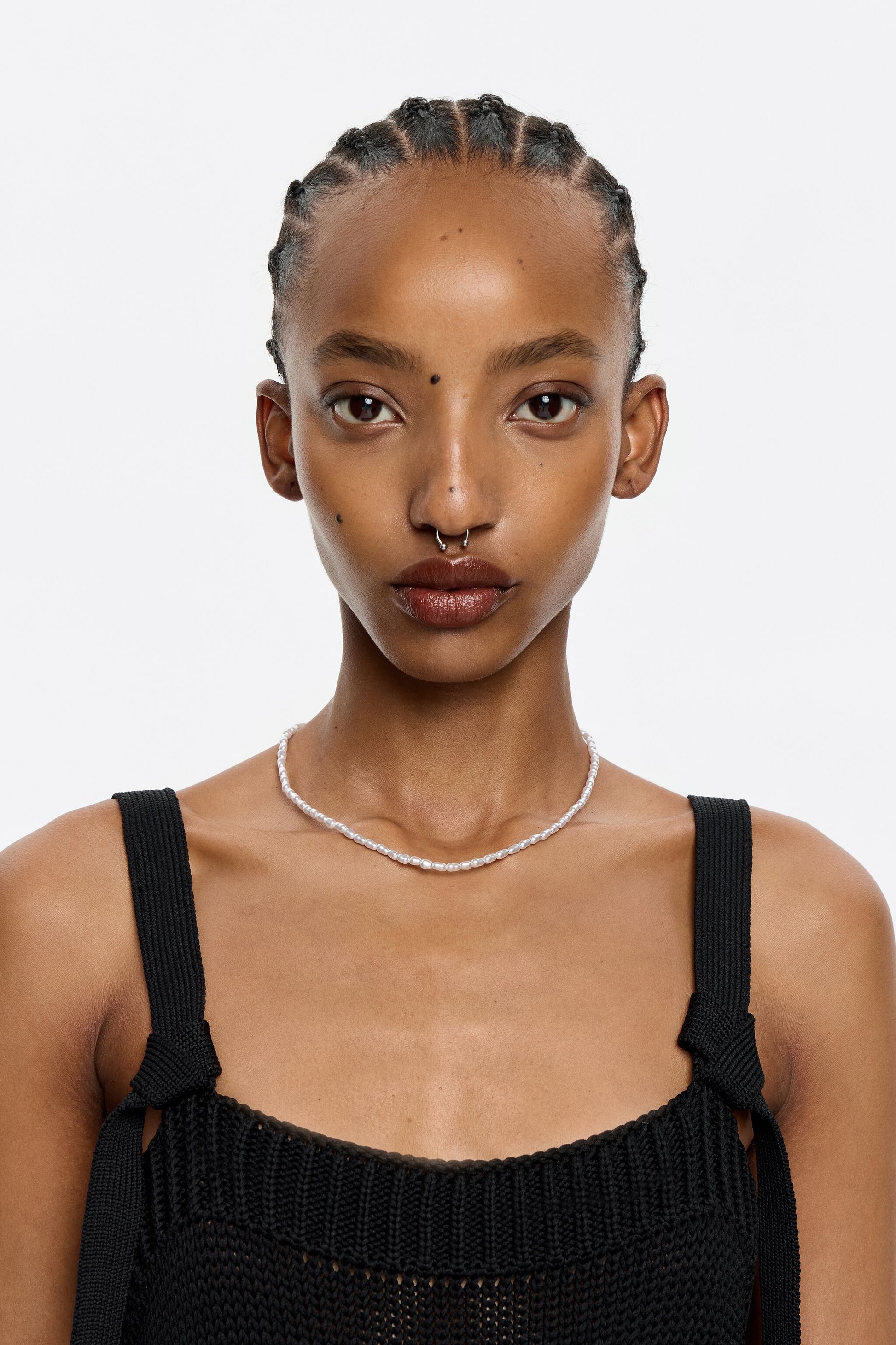 Necklace with pearls and gold logo heart. Model customized with engraved logo.