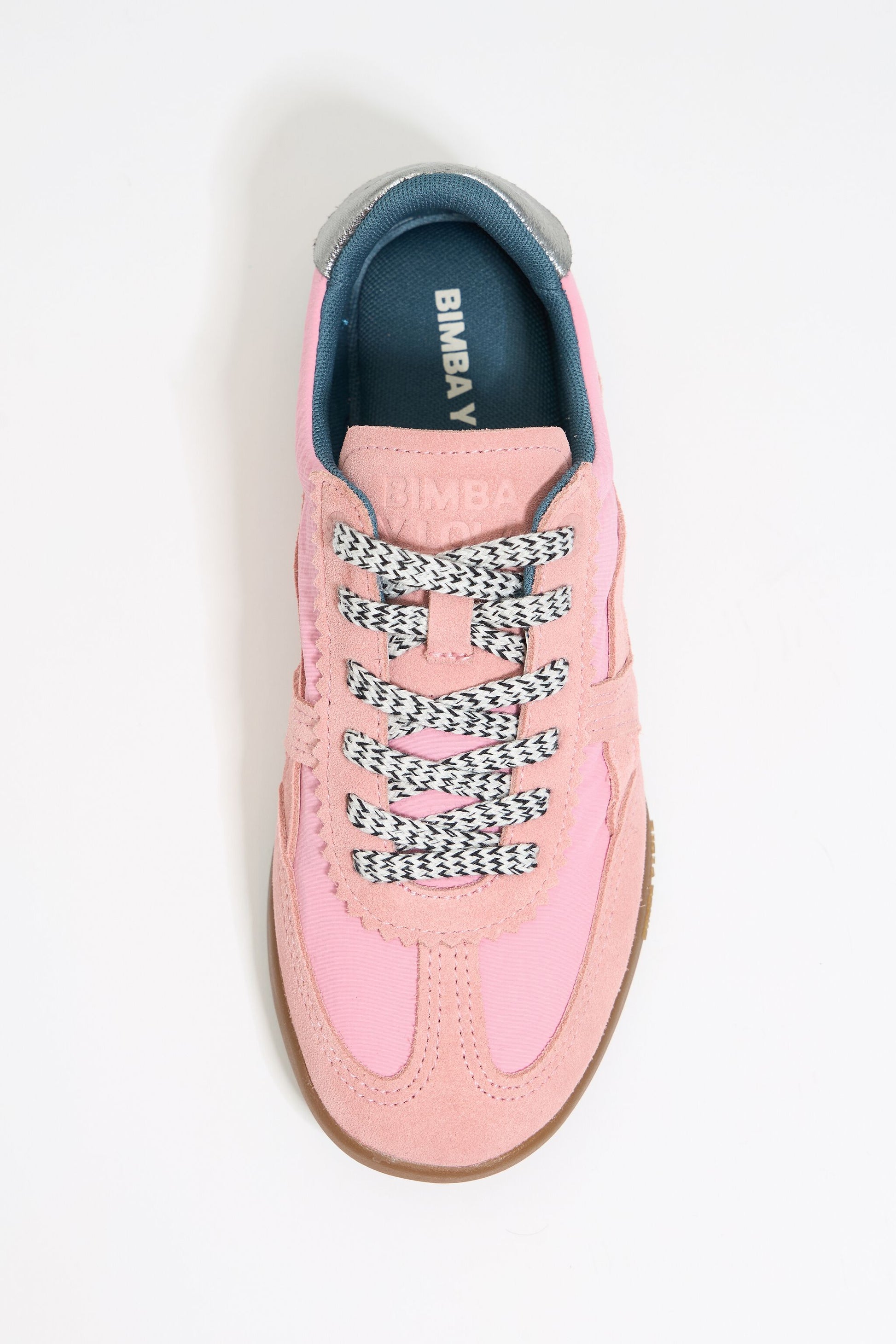 Indoor sneaker in pink. Model with split leather and leather pieces, combined with technical fabrics. Scalloped upper, split leather side logo, logo tongue and contrast engraved logo on the back. Sole and insole customized with logo.
