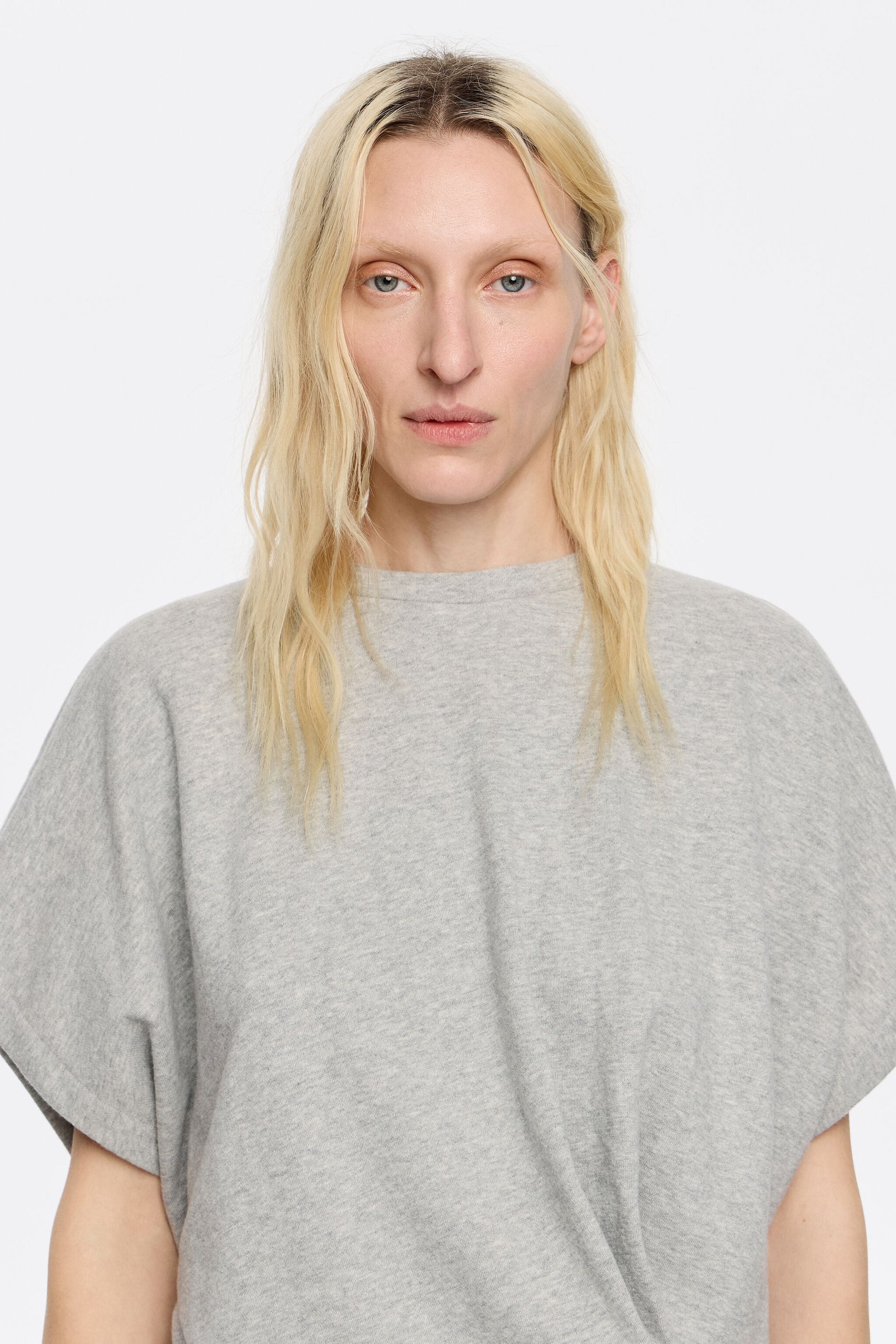Midi two-material sweatshirt dress with Animalspots print in red. Fitted at the hip, with a crew neck, short batwing sleeves and pleats at the front and back. Flared fluid skirt with slit.