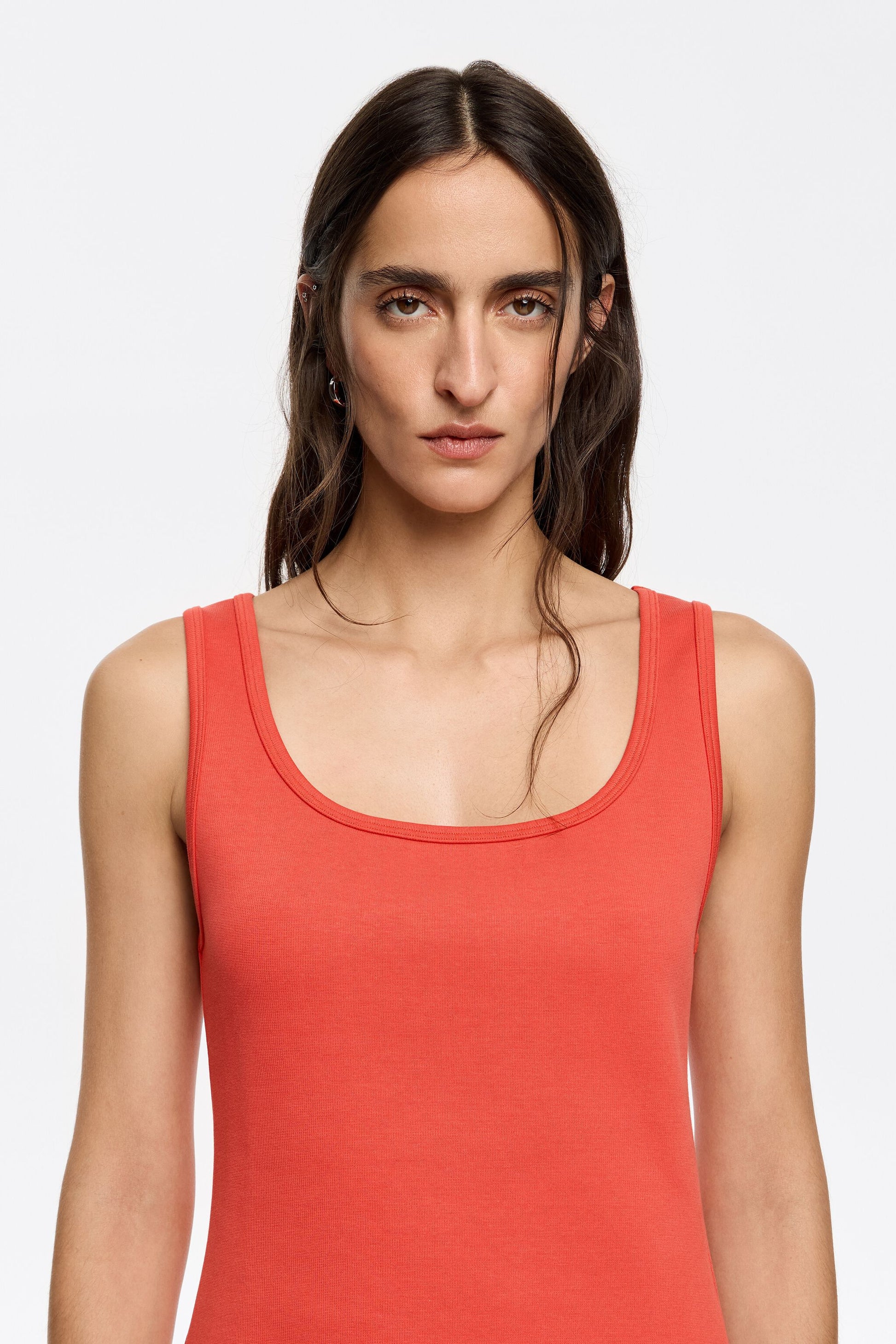Red fitted top with square neckline