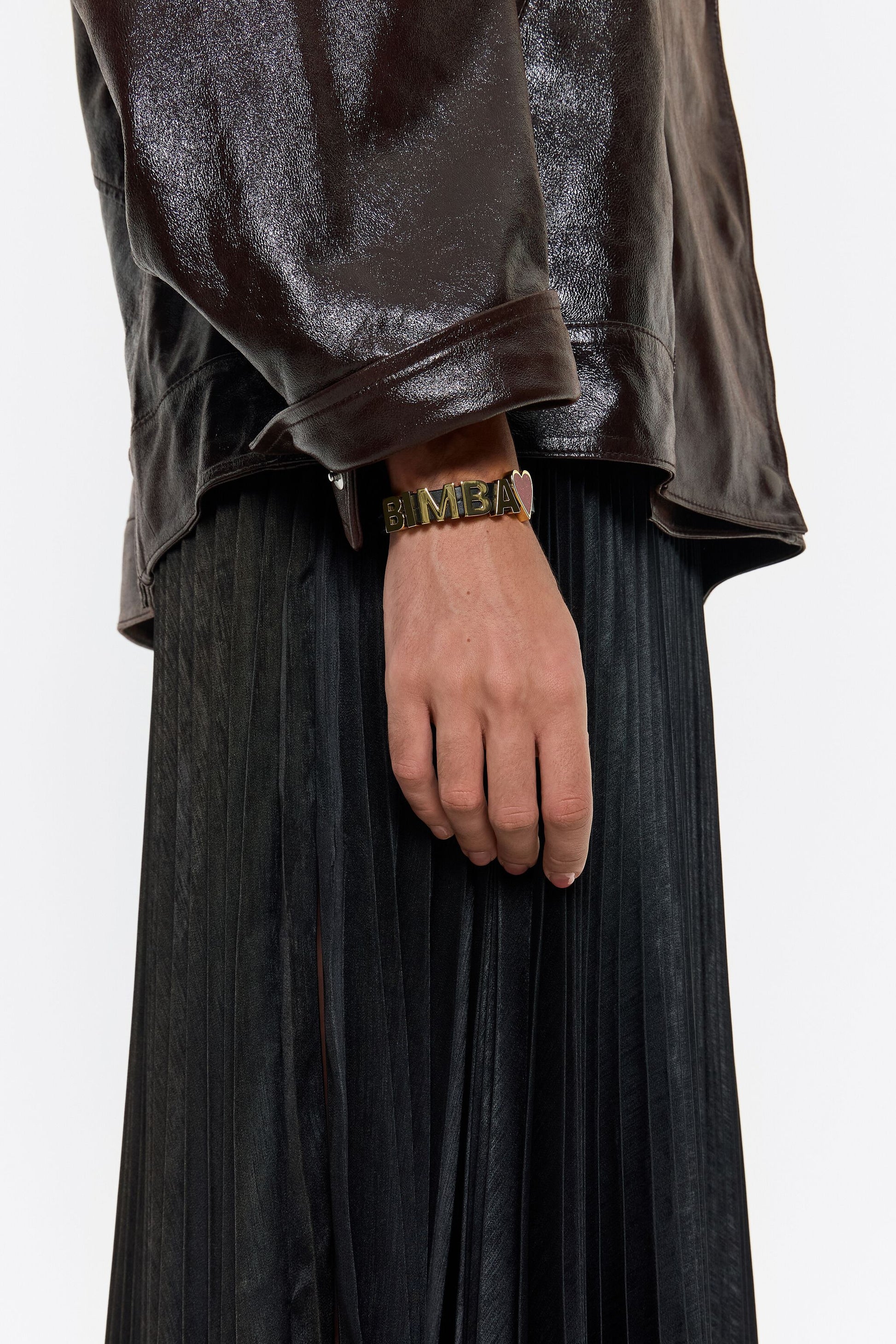 Black strap bracelet with logo letters in gold and heart in red glitter.