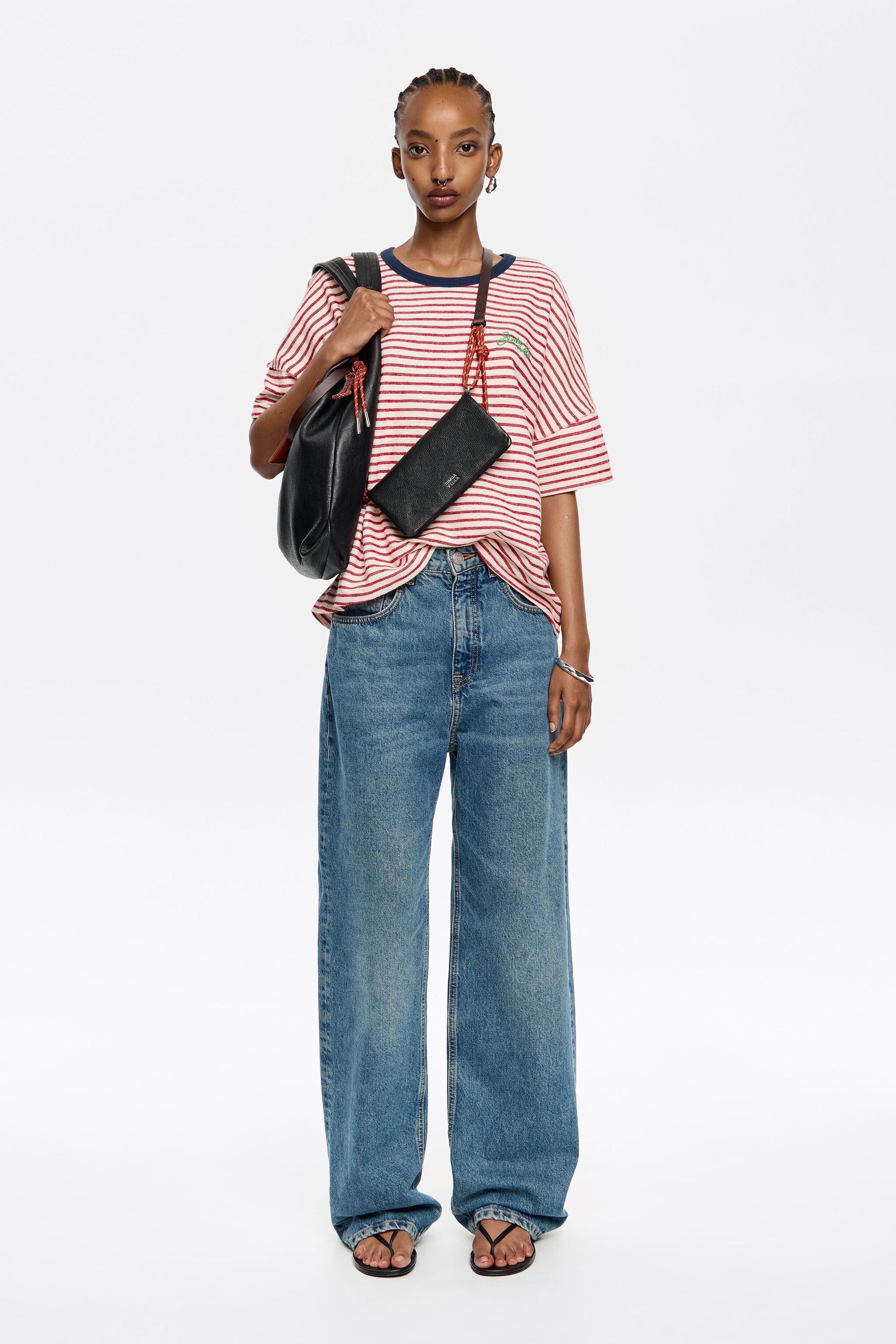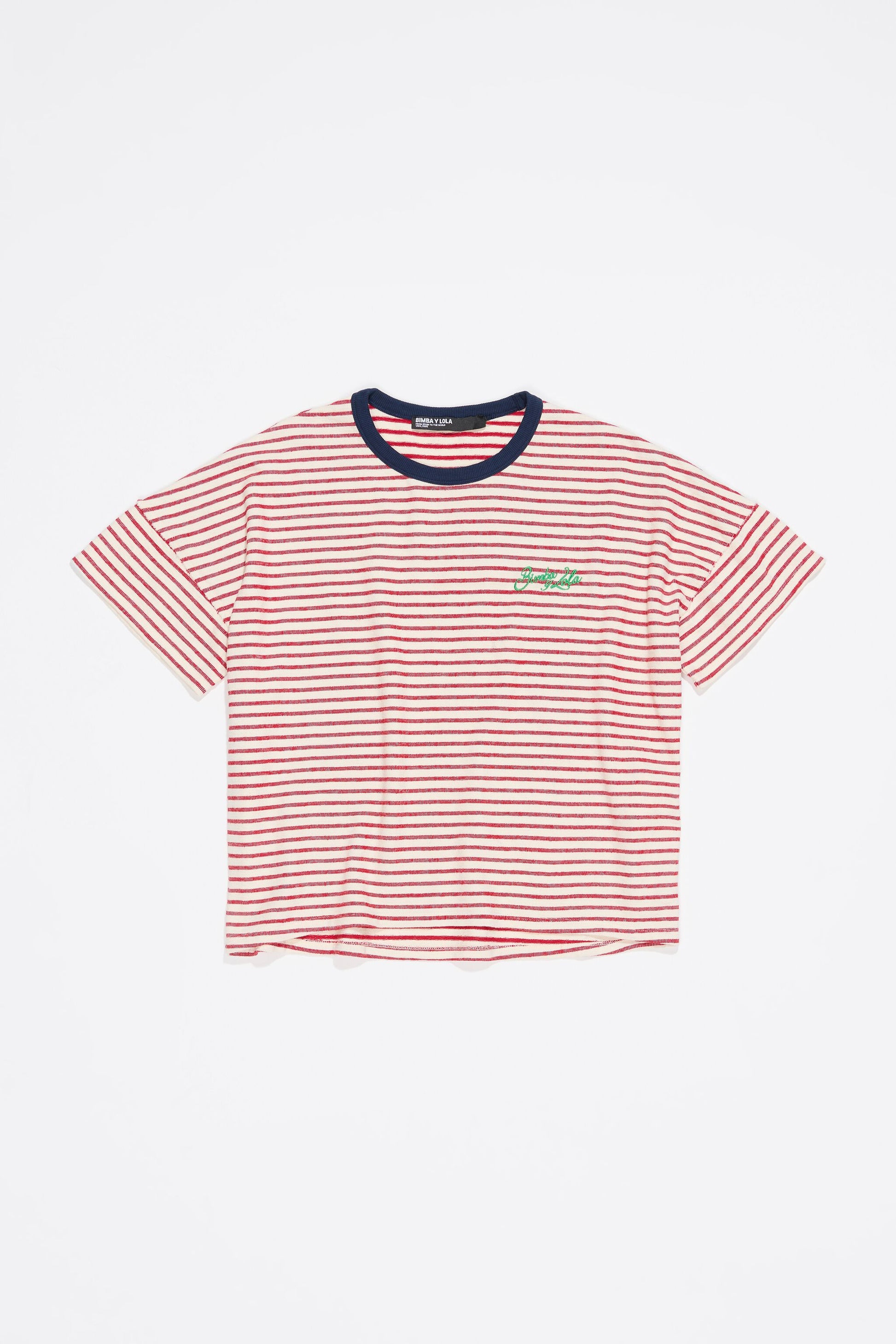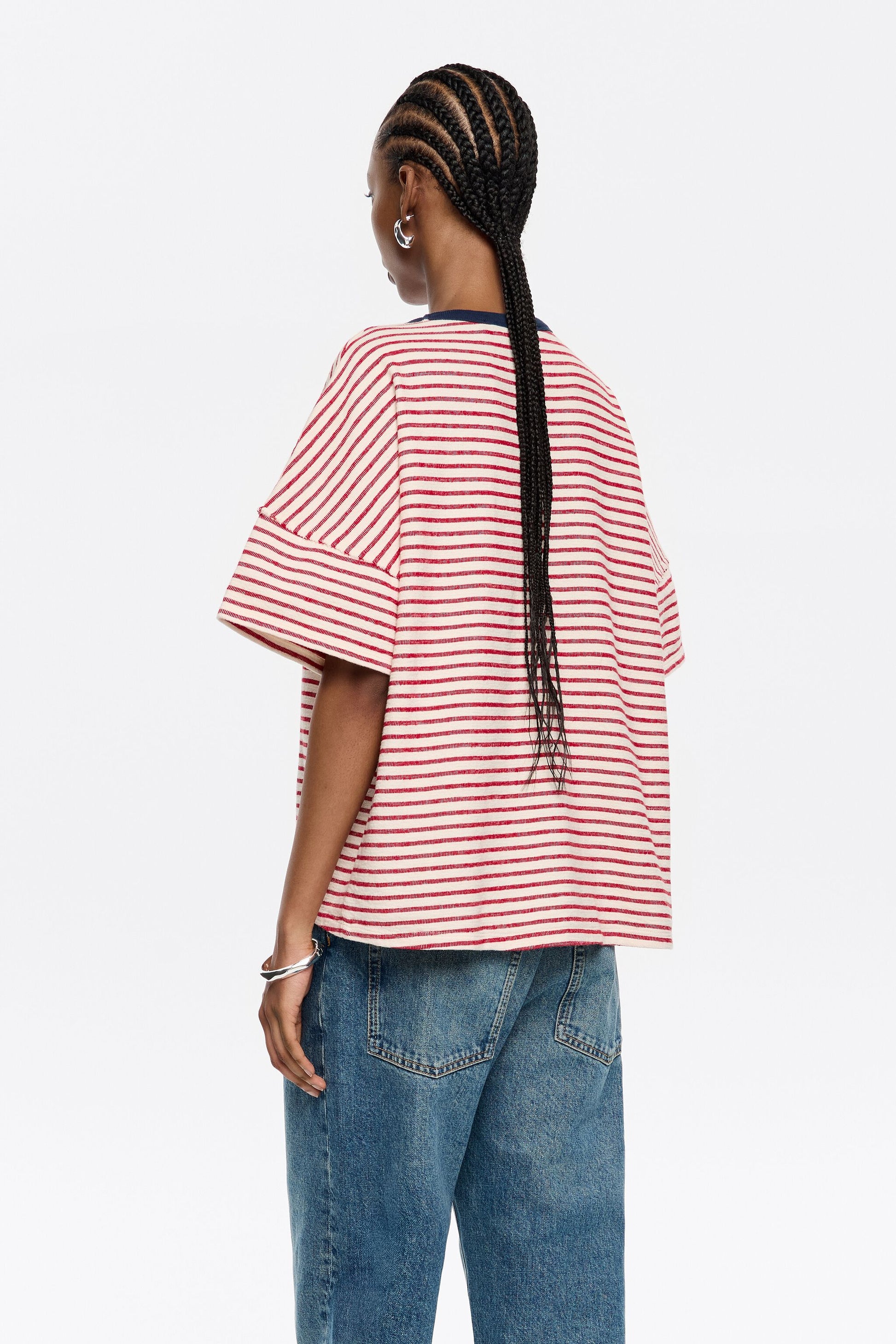 Striped print cotton T-shirt in red. Boxy cut, crew neck with contrast piping, short straight sleeve and exterior customized with embroidered logo. This model contains 100% organic cotton.