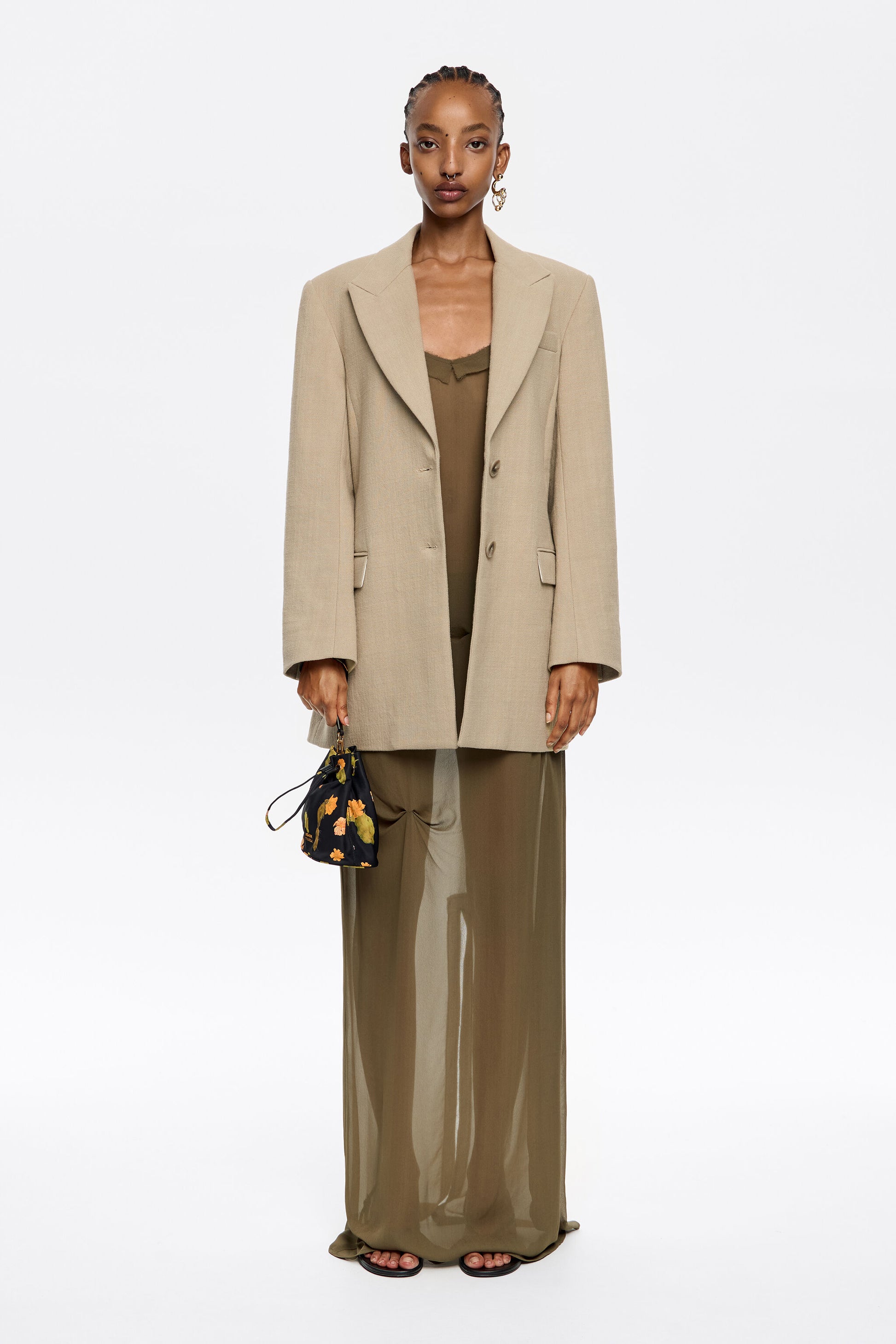 Long tailored double-breasted jacket in sand. With fitted waist, lapel neckline, long sleeve and button-up front. Flap pockets.