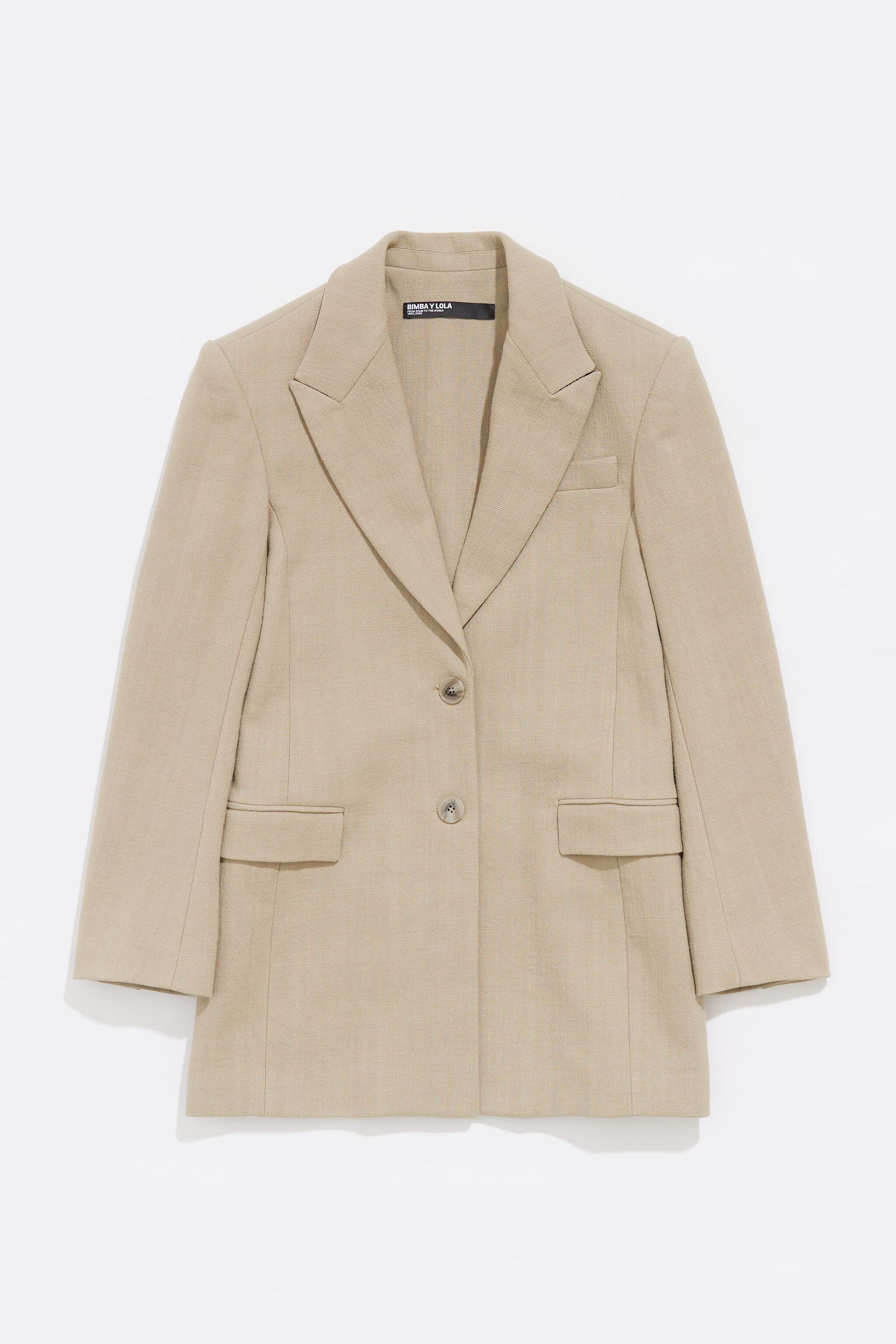 Long tailored double-breasted jacket in sand. With fitted waist, lapel neckline, long sleeve and button-up front. Flap pockets.