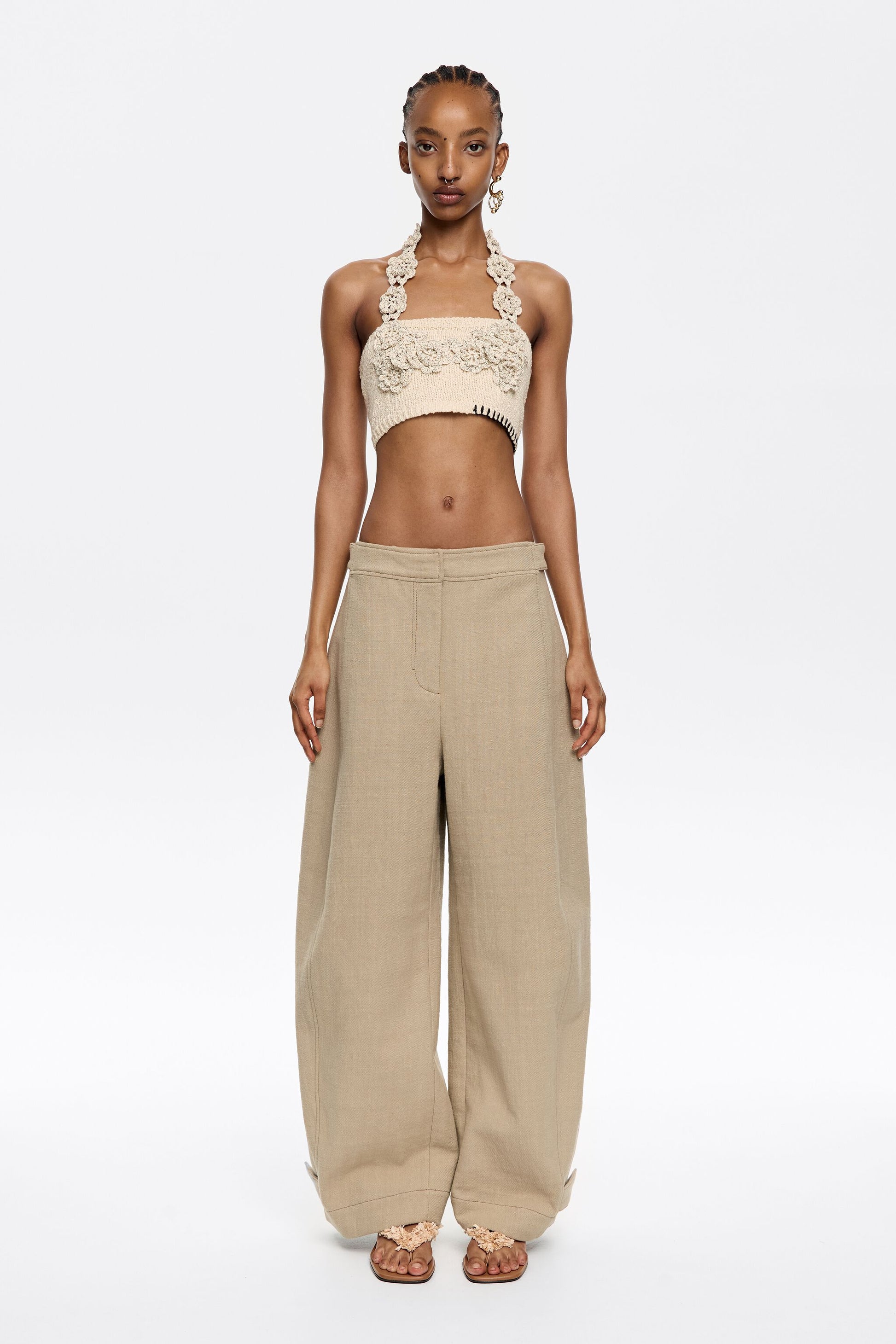 Fluid trousers in sand. Straight-cut model with zip fastener.