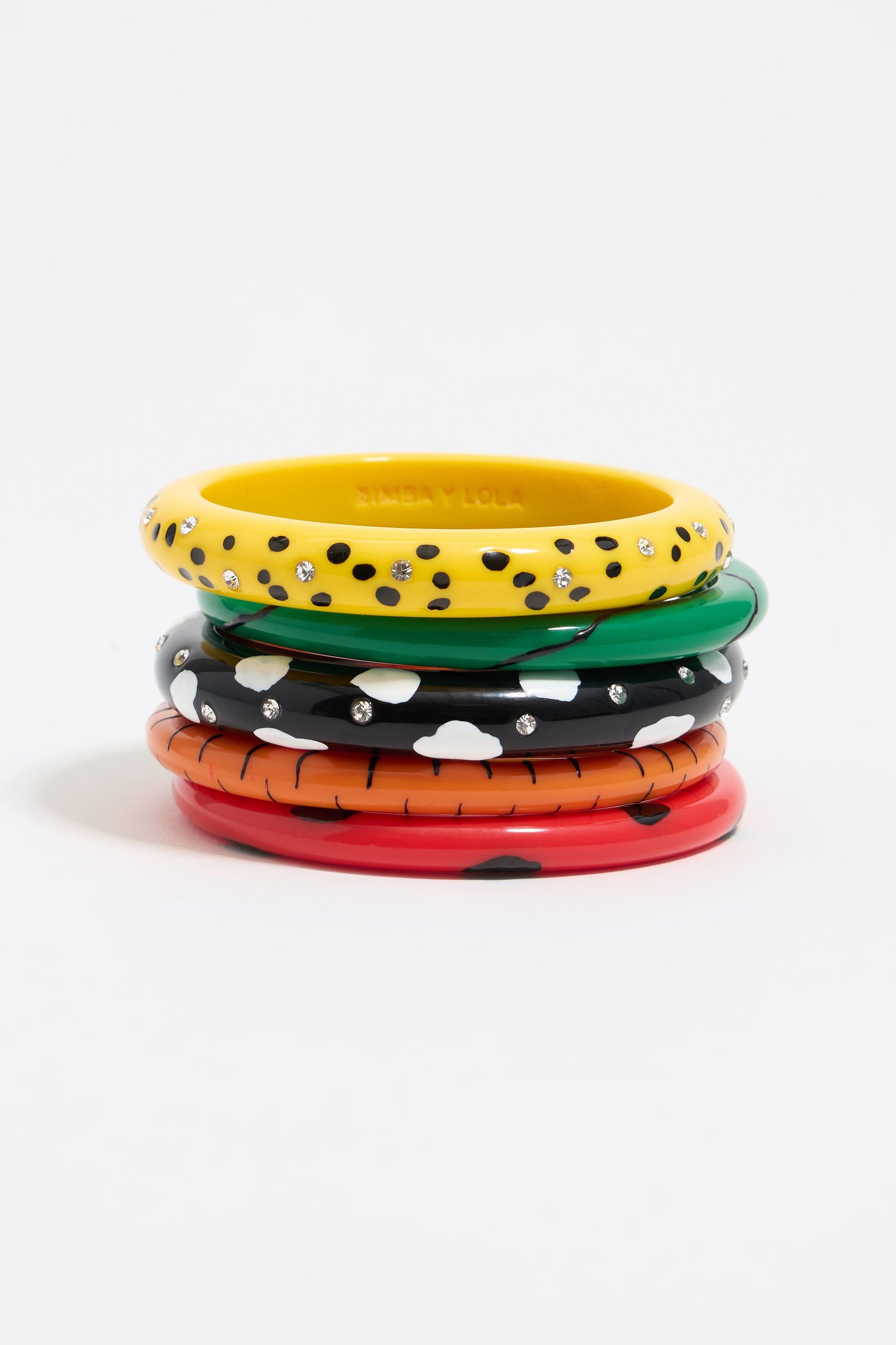 Set of five bracelets with a multicolor animal print. Model customized with engraved logo.