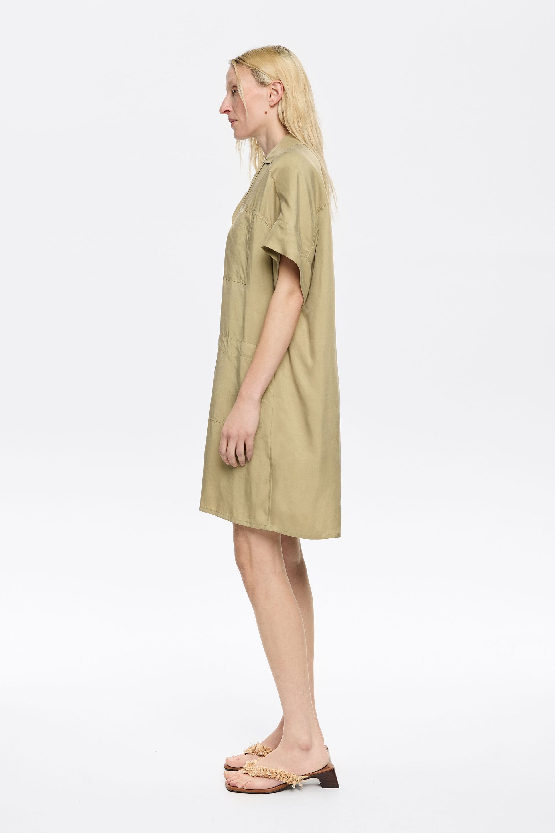 Short Lyocell dress in light khaki. Oversize cut, with shirt collar, short sleeve and front pockets.